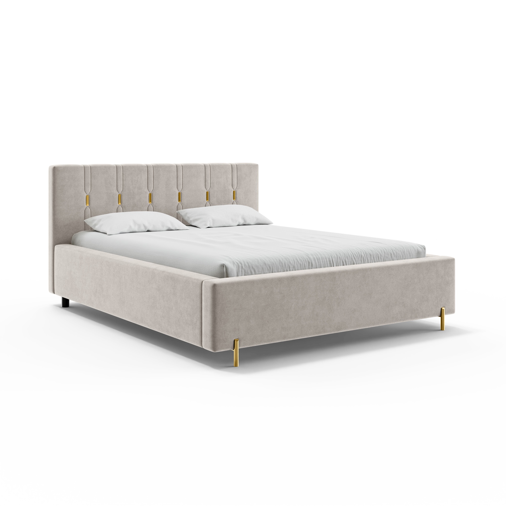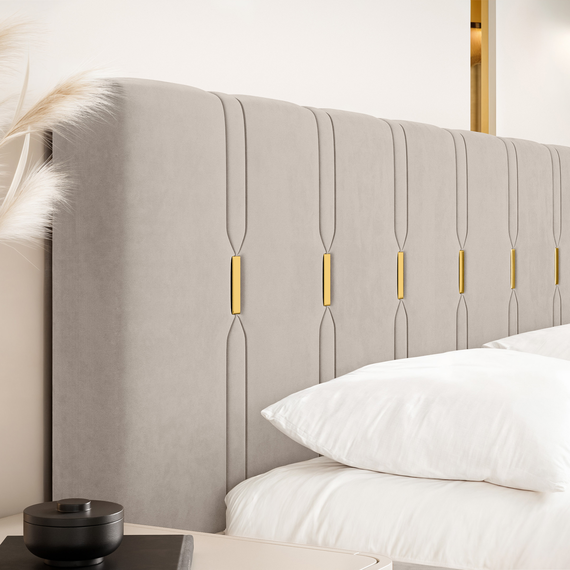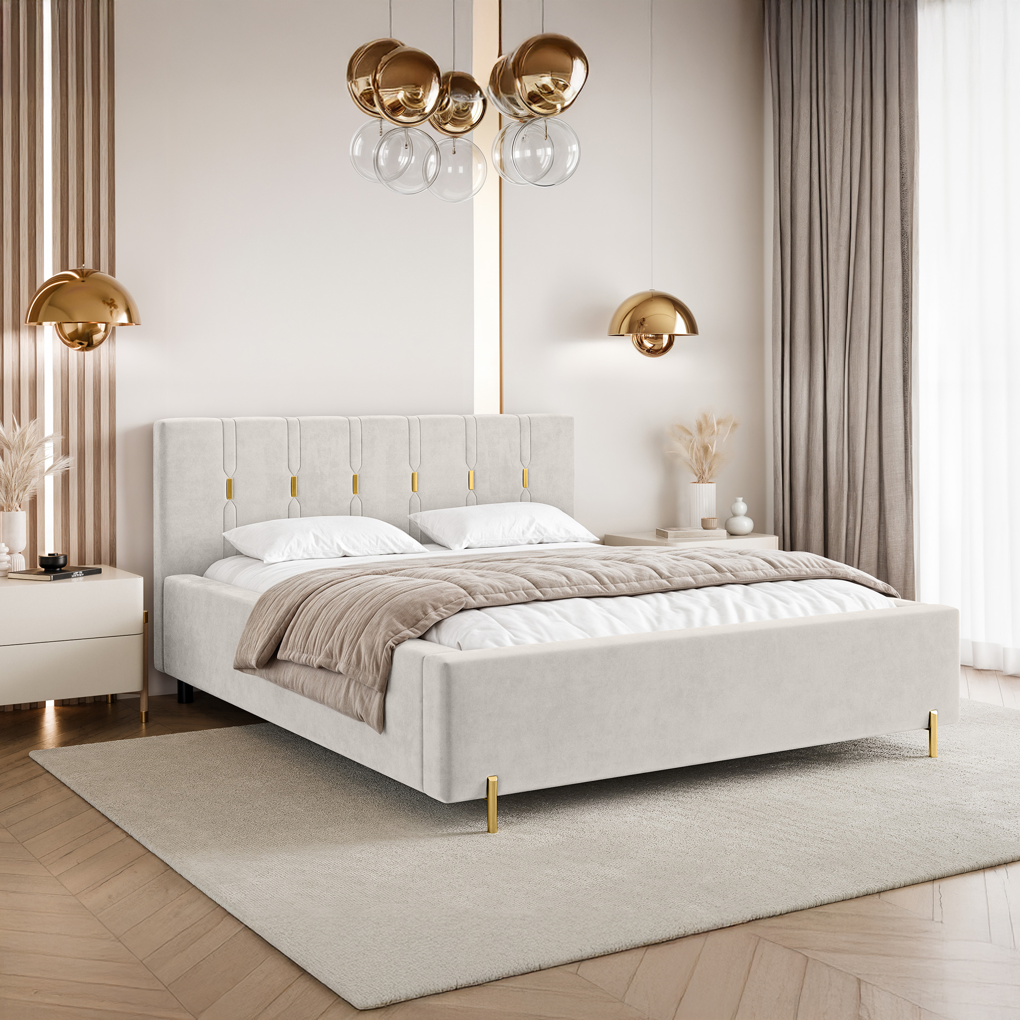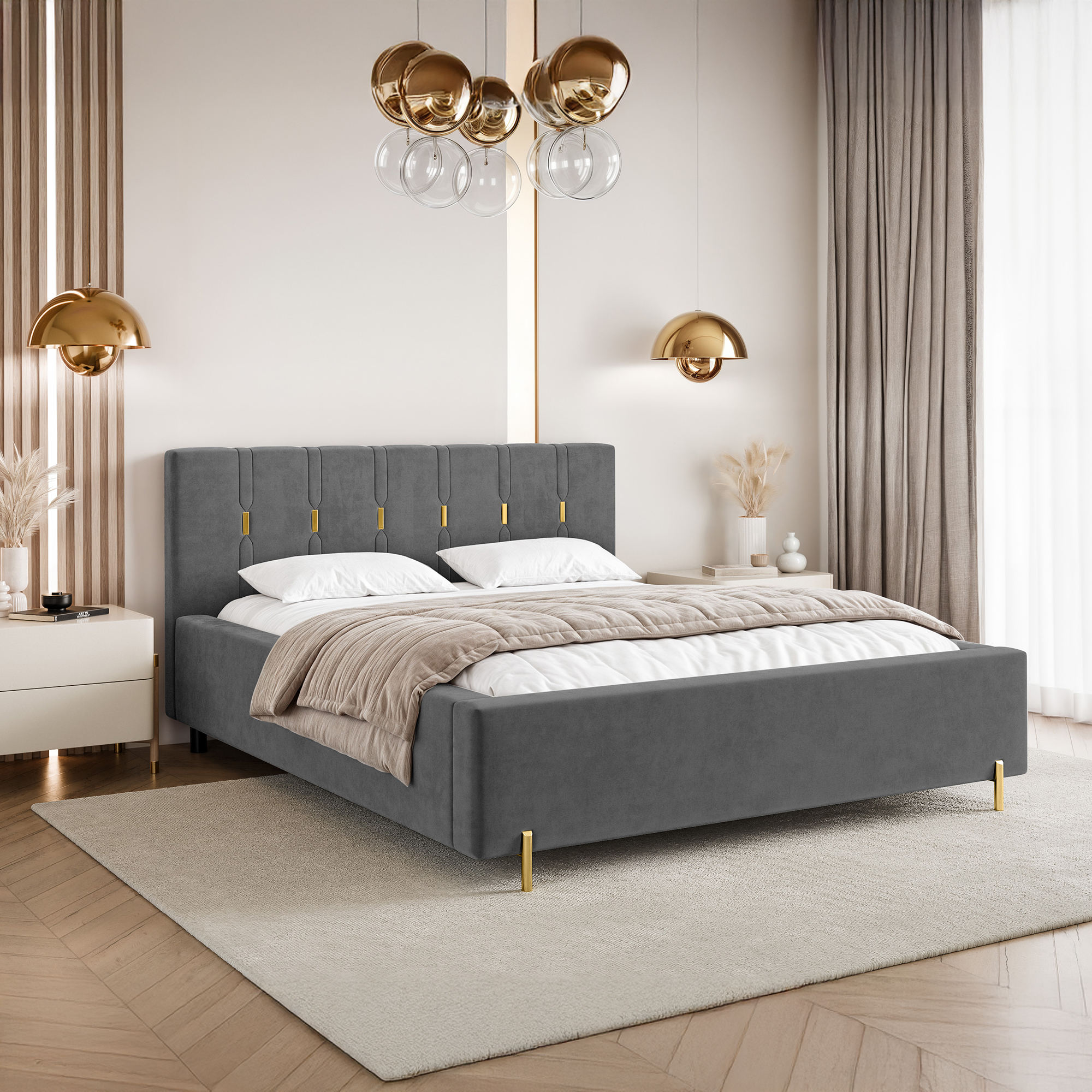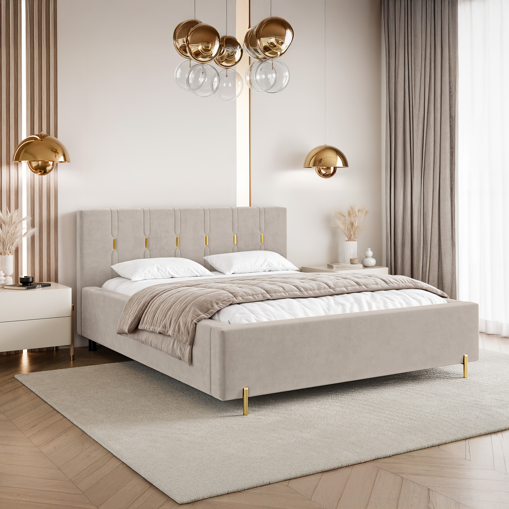 Eleganckie łóżko tapicerowane SABI z pionowymi przeszyciami, to doskonałe połączenie nowoczesnego stylu i subtelnego luksusu. Dekoracyjny zagłówek przyciąga uwagę dzięki wyraźnym, pionowym liniom podkreślonym złotymi akcentami, które nadają całości wyjątkowej głębi i szyku. To idealny wybór do wnętrz, w których liczy się efektowny, ale wciąż harmonijny design.