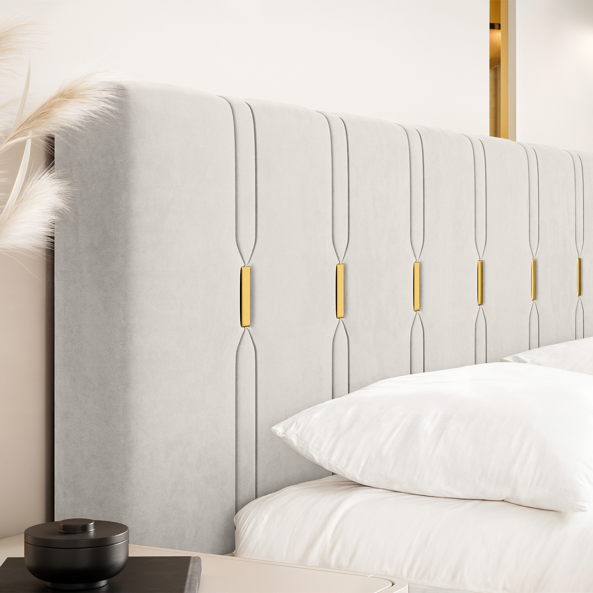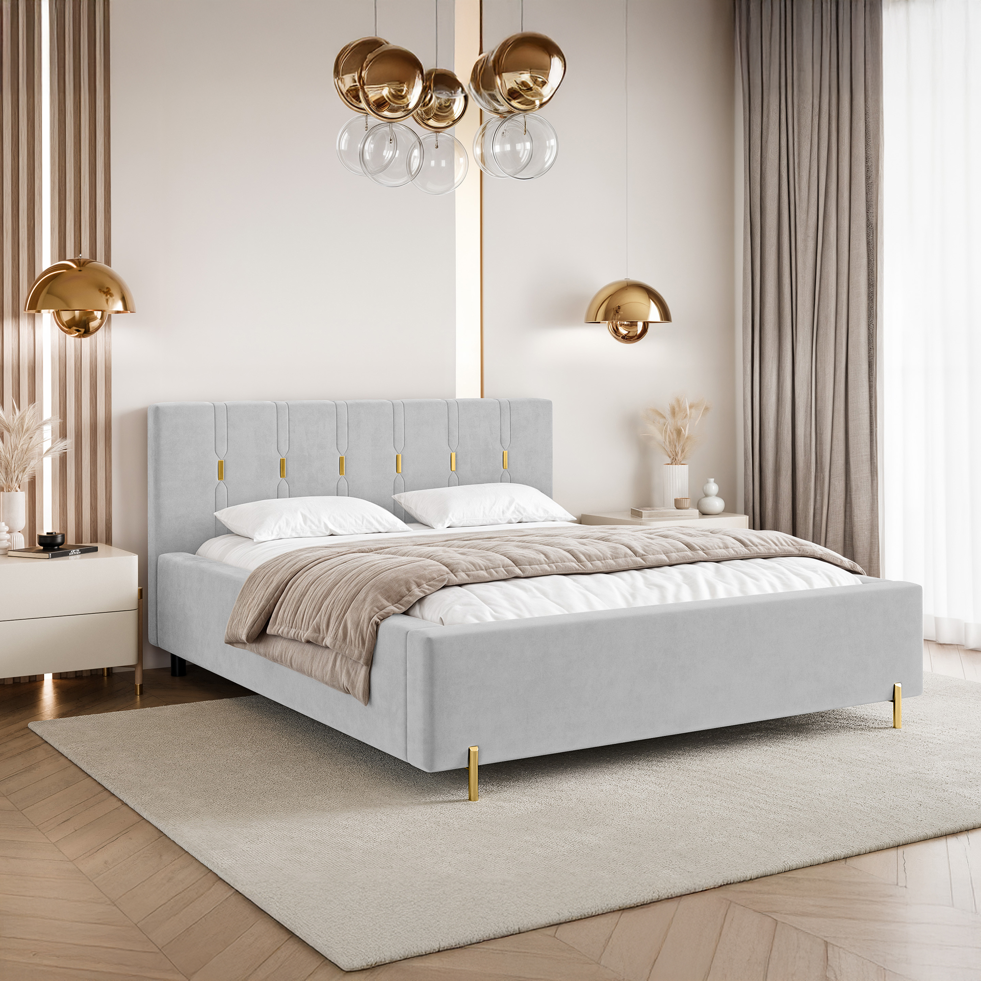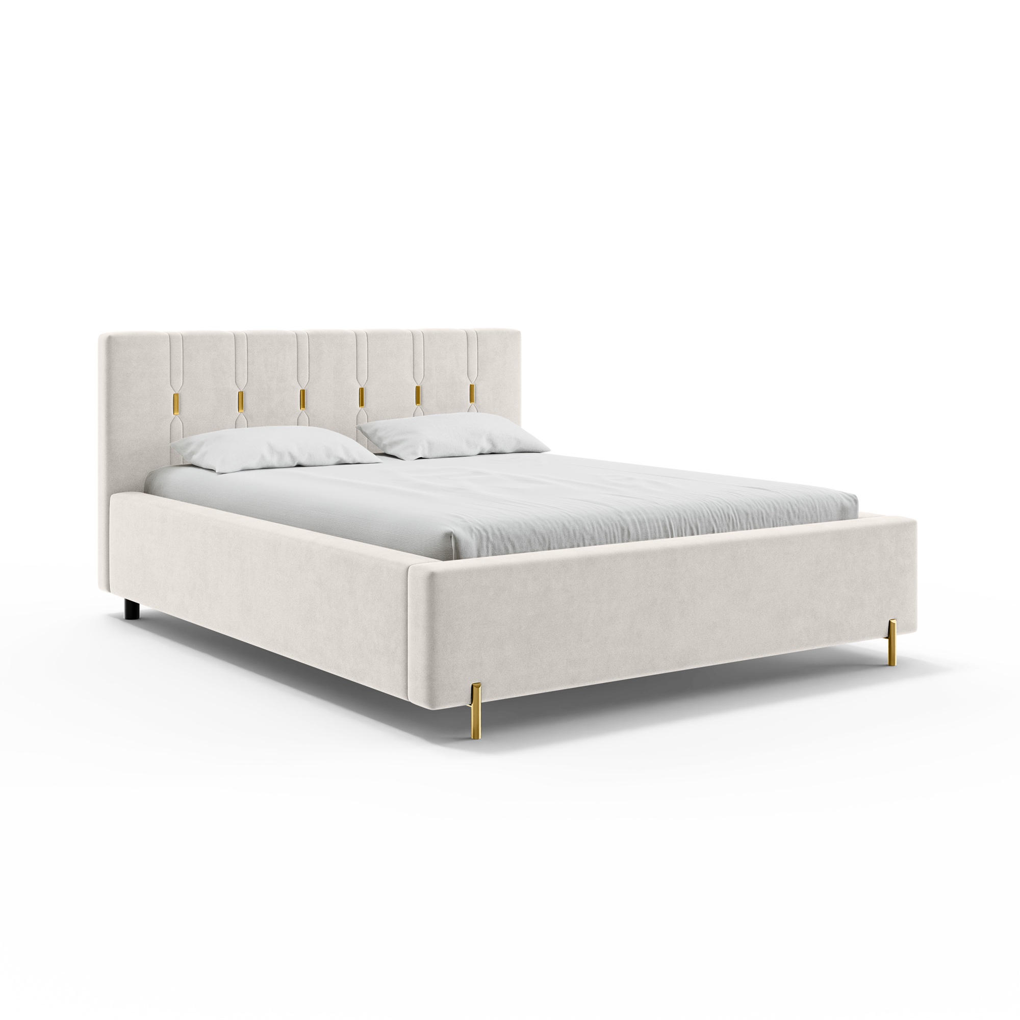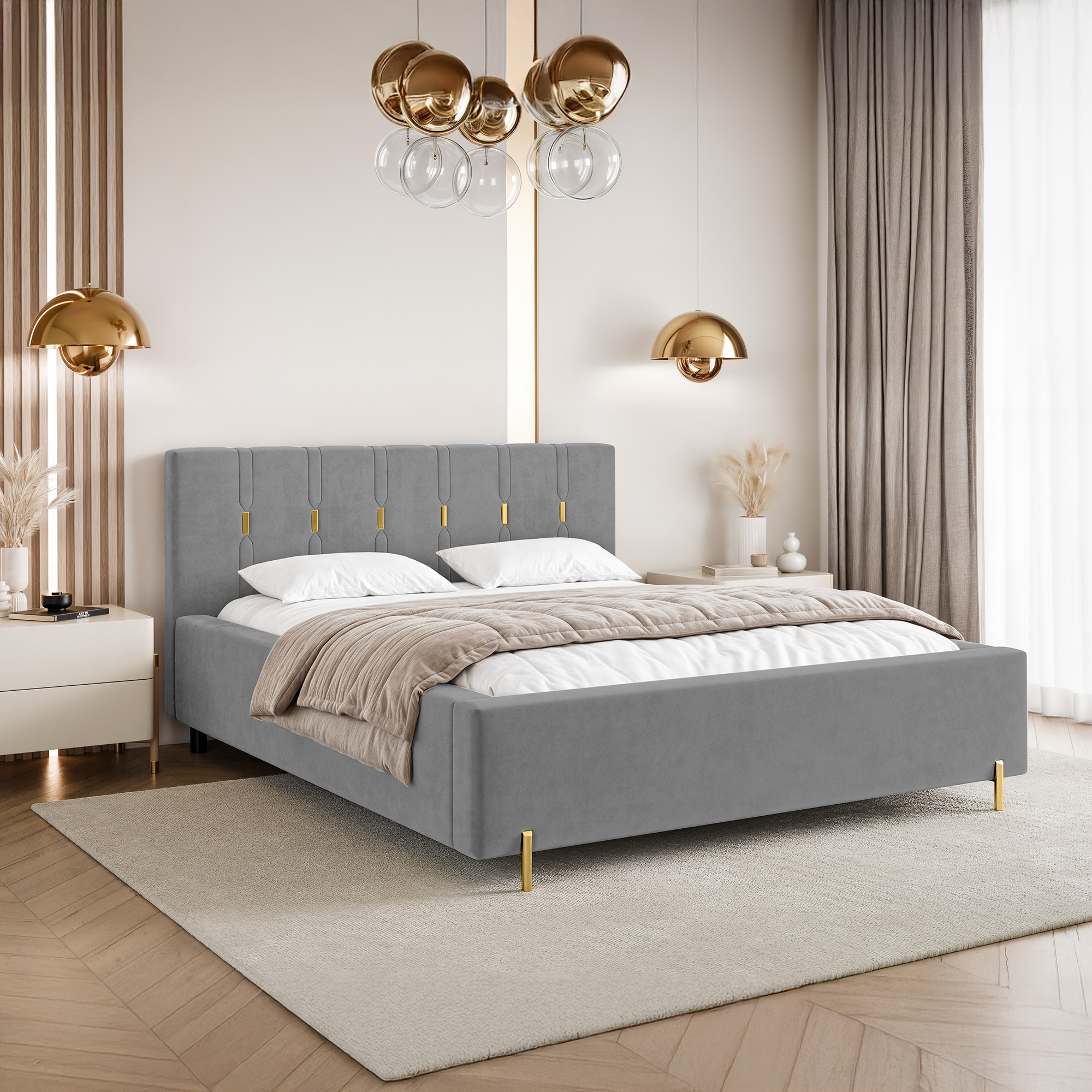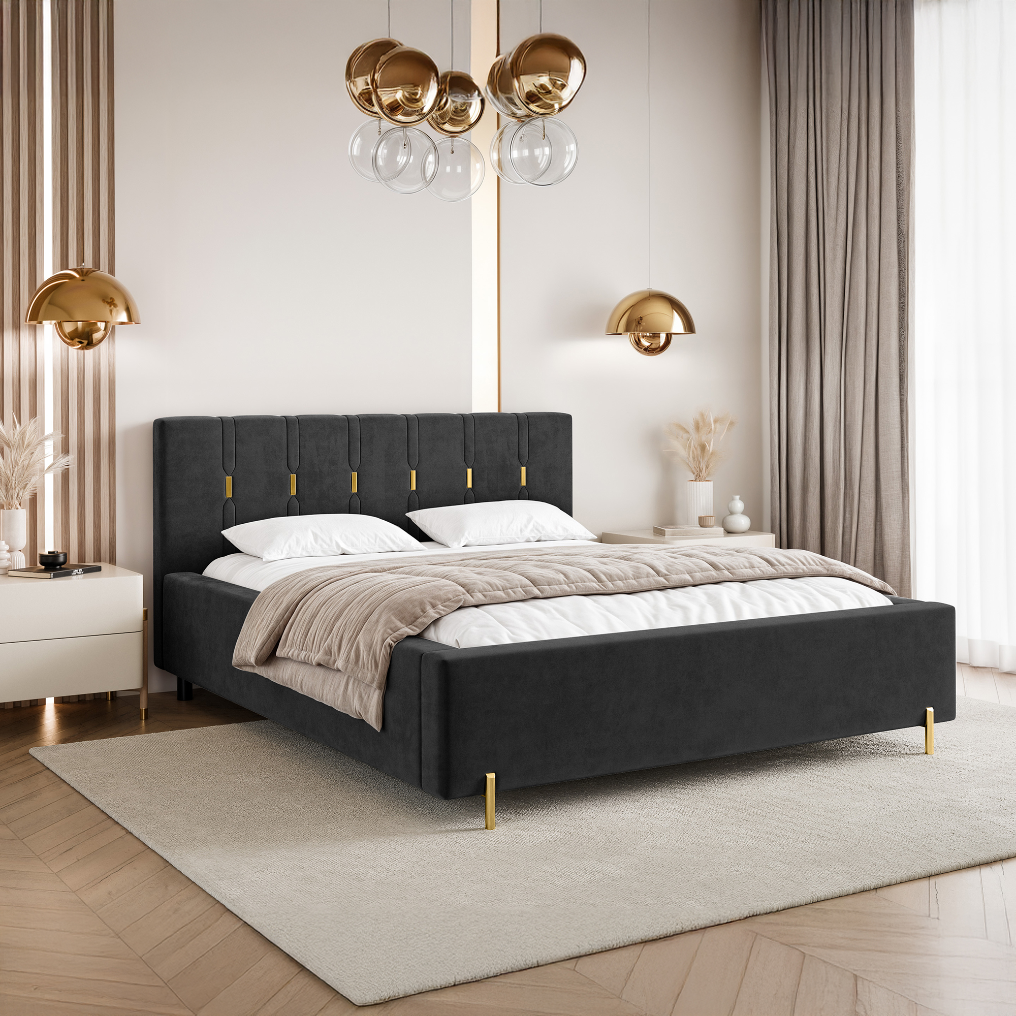 Eleganckie łóżko tapicerowane SABI z pionowymi przeszyciami, to doskonałe połączenie nowoczesnego stylu i subtelnego luksusu. Dekoracyjny zagłówek przyciąga uwagę dzięki wyraźnym, pionowym liniom podkreślonym złotymi akcentami, które nadają całości wyjątkowej głębi i szyku. To idealny wybór do wnętrz, w których liczy się efektowny, ale wciąż harmonijny design.