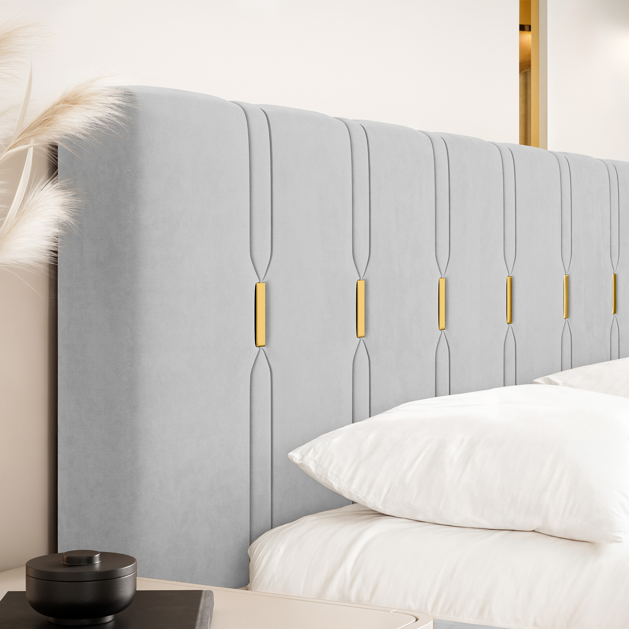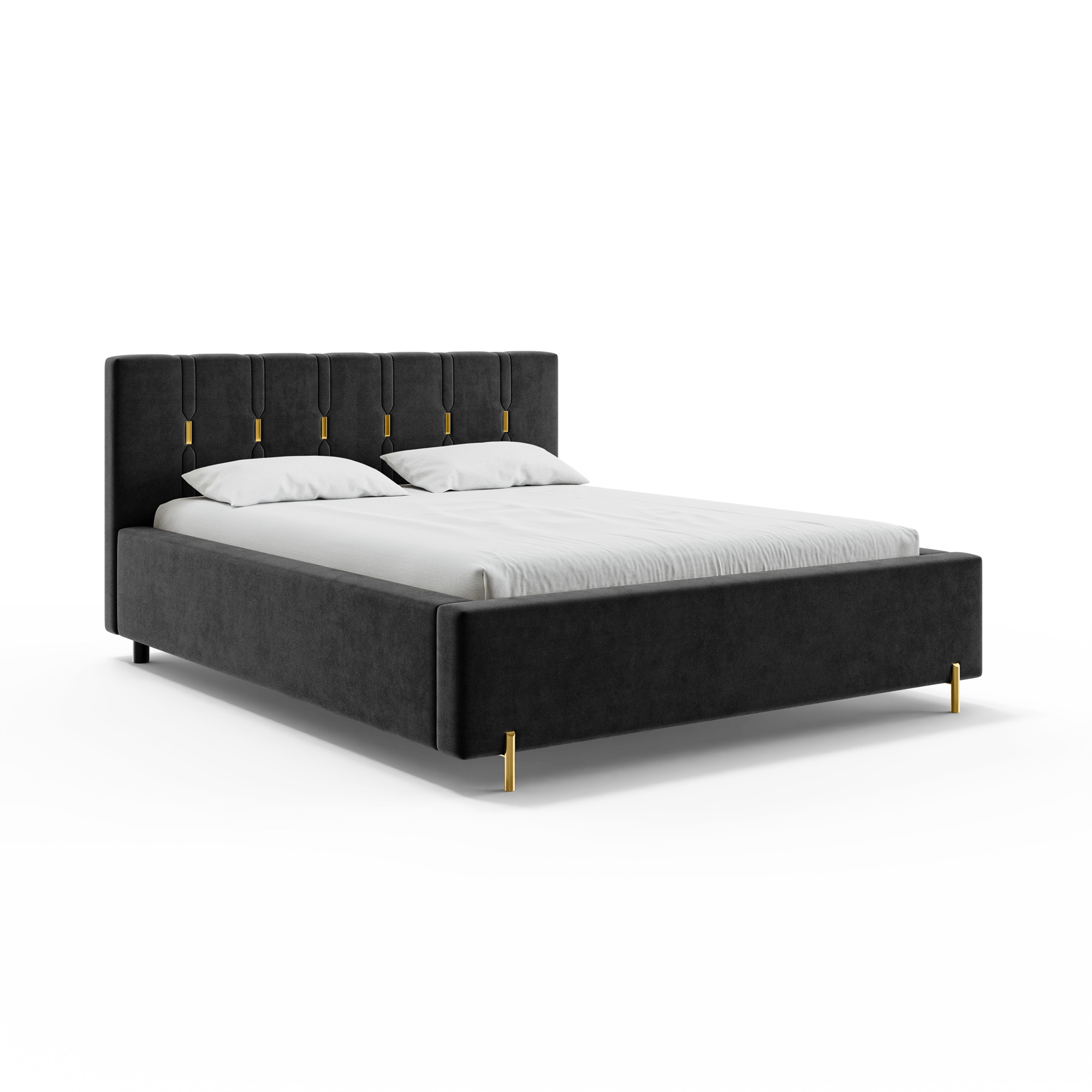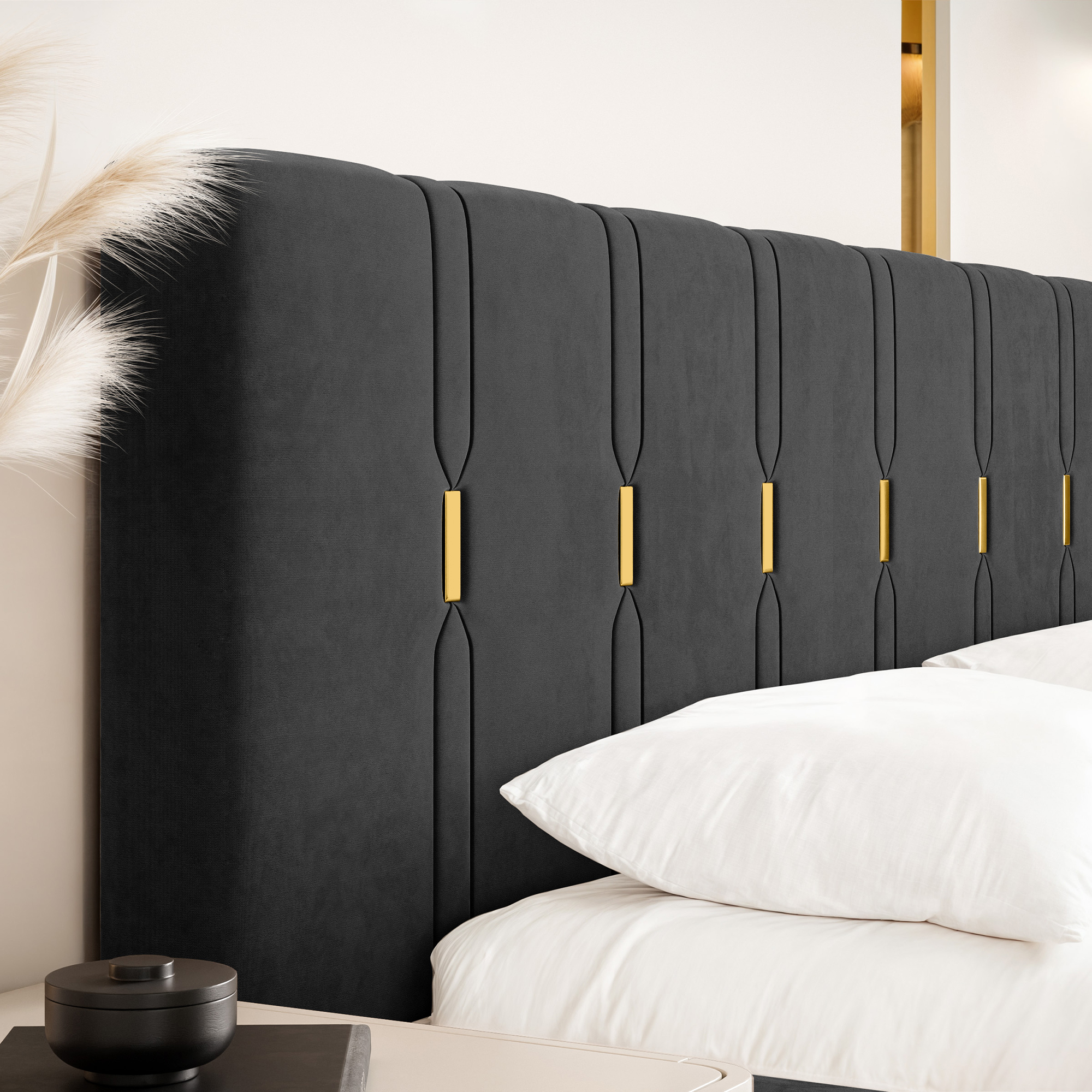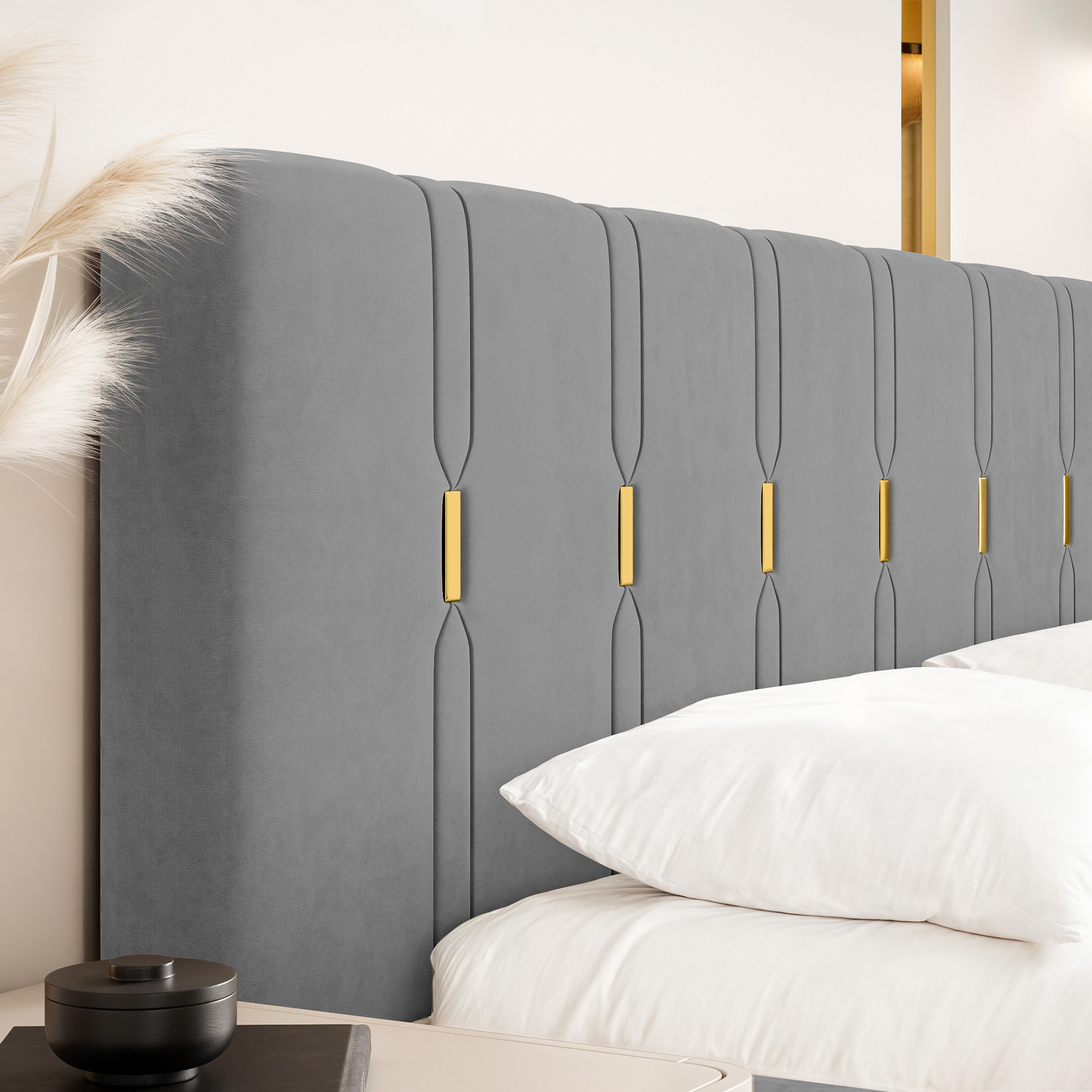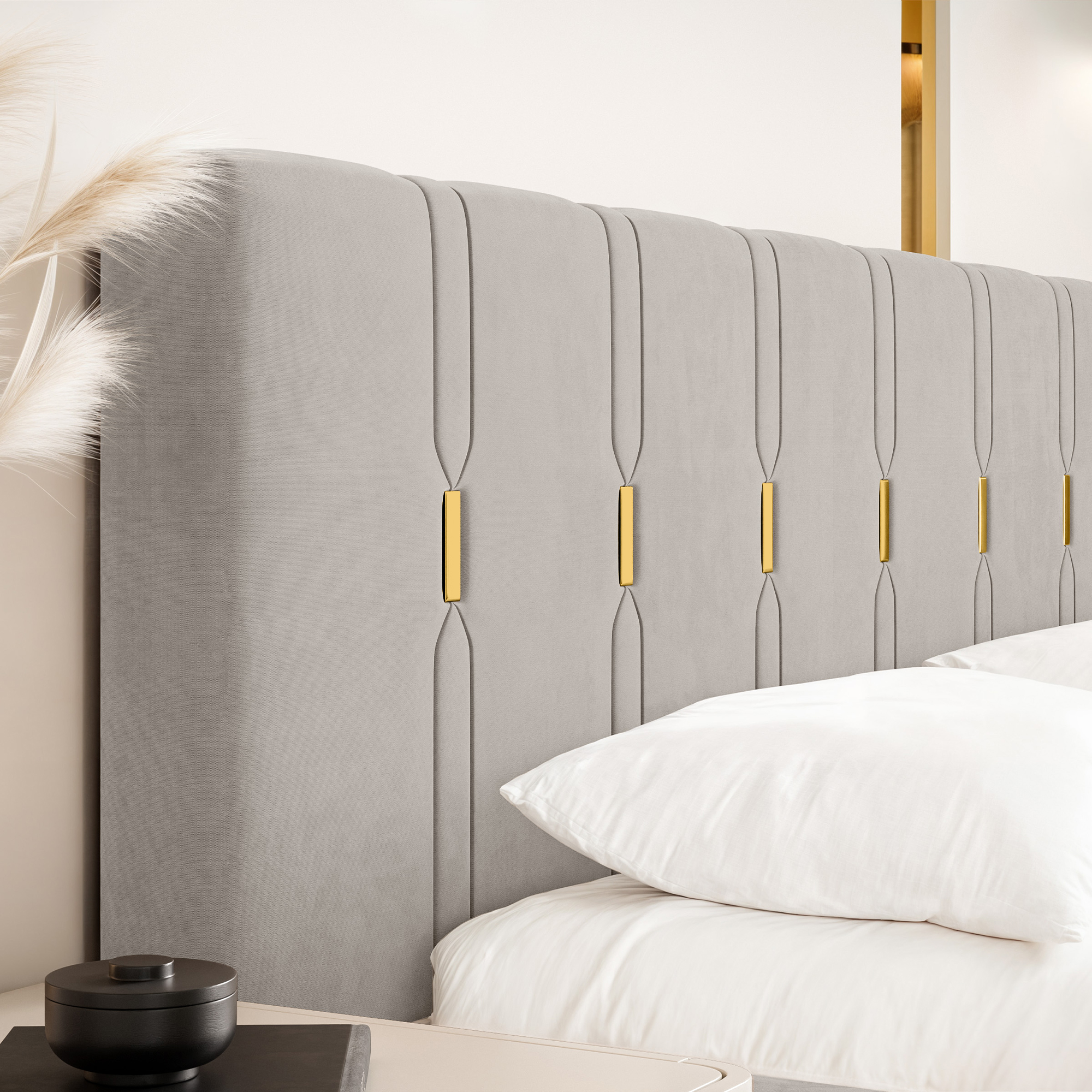 Eleganckie łóżko tapicerowane SABI z pionowymi przeszyciami, to doskonałe połączenie nowoczesnego stylu i subtelnego luksusu. Dekoracyjny zagłówek przyciąga uwagę dzięki wyraźnym, pionowym liniom podkreślonym złotymi akcentami, które nadają całości wyjątkowej głębi i szyku. To idealny wybór do wnętrz, w których liczy się efektowny, ale wciąż harmonijny design.