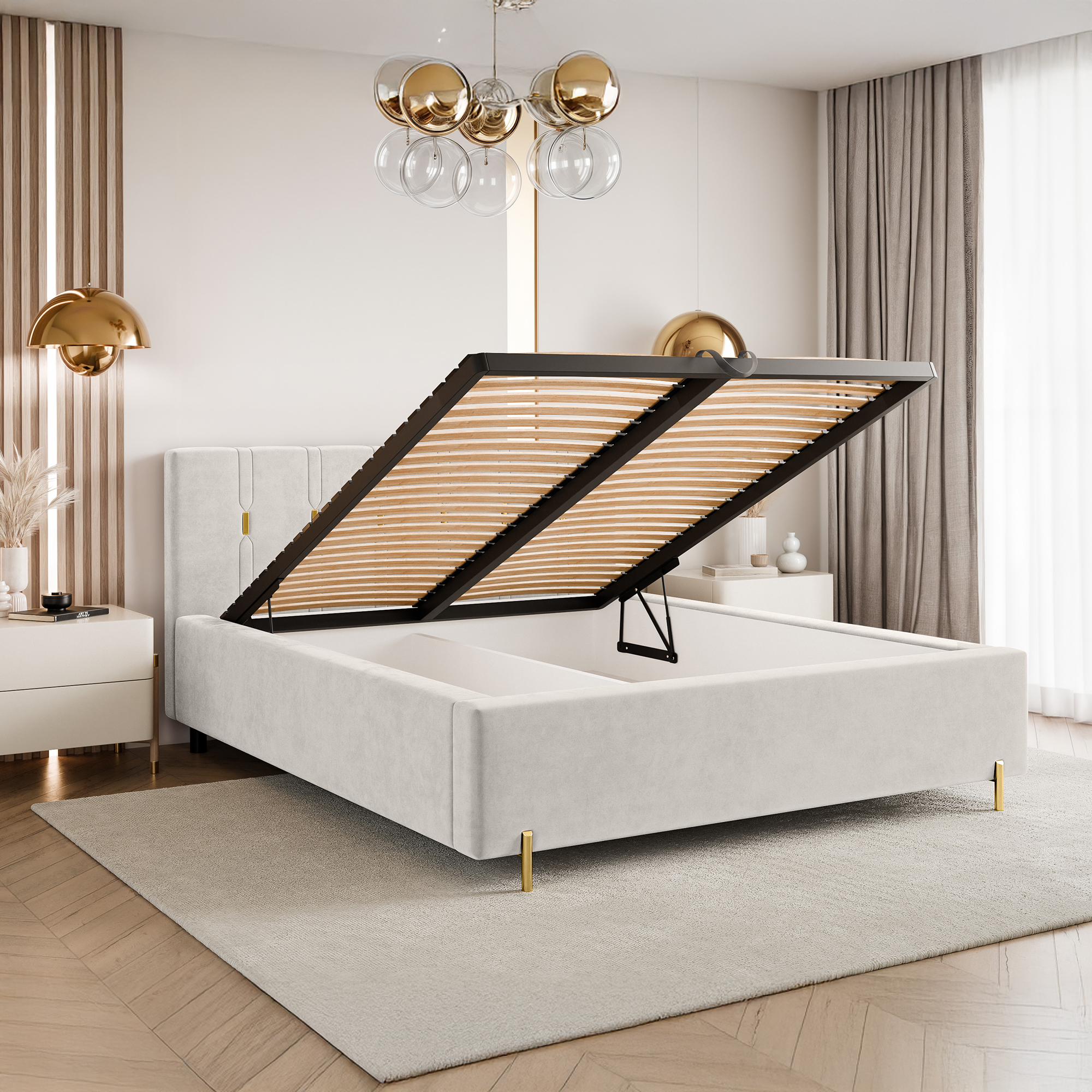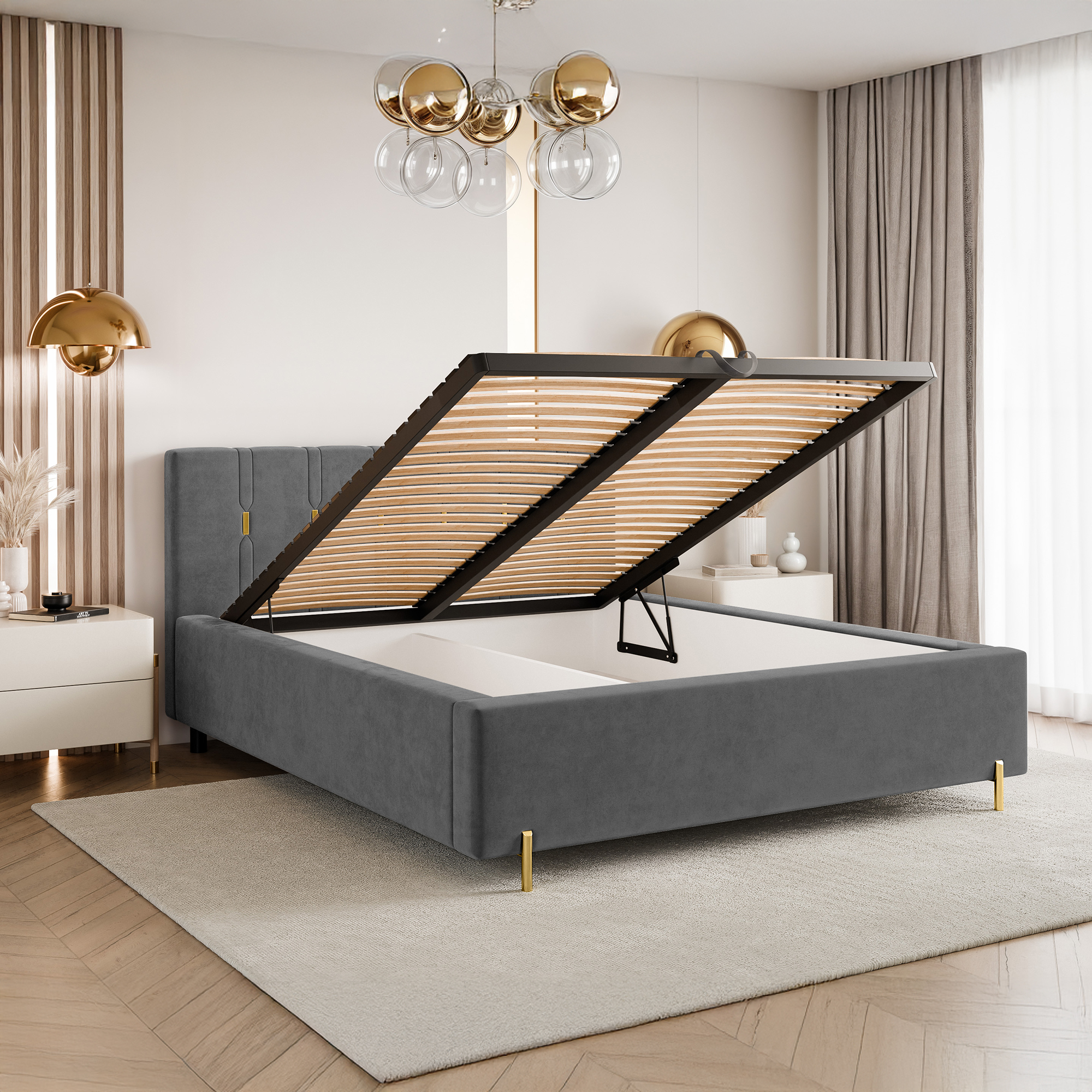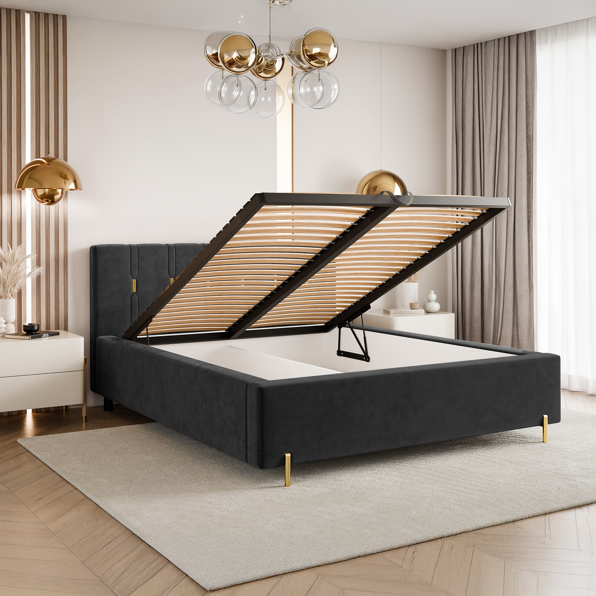 To łóżko świetnie sprawdzi się jako centralny punkt sypialni, wprowadzając do niej nutę nowoczesnego glamour. Połączenie funkcjonalności, wygody i dopracowanych detali sprawia, że jest to idealna propozycja dla osób poszukujących stylowych i ponadczasowych rozwiązań.