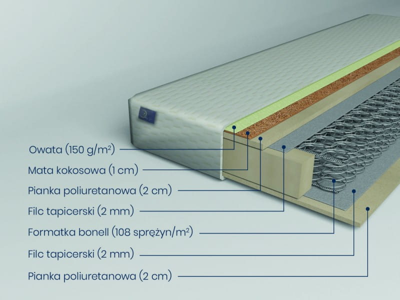 Drugi istotny element to naturalna mata kokosowa, która utwardza materac do spania oraz zapewnia odpowiednią cyrkulację powietrza. Dodatkową zaletą włókien kokosu jest duża trwałość, która zabezpiecza i utrwala wkład materaca.