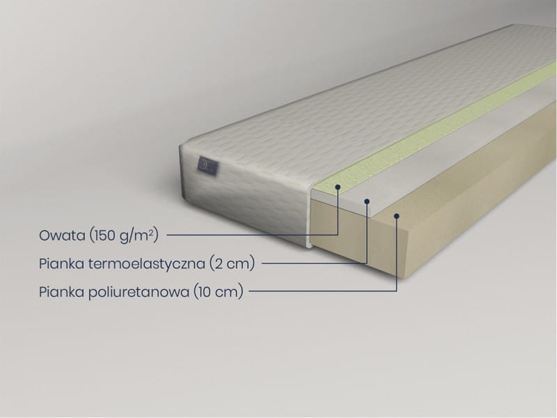 - Materac reaguje na ciepło wydzielane przez ciało, dopasowując się do jego kształtu. Po obniżeniu swojej temperatury powoli wraca do pierwotnej formy.