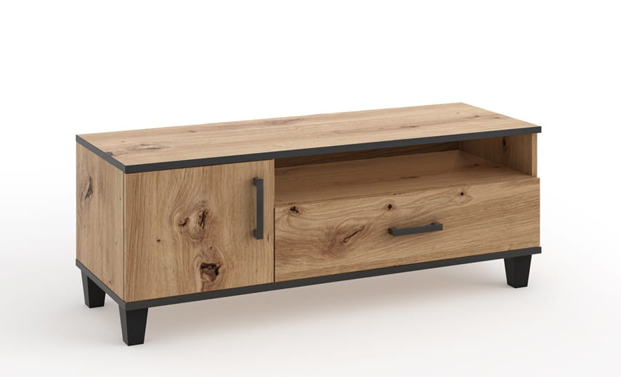Wykreowanie wnętrza o nowoczesnym klimacie, może być niezwykle proste dzięki kolekcji PRESTO. Industrialną stylistykę mebli, podkreślają czarne nóżki, uchwyty oraz obrzeża, kontrastujące z naturalistycznym odcieniem dębu artisan. Ciepłe wybarwienie korpusów i frontów tworzy ich estetykę mniej surową, tym samym bardzo przyjemną dla oka. W opcji dodatkowej znajduje się oświetlenie do przeszklonych witryn w systemie, które zagwarantuje zbudowanie wyjątkowej nastrojowości wewnątrz Twoich czterech ścian.