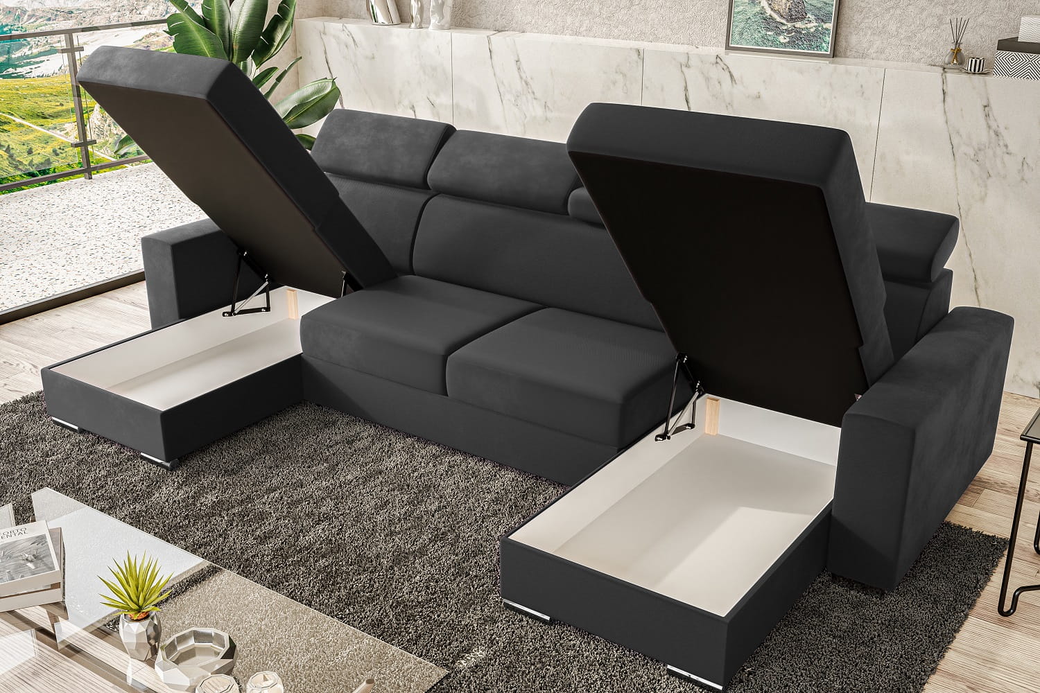 Narożnik duży do salonu VOSS U z pojemnikami i funkcją spania
