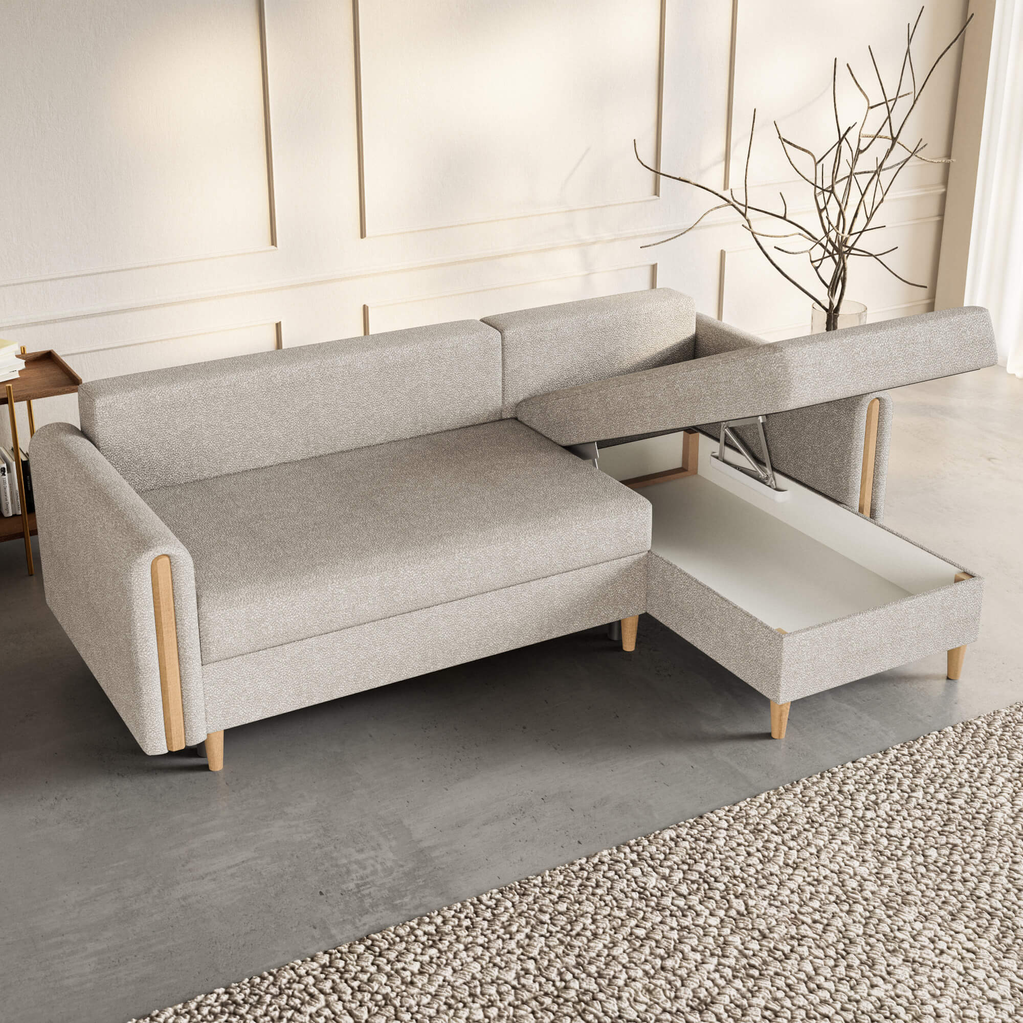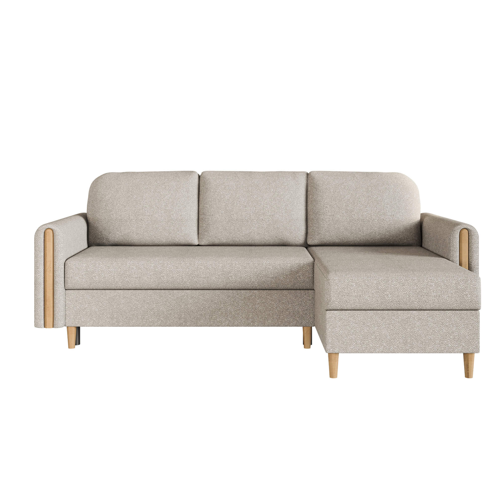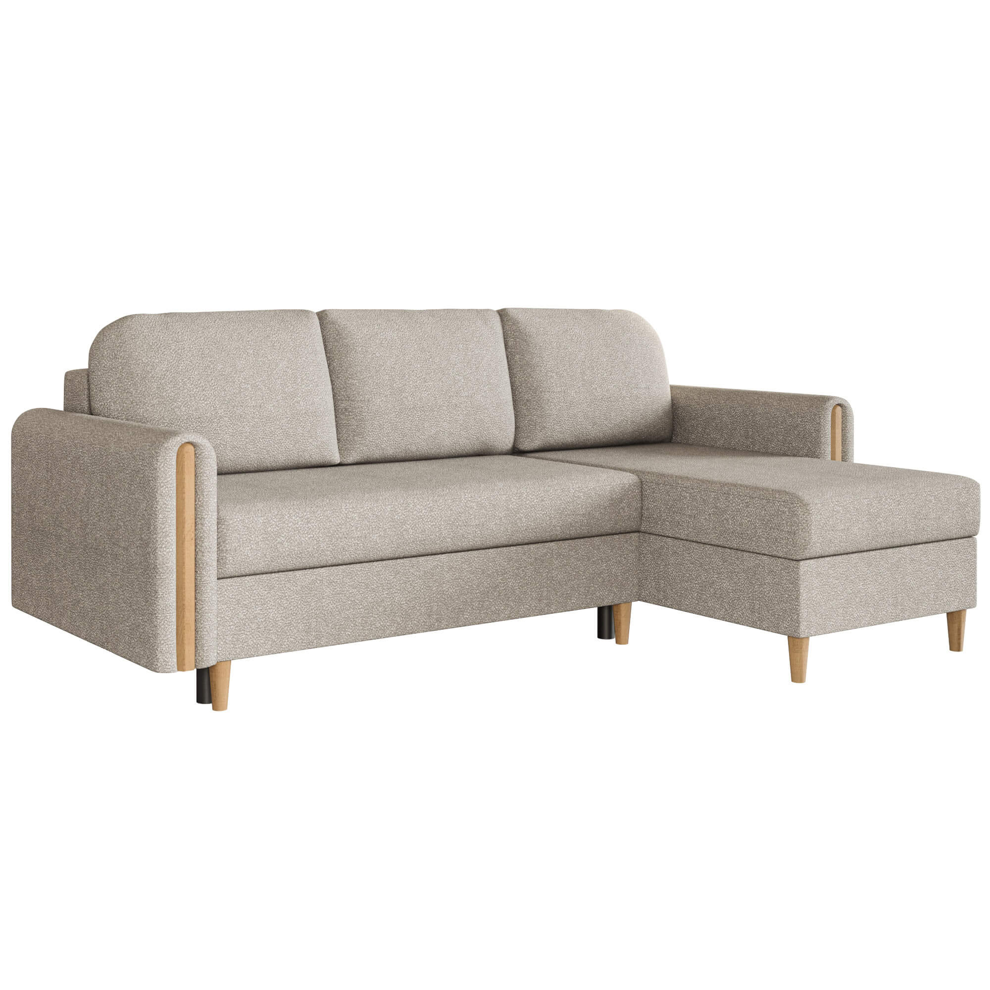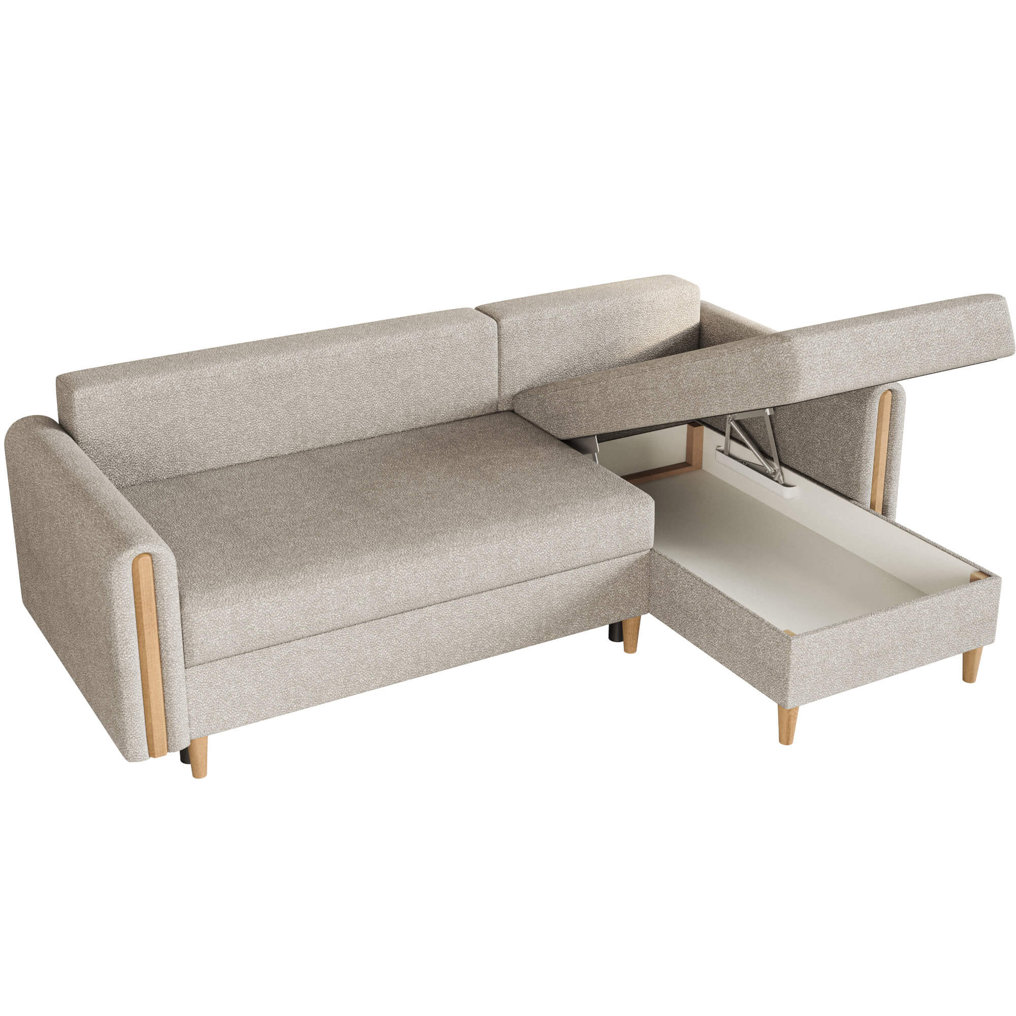 LAGI to nowoczesny narożnik o szerokości 225 cm. Jest on idealnym rozwiązaniem do mniejszych pokoi dziennych, gdzie liczy się każdy centymetr przestrzeni. Model ten został obity elegancką beżową tkaniną, która wprowadza do wnętrza ciepło i przytulny klimat. Możliwość wyboru strony sprawia ,że łatwo dopasujesz go do układu pomieszczenia. Mebel wyposażono w funkcję spania z wygodnym automatem DL, który pozwala szybko przekształcić narożnik w wygodne łóżko. Sprężyna falista oraz pianka poliuretanowa T-28 zapewniają komfort. Dwa pojemniki na pościel oferują praktyczne miejsce do przechowywania sypialnianych akcesoriów. Narożnik rozkładany LAGI to świetne rozwiązanie do wnętrz urządzonych w stylu skandynawskim oraz minimalistycznym.