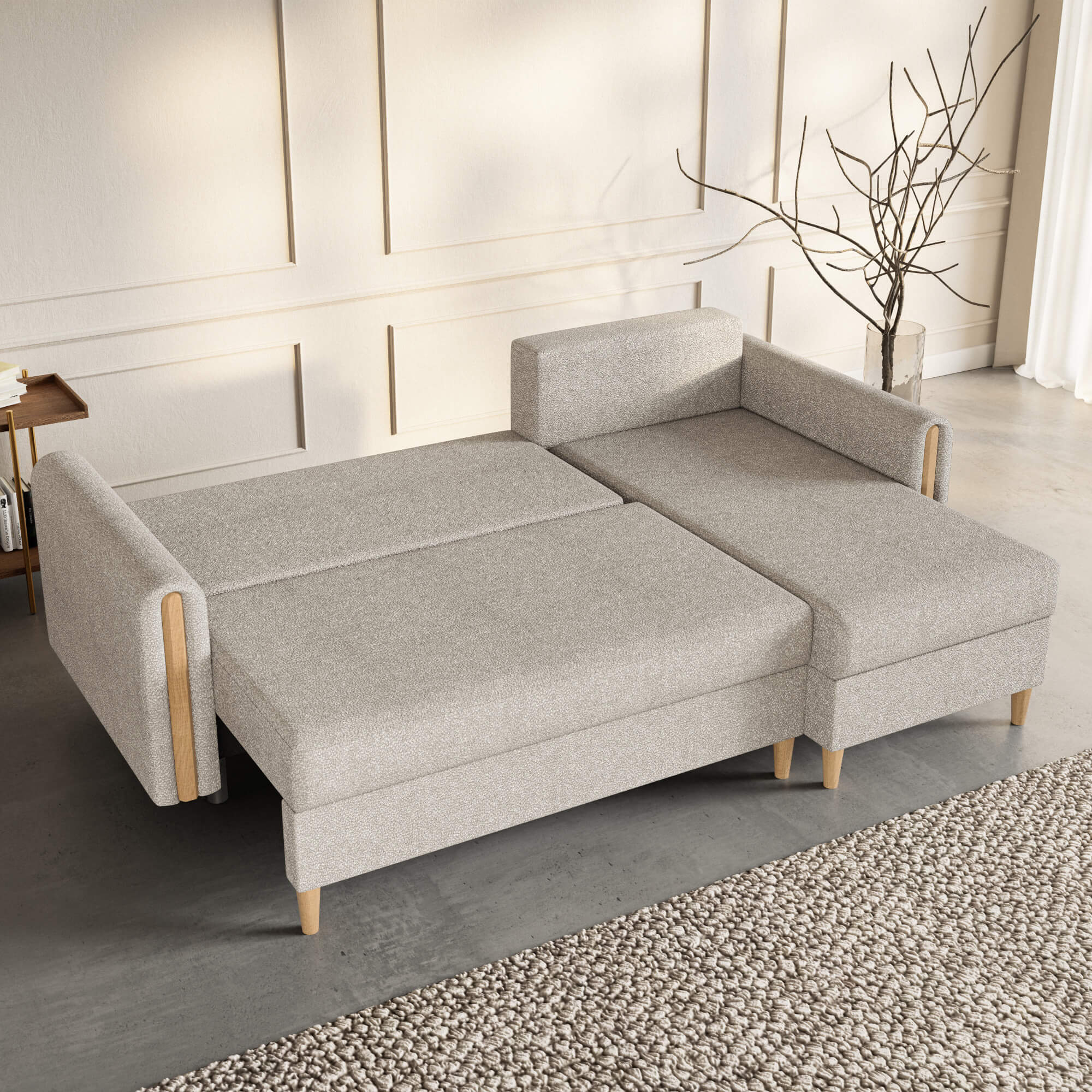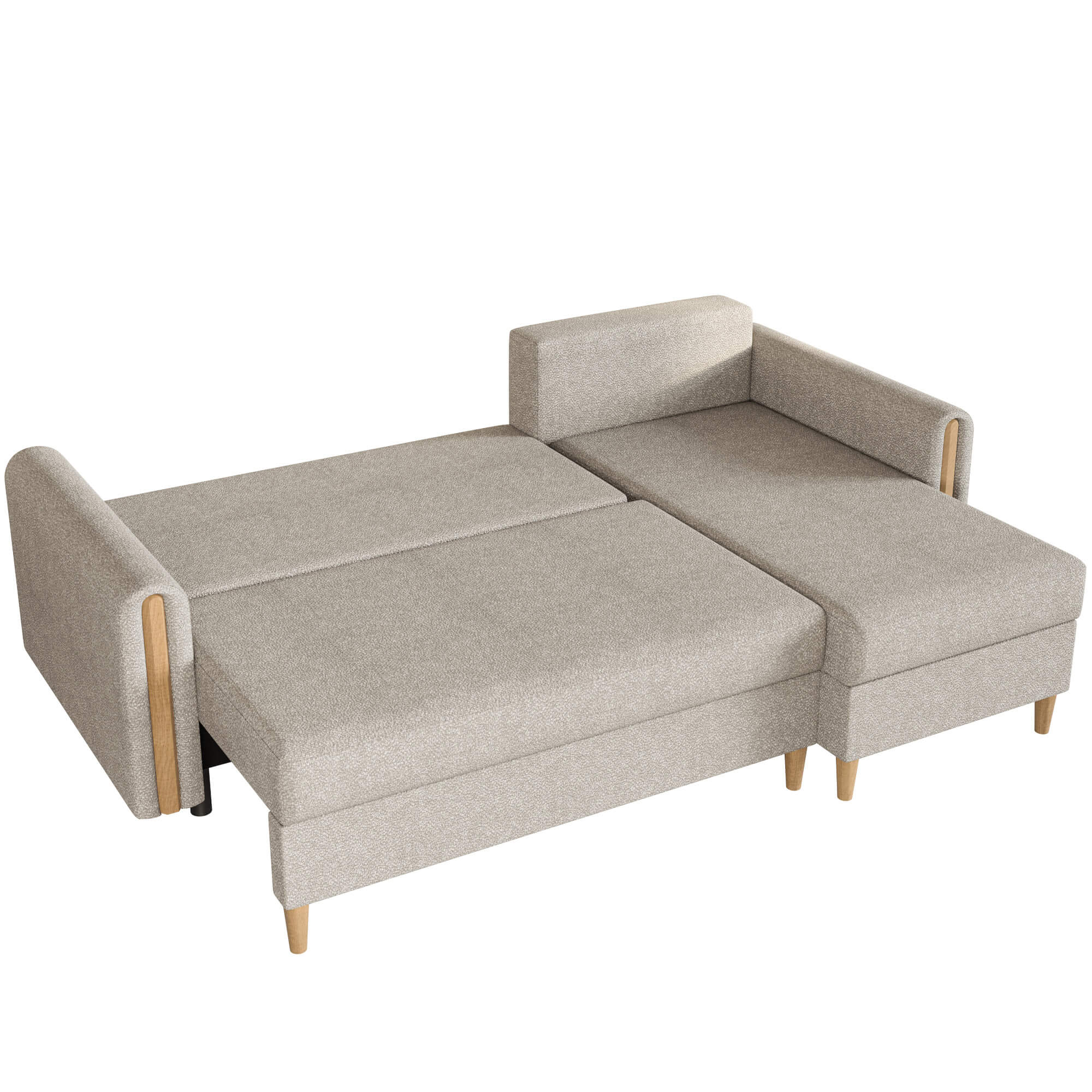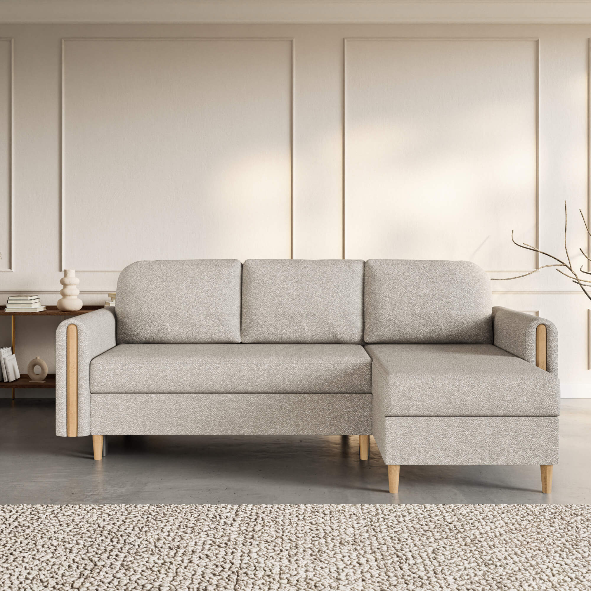 LAGI to nowoczesny narożnik o szerokości 225 cm. Jest on idealnym rozwiązaniem do mniejszych pokoi dziennych, gdzie liczy się każdy centymetr przestrzeni. Model ten został obity elegancką beżową tkaniną, która wprowadza do wnętrza ciepło i przytulny klimat. Możliwość wyboru strony sprawia ,że łatwo dopasujesz go do układu pomieszczenia. Mebel wyposażono w funkcję spania z wygodnym automatem DL, który pozwala szybko przekształcić narożnik w wygodne łóżko. Sprężyna falista oraz pianka poliuretanowa T-28 zapewniają komfort. Dwa pojemniki na pościel oferują praktyczne miejsce do przechowywania sypialnianych akcesoriów. Narożnik rozkładany LAGI to świetne rozwiązanie do wnętrz urządzonych w stylu skandynawskim oraz minimalistycznym.
