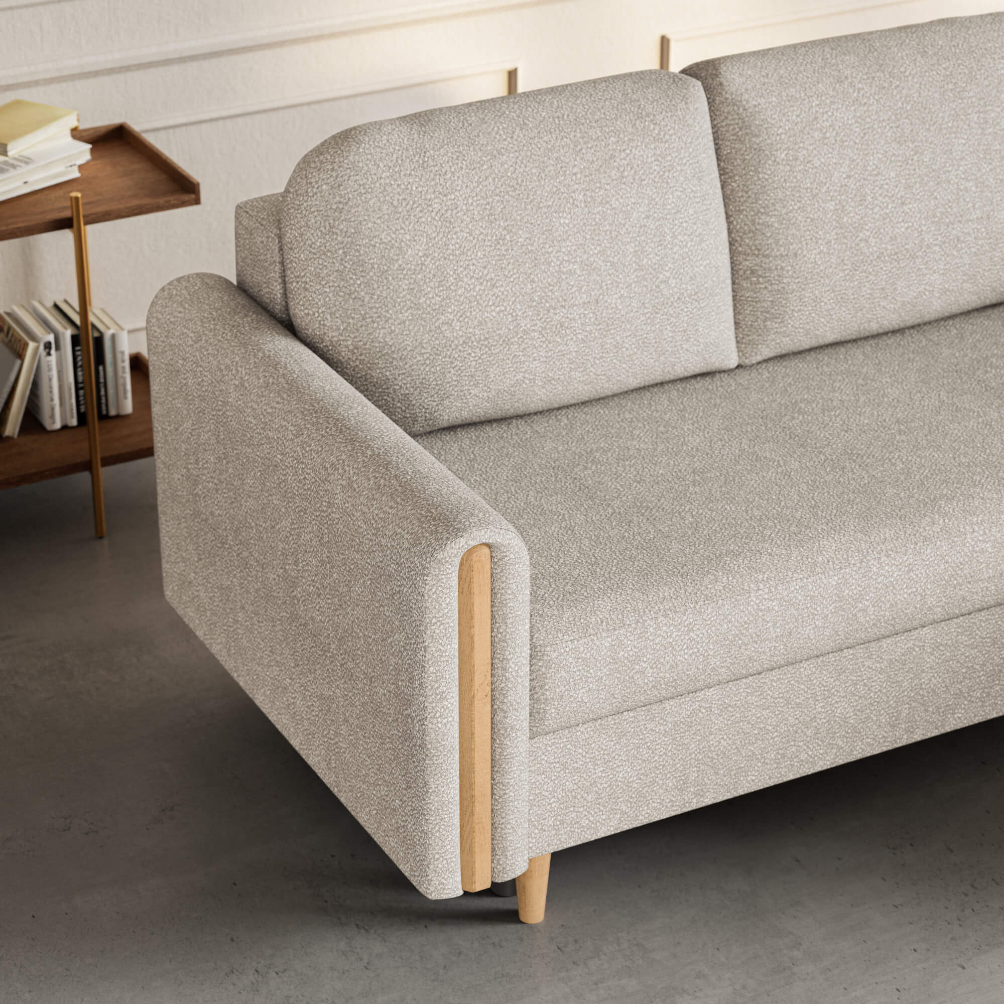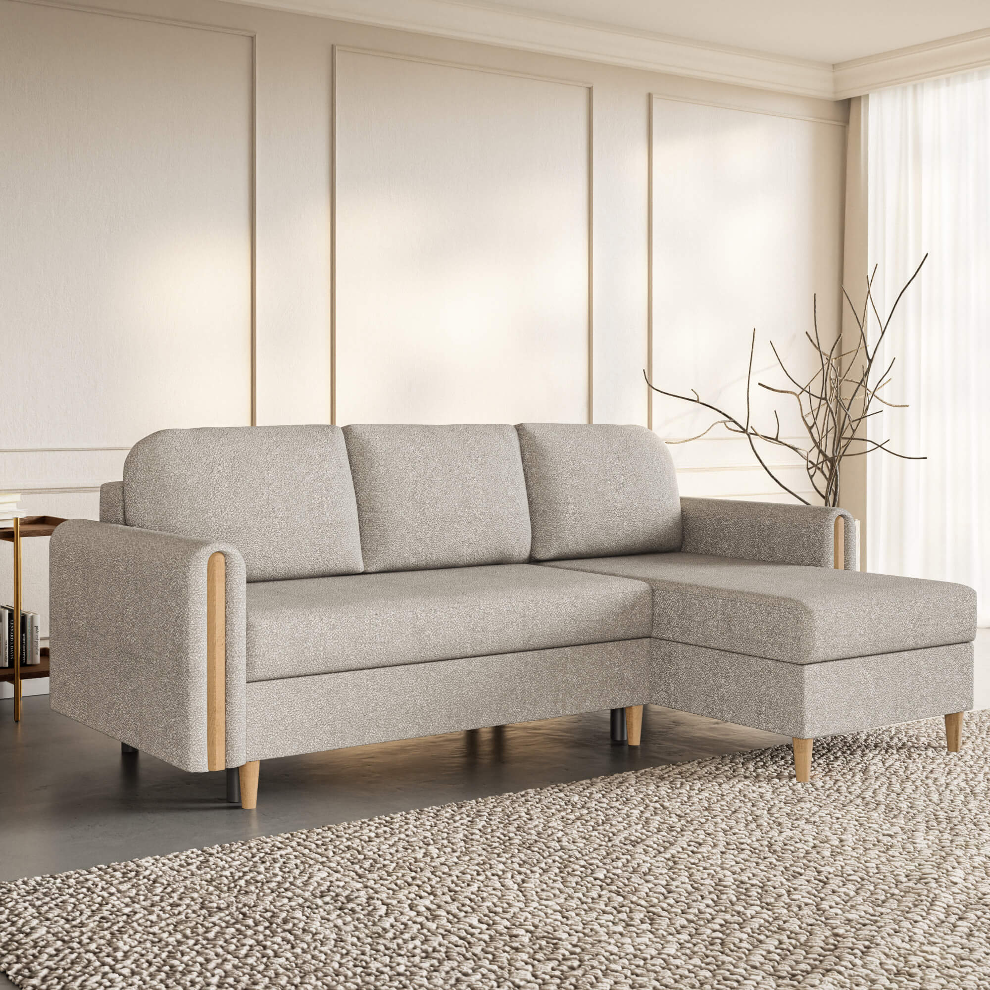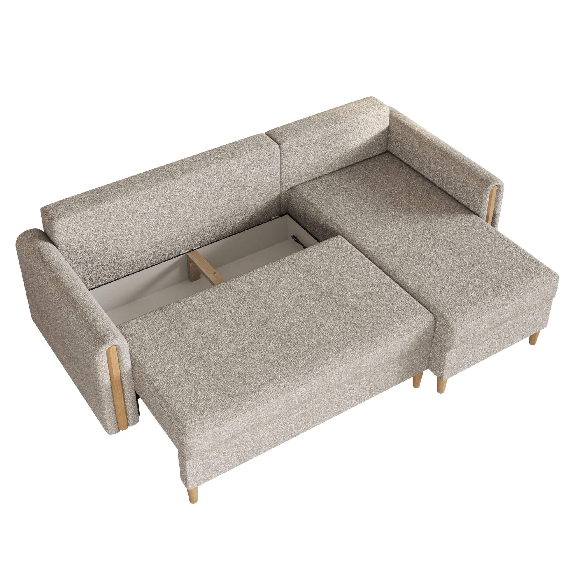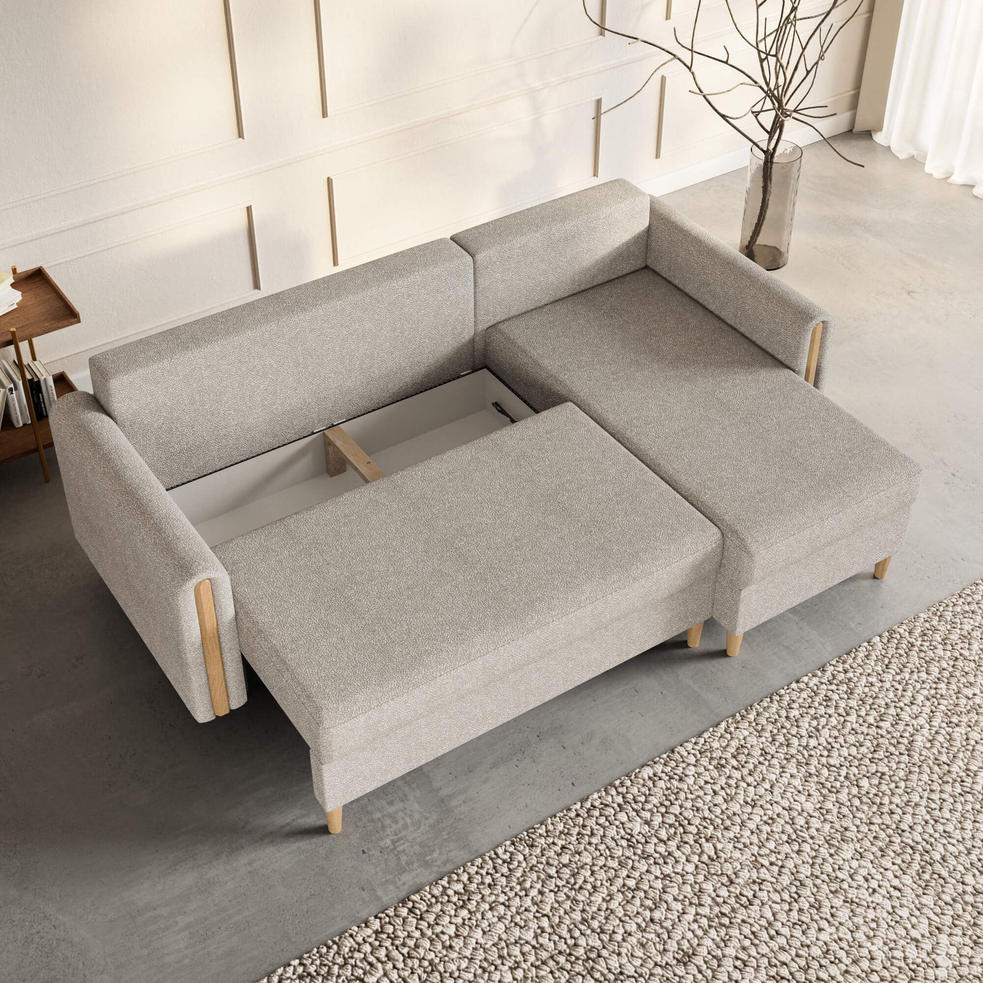 LAGI to nowoczesny narożnik o szerokości 225 cm. Jest on idealnym rozwiązaniem do mniejszych pokoi dziennych, gdzie liczy się każdy centymetr przestrzeni. Model ten został obity elegancką beżową tkaniną, która wprowadza do wnętrza ciepło i przytulny klimat. Możliwość wyboru strony sprawia ,że łatwo dopasujesz go do układu pomieszczenia. Mebel wyposażono w funkcję spania z wygodnym automatem DL, który pozwala szybko przekształcić narożnik w wygodne łóżko. Sprężyna falista oraz pianka poliuretanowa T-28 zapewniają komfort. Dwa pojemniki na pościel oferują praktyczne miejsce do przechowywania sypialnianych akcesoriów. Narożnik rozkładany LAGI to świetne rozwiązanie do wnętrz urządzonych w stylu skandynawskim oraz minimalistycznym.