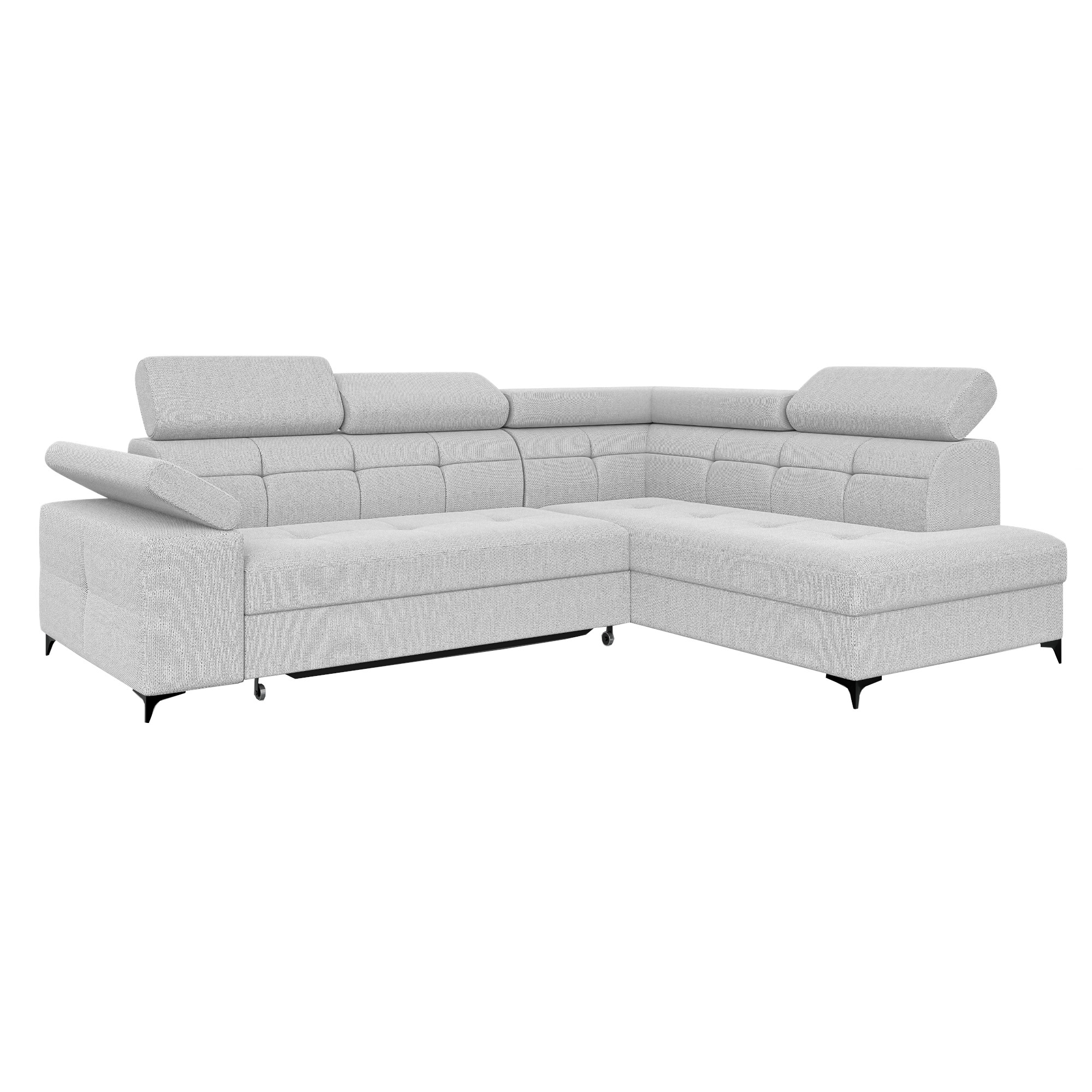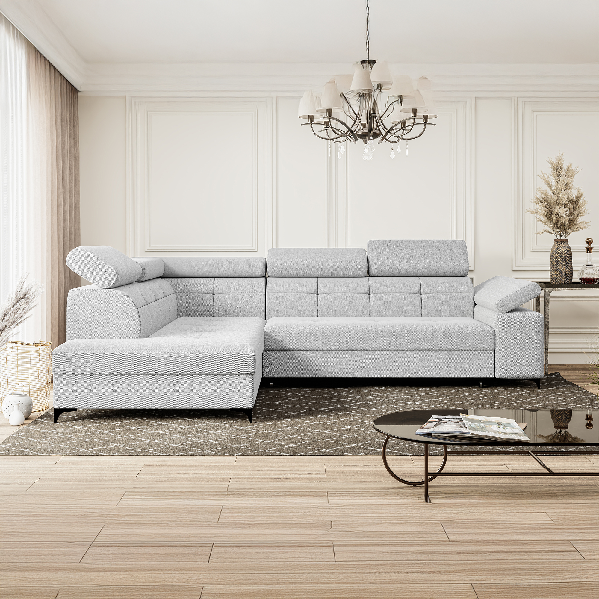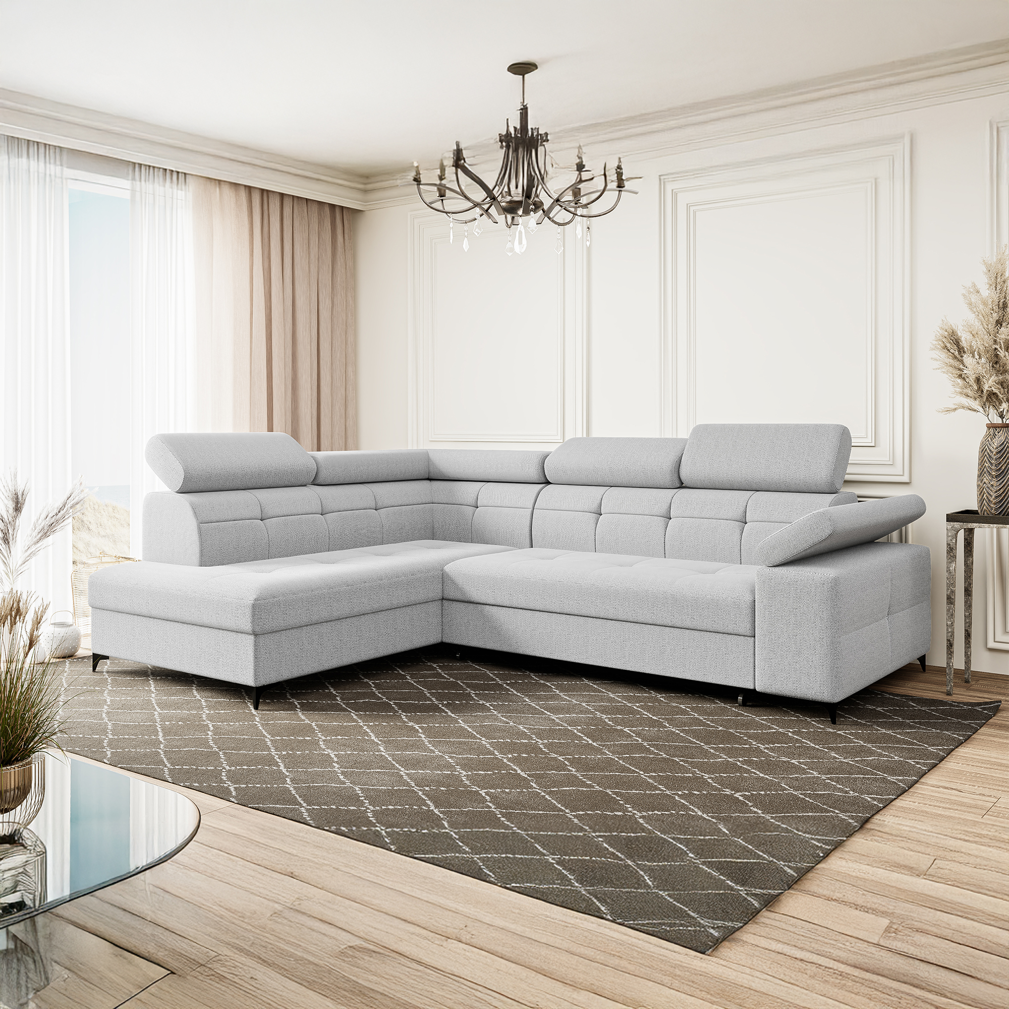 Nowoczesny narożnik BREGI w eleganckiej biało-szarej tkaninie to doskonałe połączenie stylu, komfortu i funkcjonalności. Siedzisko wykonane z wykorzystaniem sprężyn falistych oraz pianki, zapewnia odpowiednie podparcie ciała, wygodę użytkowania oraz trwałość na lata. Model wyposażony jest w funkcję spania z praktycznym systemem typu delfin, opartym na wysuwanym wózku na kółkach, dzięki czemu w szybki sposób można zamienić narożnik w komfortowe miejsce do snu. Ruchome zagłówki i podłokietniki pozwolą dopasować jego ustawienie do indywidualnych potrzeb i zwiększają komfort codziennego wypoczynku. Uniwersalna konstrukcja umożliwia wybór strony lewej lub prawej, dzięki czemu mebel można idealnie dopasować do układu pomieszczenia.