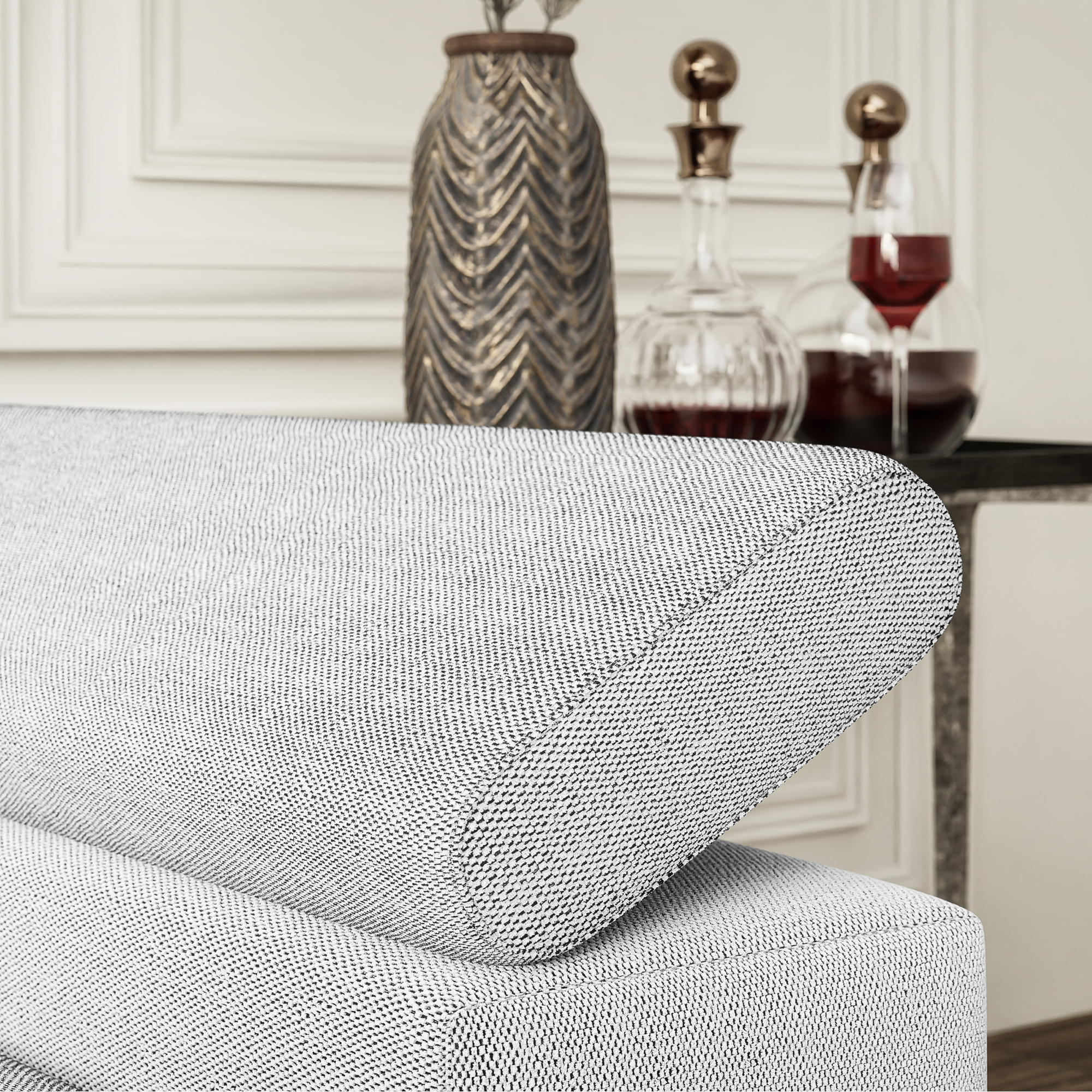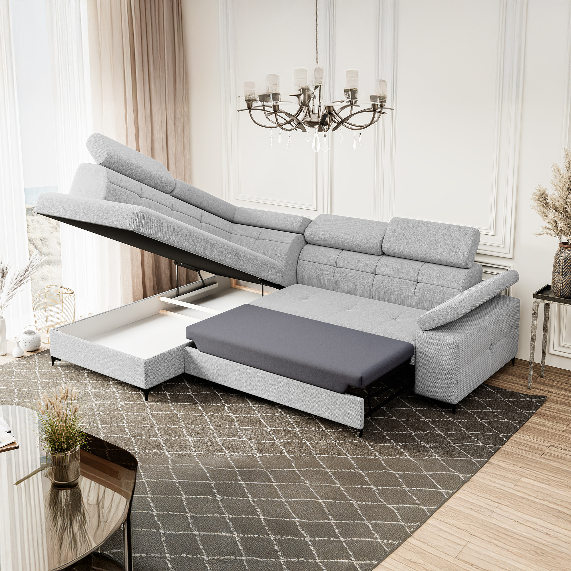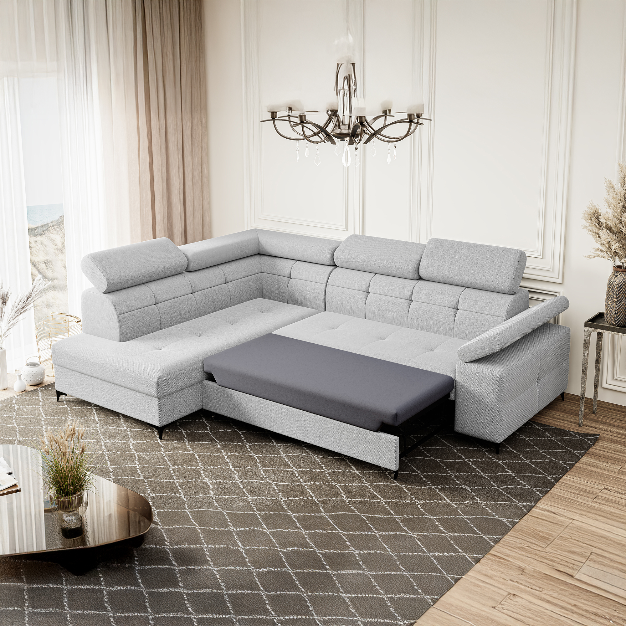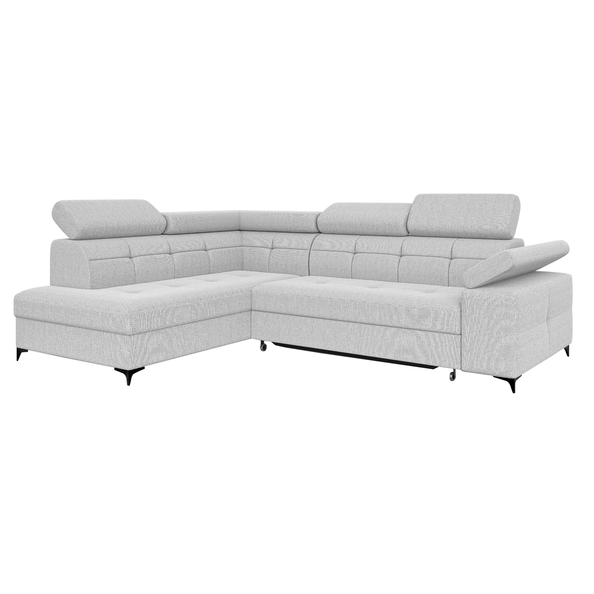 Nowoczesny narożnik BREGI w eleganckiej biało-szarej tkaninie to doskonałe połączenie stylu, komfortu i funkcjonalności. Siedzisko wykonane z wykorzystaniem sprężyn falistych oraz pianki, zapewnia odpowiednie podparcie ciała, wygodę użytkowania oraz trwałość na lata. Model wyposażony jest w funkcję spania z praktycznym systemem typu delfin, opartym na wysuwanym wózku na kółkach, dzięki czemu w szybki sposób można zamienić narożnik w komfortowe miejsce do snu. Ruchome zagłówki i podłokietniki pozwolą dopasować jego ustawienie do indywidualnych potrzeb i zwiększają komfort codziennego wypoczynku. Uniwersalna konstrukcja umożliwia wybór strony lewej lub prawej, dzięki czemu mebel można idealnie dopasować do układu pomieszczenia.