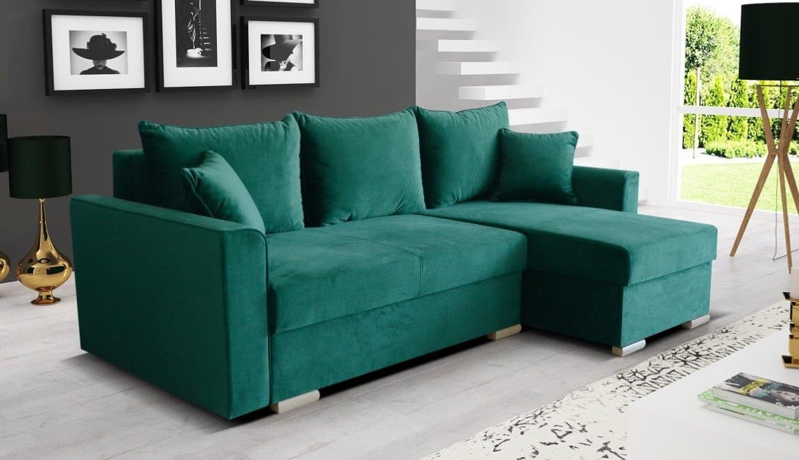 Narożnik ATIS to mebel stworzony z myślą o osobach ceniących prostotę i minimalizm. Wykonany został z wysokiej jakości materiałów, dzięki czemu służyć będzie przez wiele lat. Posiada funkcję spania oraz dwa pojemne pojemniki na pościel, przez co pomieszczenie zyskuje dodatkową przestrzeń do przechowywania. Materiał, z którego została wykonana bryła oraz kolor butelkowej zieleni nada w nowocześnie urządzonym salonie dużo ciepła oraz indywidualnego charakteru.