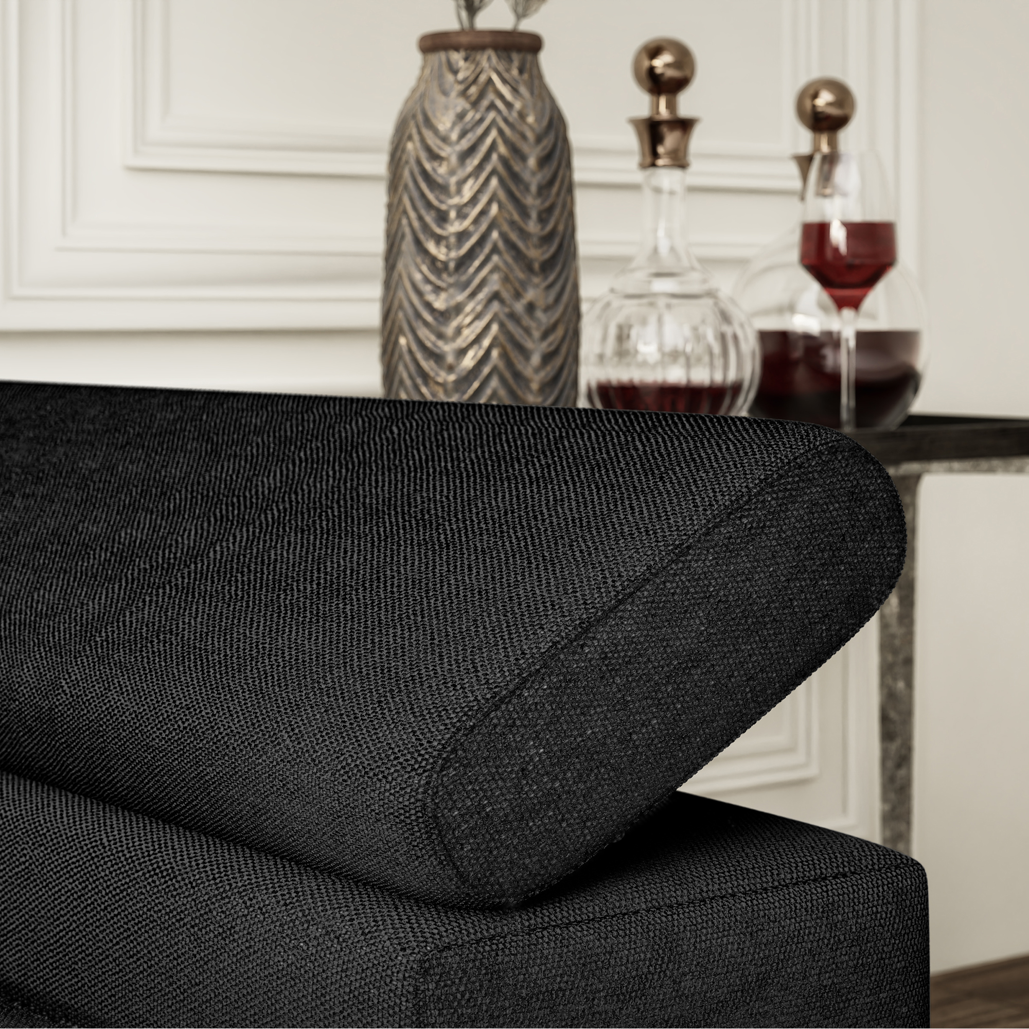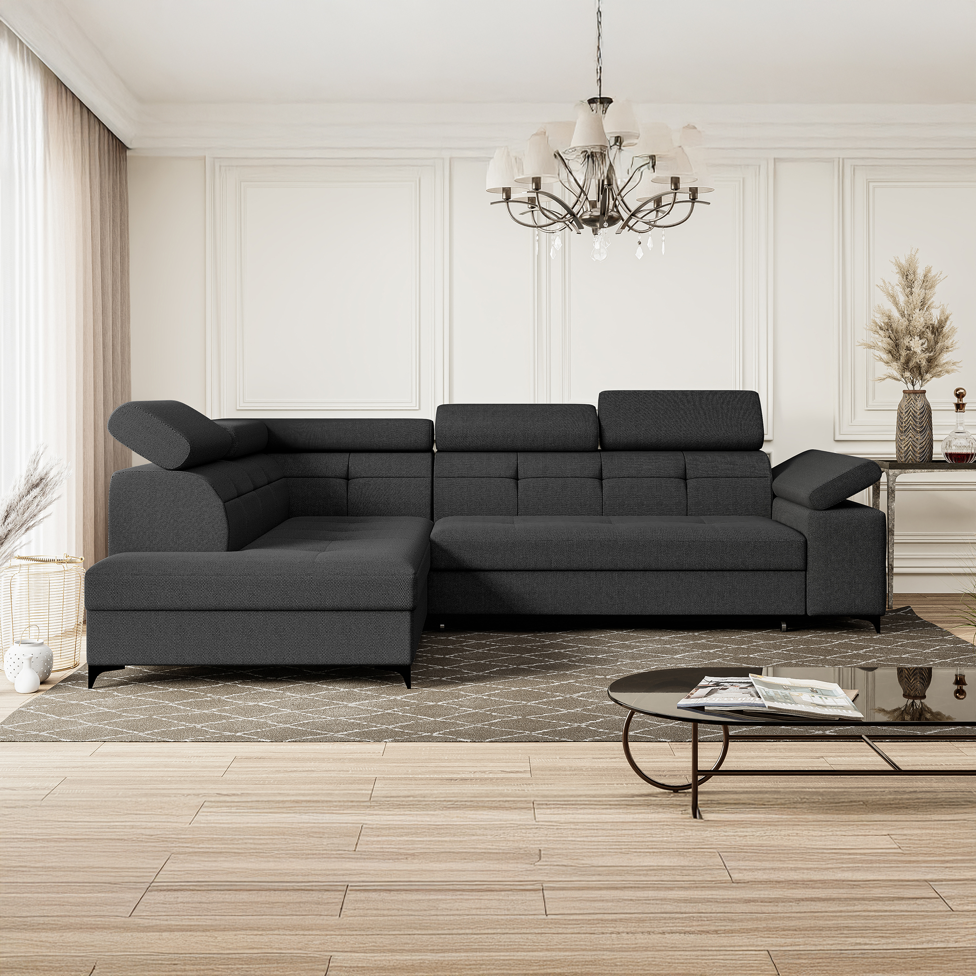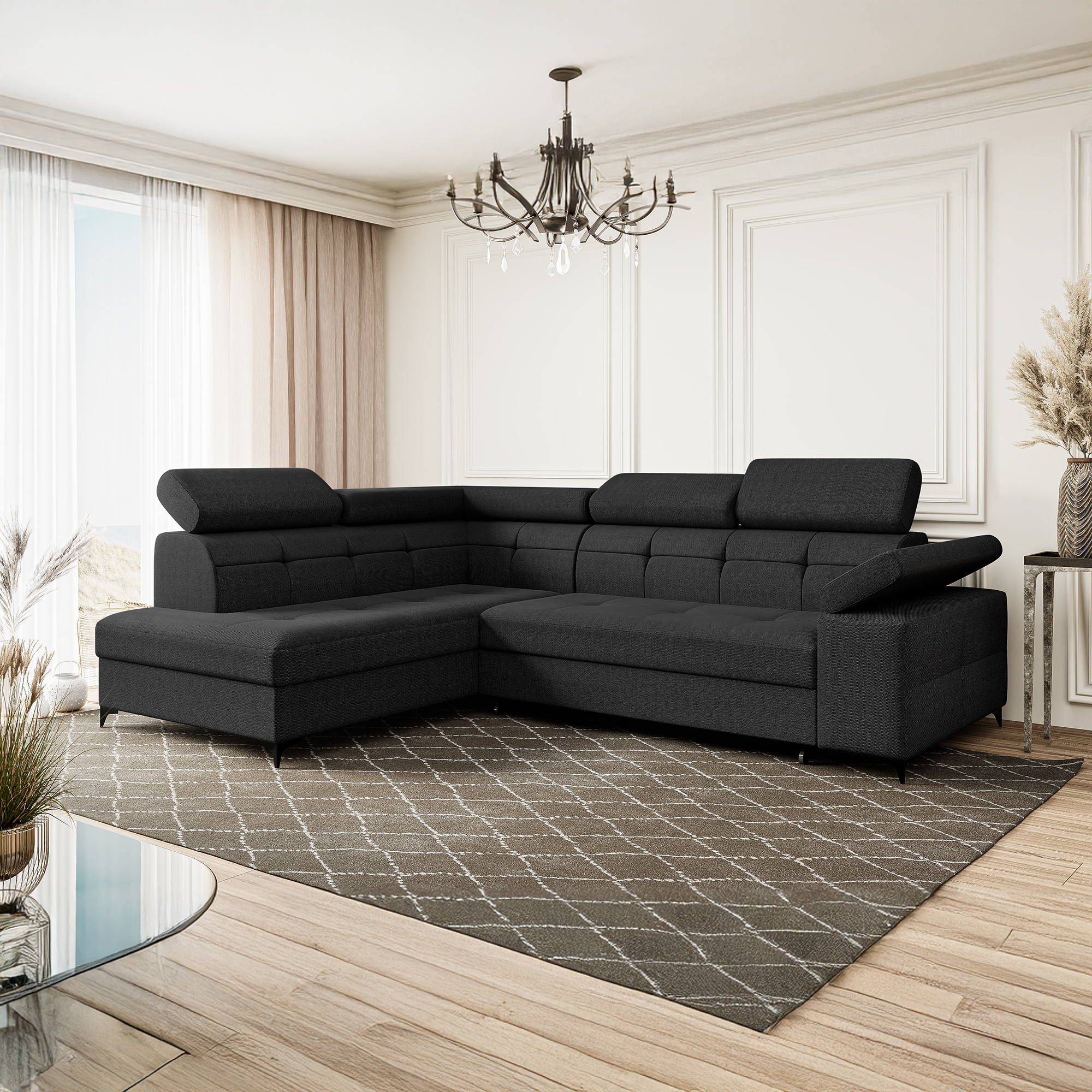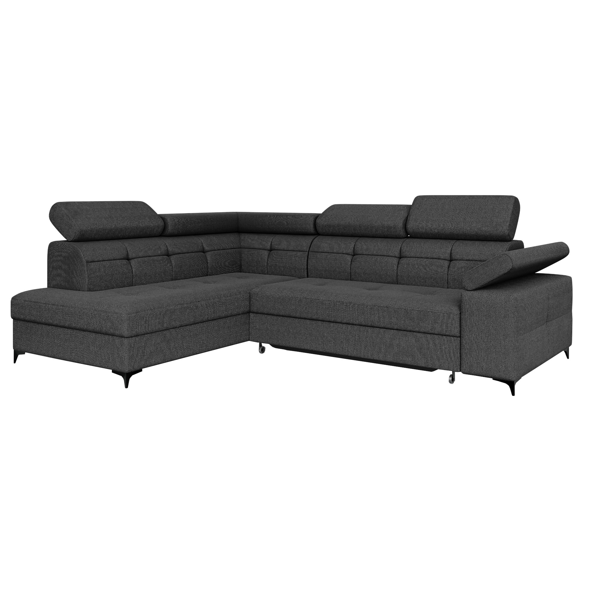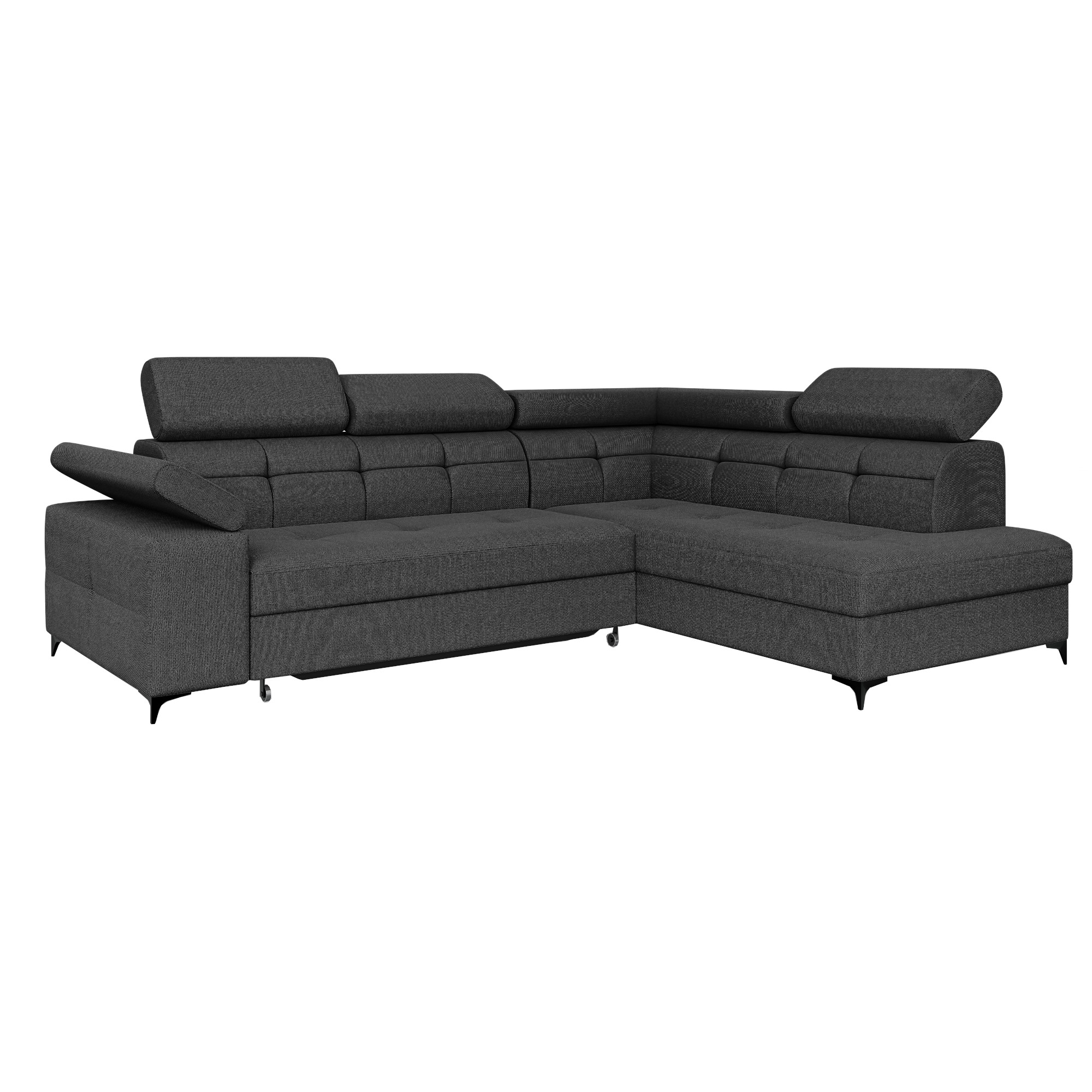 Czarny narożnik BREGI w popularnej tkaninie modesto to świetna propozycja do nowoczesnego salonu. Kolor ten nadaje wnętrzu wyrazistego charakteru i ponadczasowego stylu. Mebel ten oferuje funkcjonalne rozwiązania, które podnoszą komfort użytkowania. Wykorzystanie sprężyn falistych oraz pianki gwarantuje wygodny odpoczynek. Ruchome zagłówki i oparcie stanowią dodatkową zaletę tego modelu. Pojemnik na pościel zapewni miejsce do przechowywania tekstyli. Całość osadzono na czarnych nóżkach, nadających bryle lekkości. Możliwość wyboru strony pozwoli na dopasowanie go do potrzeb aranżacyjnych wnętrza.