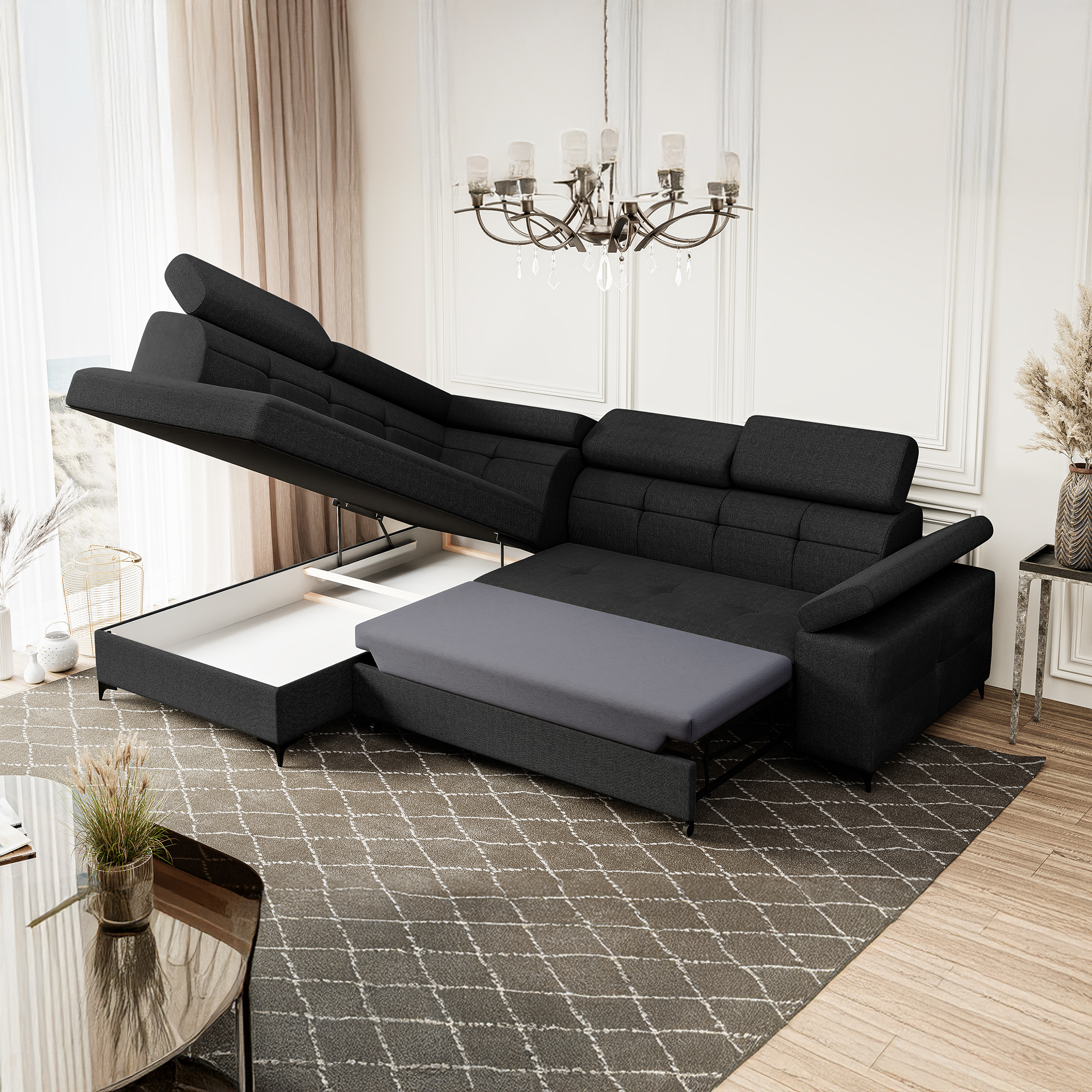 Narożnik czarny rozkładany z pojemnikiem BERGI