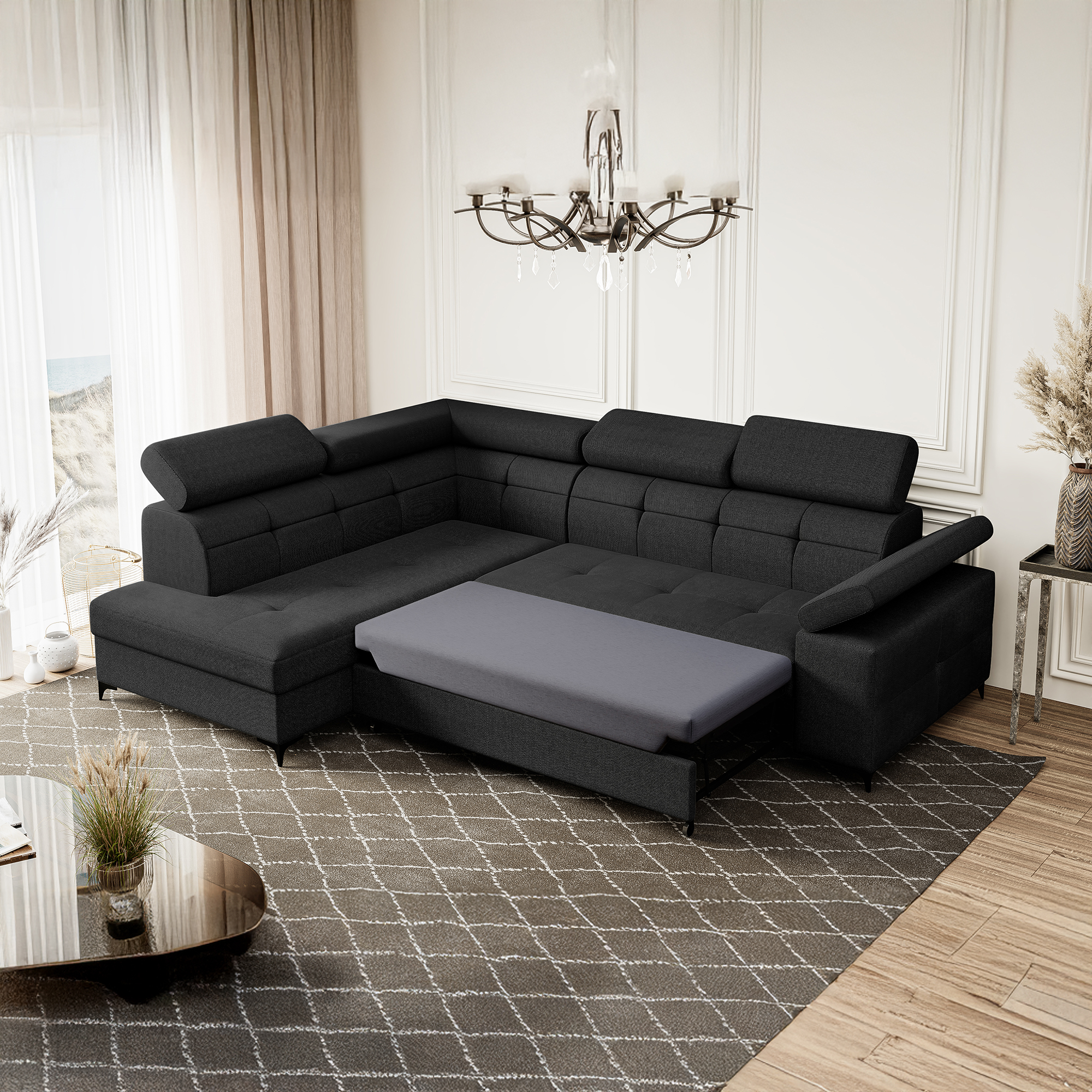 Narożnik czarny rozsuwany na nóżkach BERGI