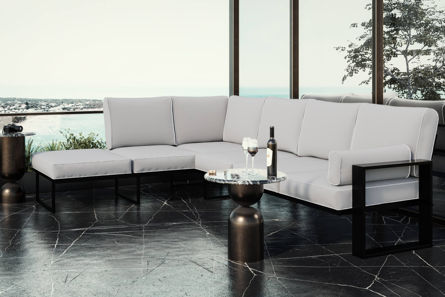 Konstrukcja narożnika opiera się na solidnej ramie ze stali nierdzewnej, malowanej proszkowo. Gwarantuje to trwałość i odporność na warunki atmosferyczne. Siedzisko wyposażone jest w sprężyny faliste, które zapewniają elastyczność i komfort użytkowania. Poduszki wypełnione są wysokiej jakości pianką T30,vco sprawia, że narożnik jest niezwykle wygodny i dostosowuje się do kształtu ciała.