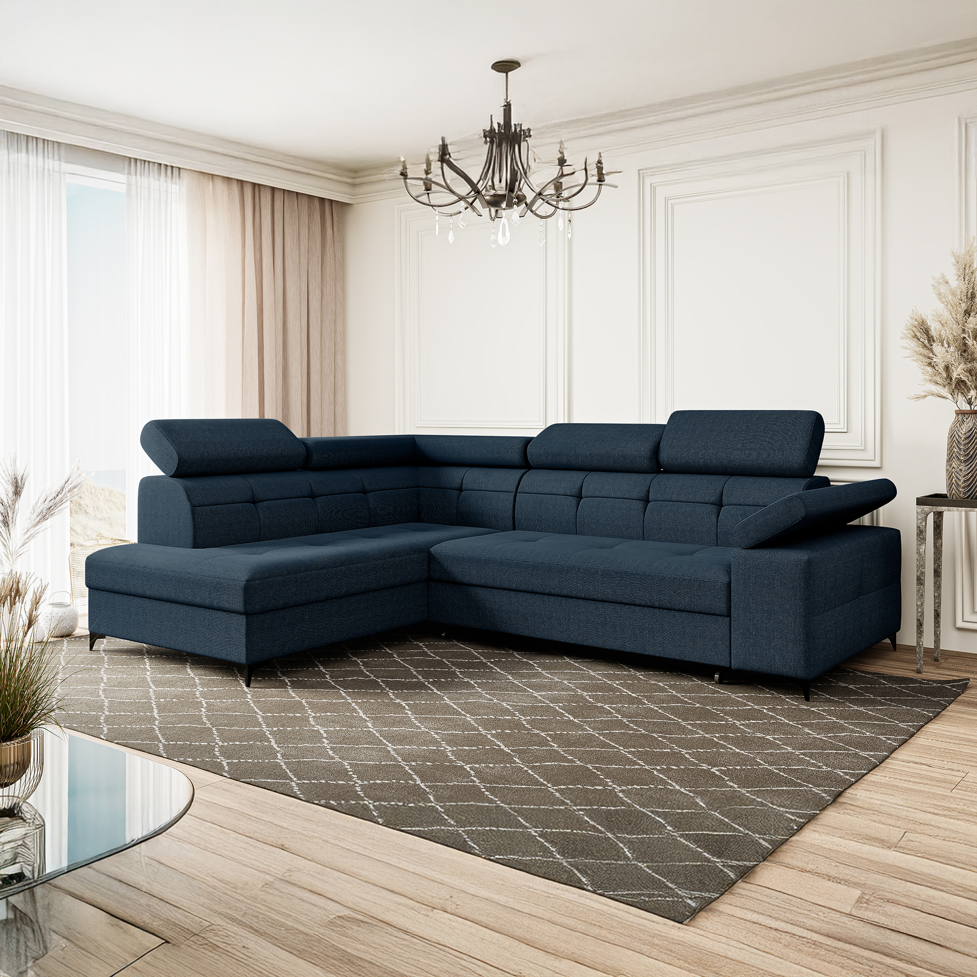 Narożnik granatowy rozkładany z regulowanym zagłówkiem BERGI