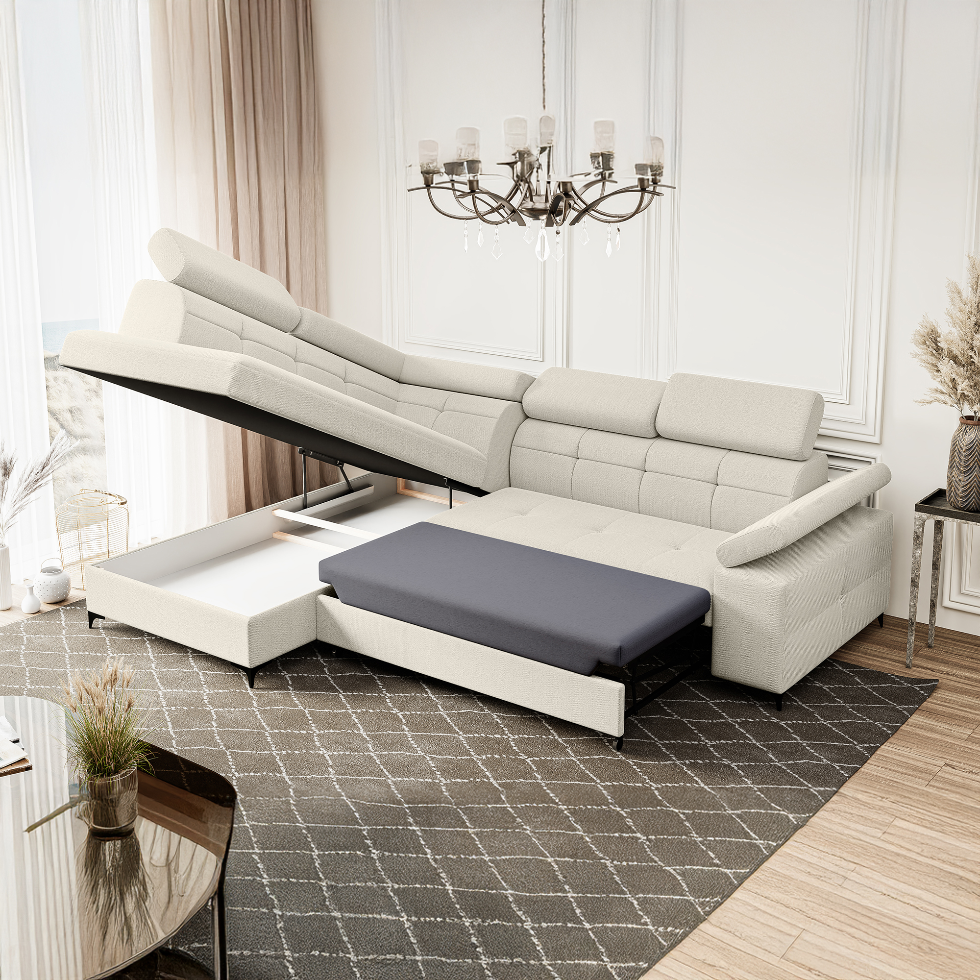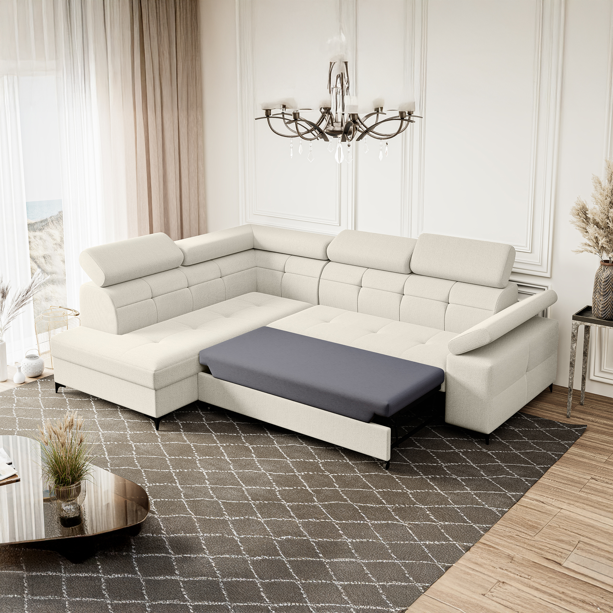 Narożnik kremowy rozkładany do pokoju dziennego BERGI