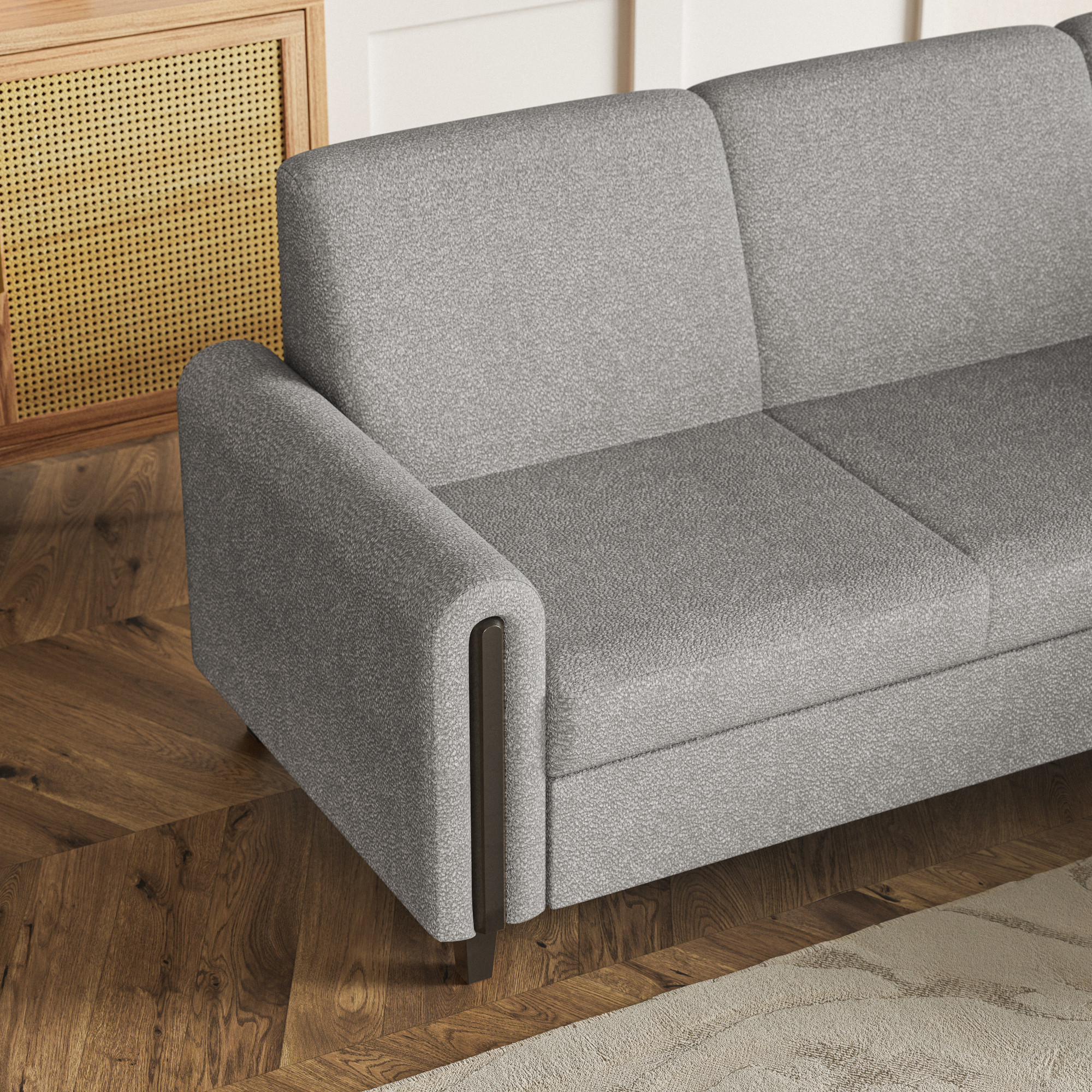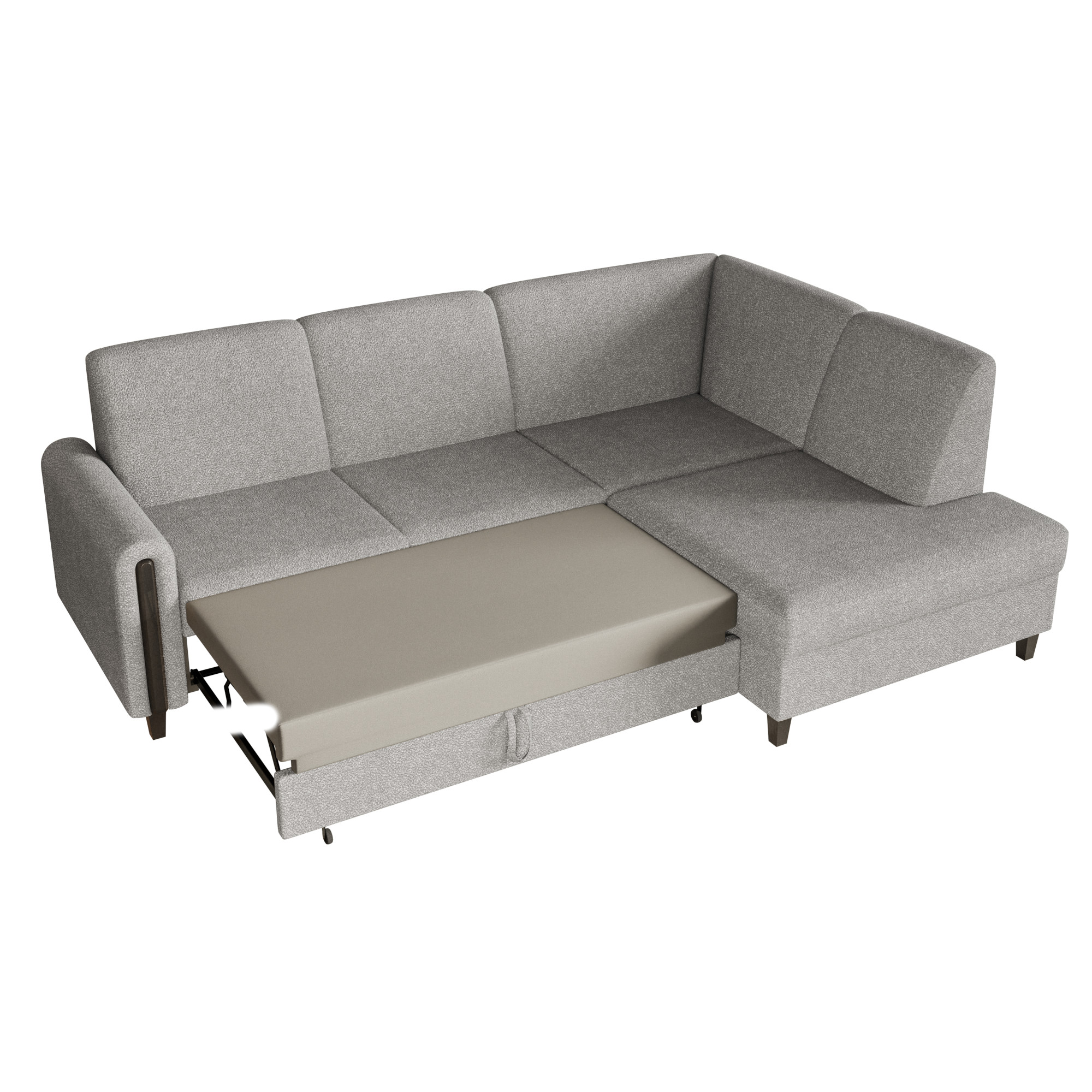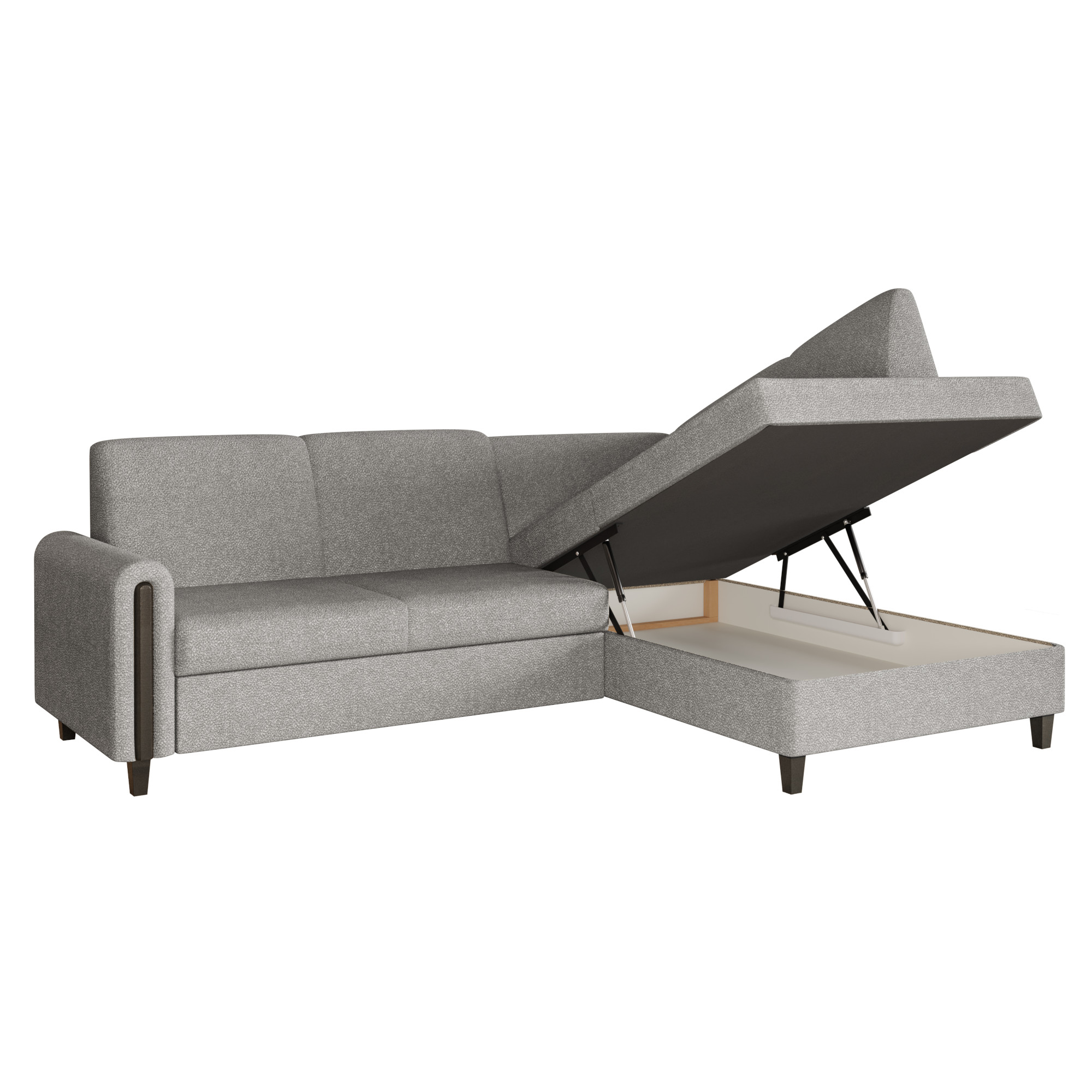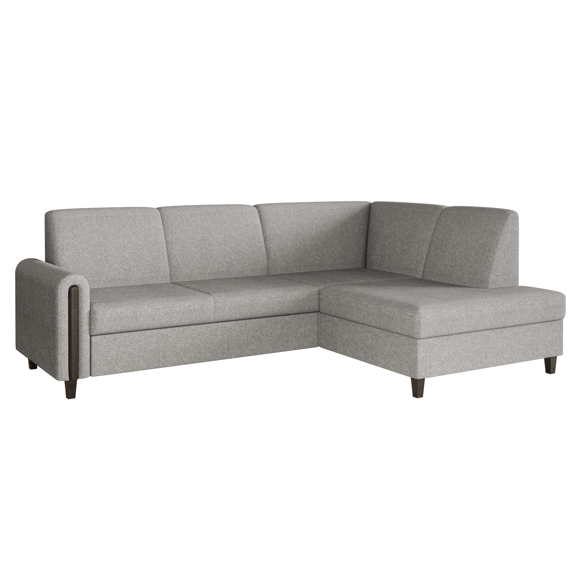Szary narożnik LAGI MAXI stanowi odzwierciedlenie aktualnych trendów, zamkniętych w praktycznym oraz estetycznie wyglądającym meblu. Dzięki możliwości wyboru strony łatwo dopasujesz go do układu swojego salonu. Sprężyna falista i pianka T-28 gwarantują wygodę podczas siedzenia i spania. Prosty mechanizm z wysuwanym wózkiem pozwala szybko przekształcić narożnik w przestronne łóżko, a pojemnik pod siedziskiem pomieści pościel i inne akcesoria. Całość uzupełniają stabilne nóżki w drewnopodobnym wykończeniu.