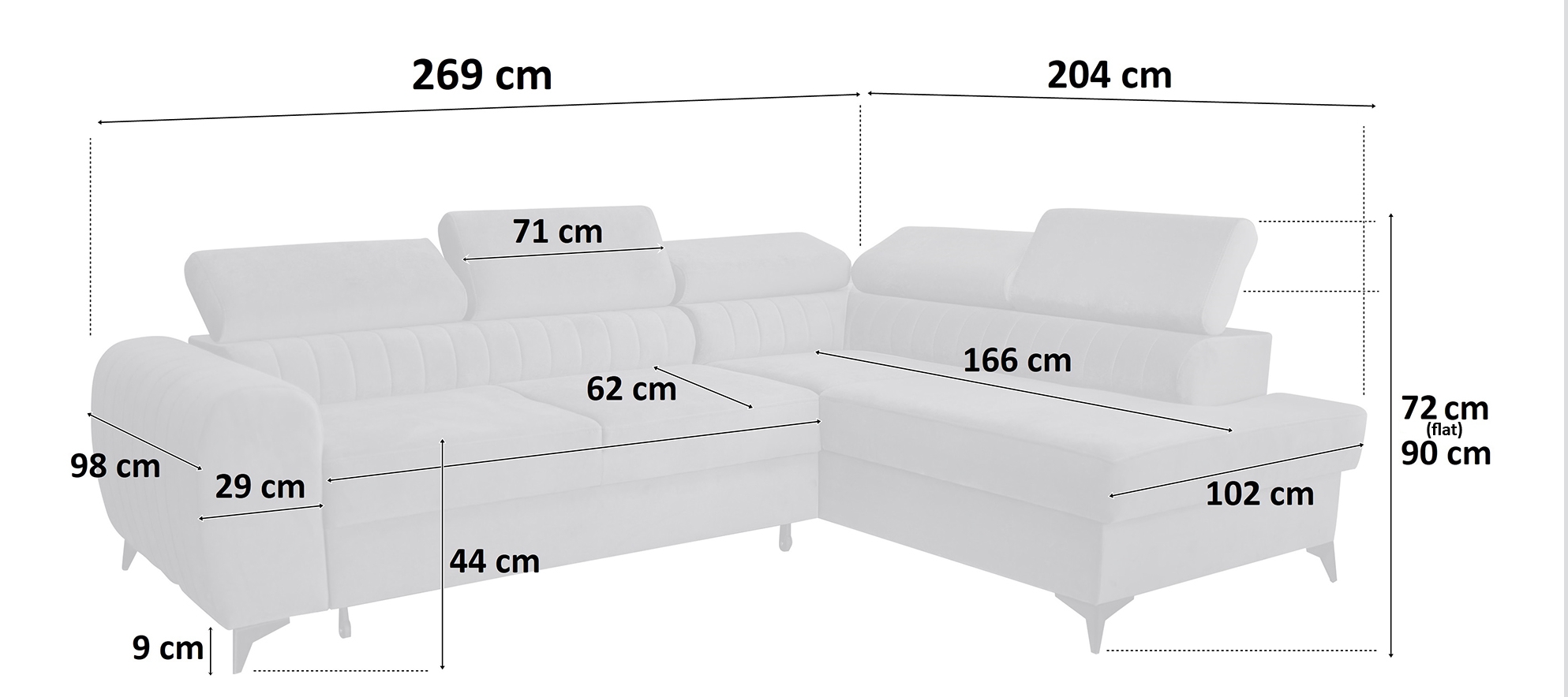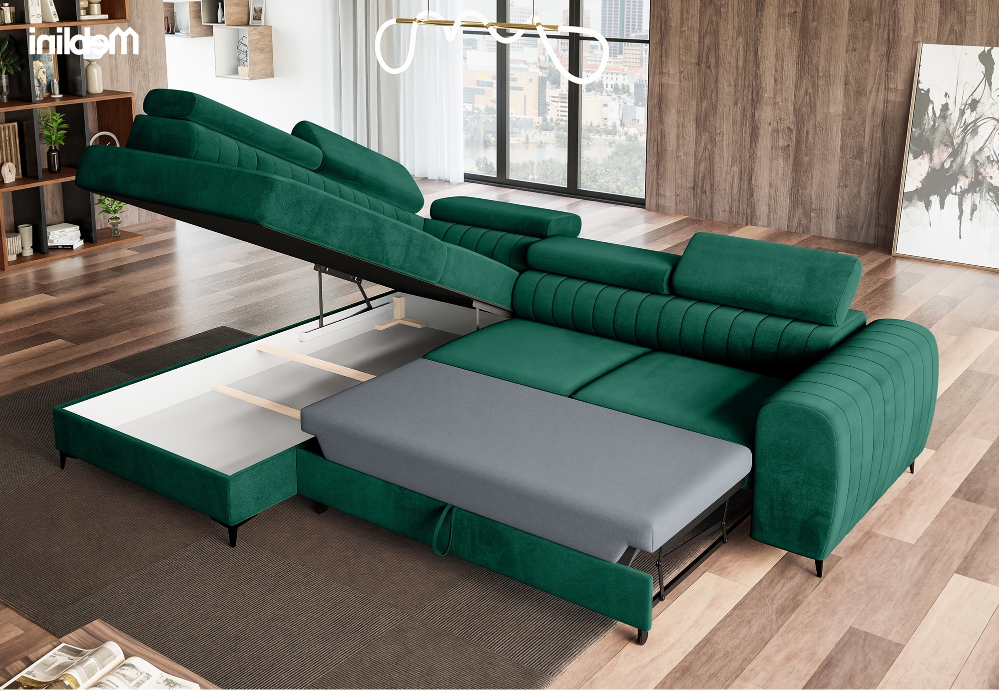 Jego konstrukcja zawiera skrzynię na pościel z mechanizmem sprężynowym, co sprawia, że przechowywanie pościeli czy innych przedmiotów jest nie tylko łatwe, ale też niezwykle wygodne. Sprężyna falista i pianka T-30 zapewnia niepowtarzalny komfort w trakcie codziennego użytkowania.Automat delfin z wysuwanym wózkiem na kółkach zapewnia łatwe rozkładanie i składanie narożnika.