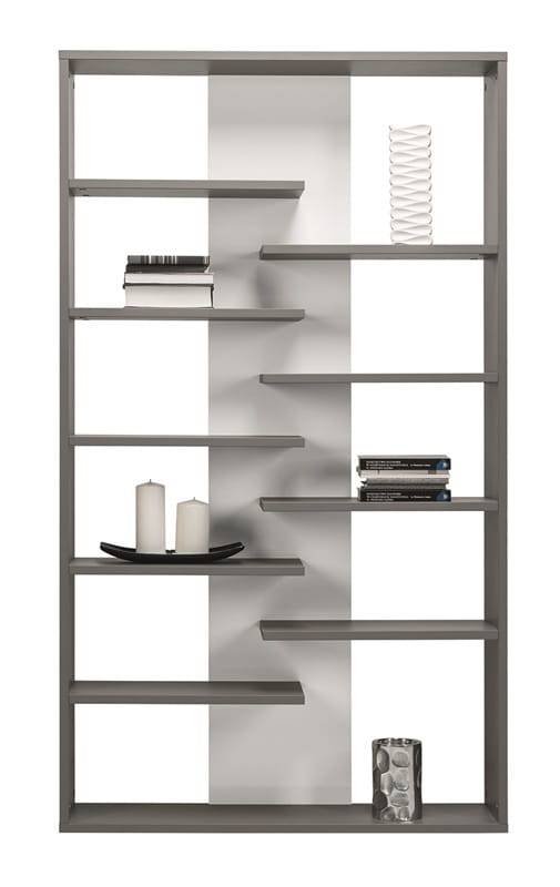 Nowoczesny regał MONDA w kolorze Popiel/Biały połysk, został wykonany z wysokiej jakości płyty laminowanej o grubości 16 mm. Płyty łączone są ze sobą za pomocą kołków drewnianych oraz łączy mimośrodkowych. Korpus każdego elementu został oklejony obrzeżem ABS.
