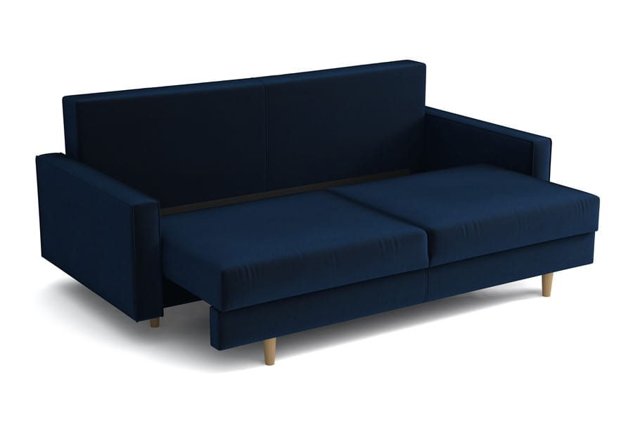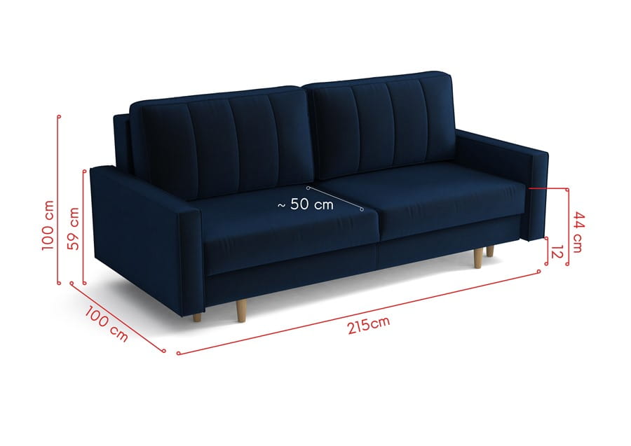 Elegancka sofka BLAU wniesie do Twojego salonu blask aksamitnego wyrafinowania. Jej urok skupia się wokół klasycznej konstrukcji oraz subtelnej dekoracji w postaci pionowych przeszyć na poduszkach oparcia. Ponadto kiedy się ją rozłoży, stanie się miejscem wygodnego spoczynku dla gości dzięki sprężynom bonellowym oraz piance poliuretanowej znajdującej się na całej powierzchni spania. Zastosowanie trzykomorowego wypełniania w dwóch poduszkach zamykanych na zamek, pozwoliło na dłuższe zachowanie ich kształtu oraz większy komfort ich użytkowania. Kolorystykę jak i rodzaj obicia mebla, dopasuj do stylu wnętrza, w którym stanie. Wybarwienie drewnianych nóżek możesz wybrać spomiędzy naturalnego-buku, orzechu, venge, białego. Małe rozmiary mebla umożliwiają jej łatwy transport nawet przy wykorzystaniu windy (zmieszczą się również w drzwiach o szerokości 80 cm). Charakter sofy BLAU pozwoli wykreować wygodną, emanującą szykownością przestrzeń.