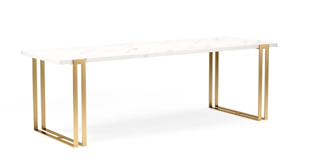 Nowoczesny stół Herten Złoty to idealne rozwiązanie dla osób ceniących niecodzienną funkcjonalność, który umożliwi przyjemne spędzenie wolnego czasu z domownikami. Masywna podstawa w kolorze złotym nadaje wnętrzu niespotykanego klimatu. Blat wykonany został z wysokiej jakości płyty laminowanej o grubości 36 mm, odpornej na zadrapania, zarysowania, uderzenia oraz wysokie temperatury. Płyta blatu może być wybarwiona na kilka kolorów, dzięki którym stół wpisze się w wystrój zarówno nowoczesnej jak i w bardziej klasycznej jadalni. Użycie specjalnych usztywniających prowadnic, oraz konstrukcja, jak i wysokiej jakości materiał z którego są wykonane nogi zapewnia bardzo dużą stabilność stołu.