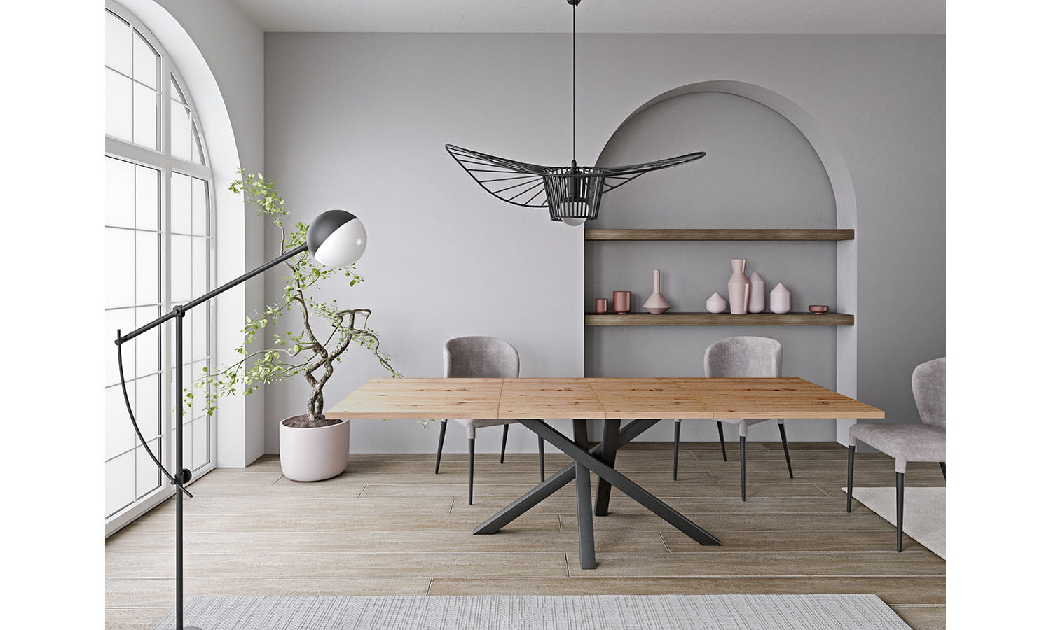 Stół CALI stworzony został z wysokiej jakości materiałów, dzięki czemu służyć będzie wiele lat. Geometryczne nogi wykonane z metalu, pomalowane zostały na kolor czarny metodą proszkową, co zwiększa żywotność wybarwienia. Blat, dzięki dodatkowej wkładce o długości 40 cm, rozkłada się do 160 cm powiększając przestrzeń roboczą.
