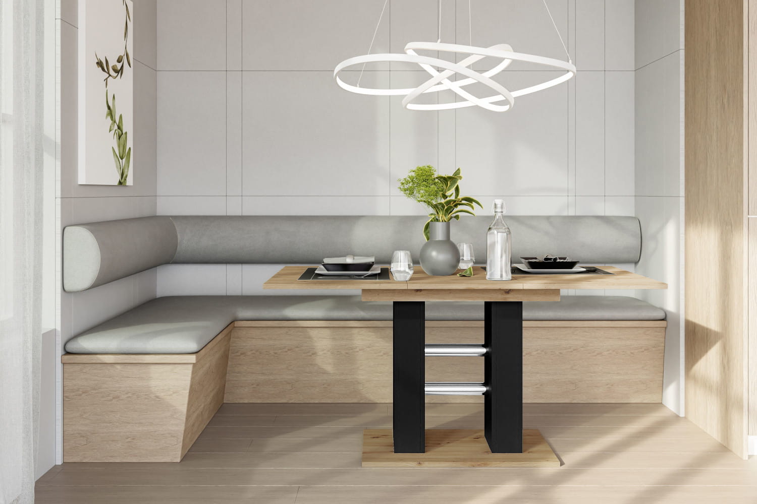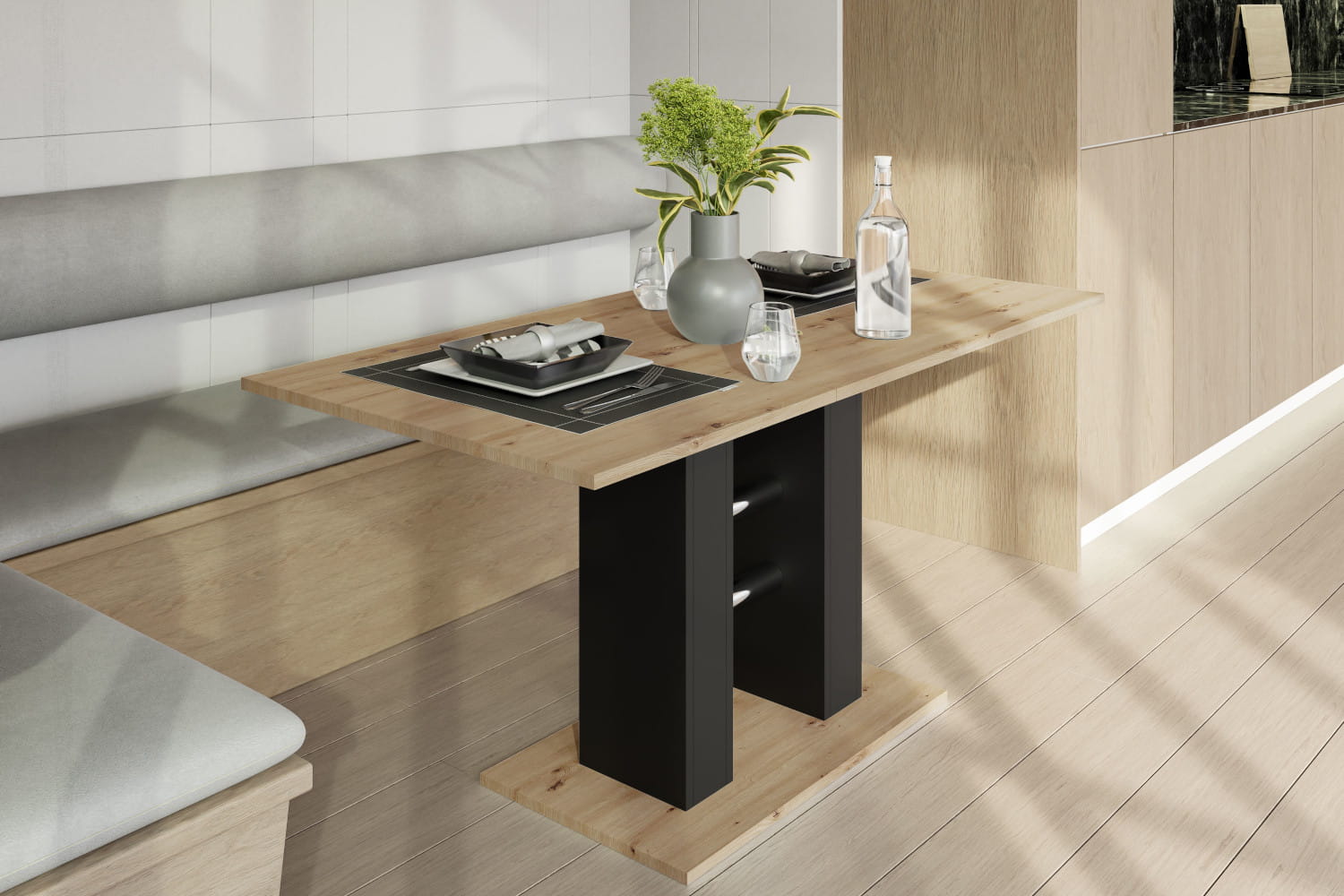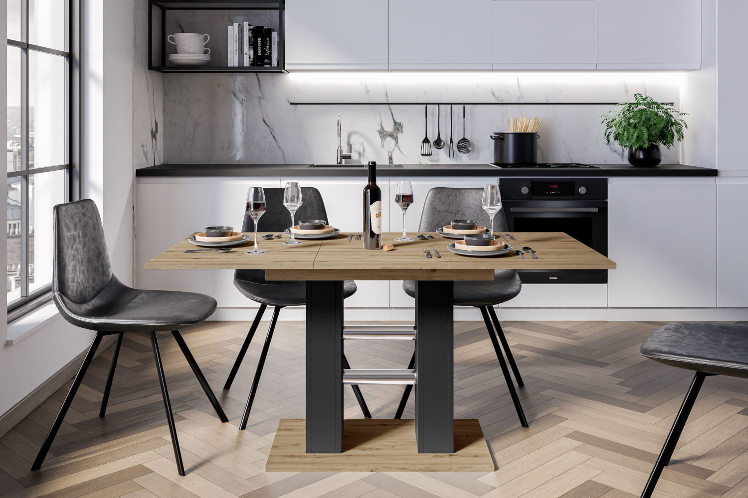 Blat stołu WILDIN MINI wykonano z pogrubionej płyty laminowanej w odcieniu dąb artisan. Kolor ten nadaje bryle naturalnego uroku, pozwalając na stworzenie przyjemnej atmosferę w każdym pomieszczeniu. Nogi stołu utrzymano w czarnym odcieniu, co dodaje kontrastu i nowoczesności całej konstrukcji. Największą zaletą tego modelu jest funkcja rozkładania. Pozwala ona na zwiększenie szerokości do 140 cm. Możliwość zwiększenia powierzchni blatu roboczego okaże się przydatna zwłaszcza w przypadku przyjmowania gości.