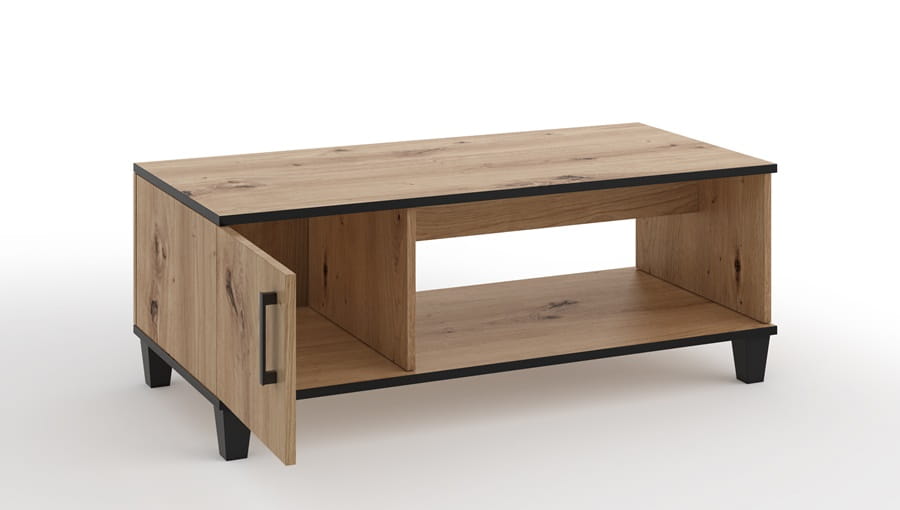 Niewielki stolik kawowy jest doskonałym elementem centrum spotkań towarzyskich, za które uchodzi salon lub pokój dzienny. Na jego bryłę, osadzoną na wyższych nóżkach, składa się półka oraz zamykana szafka, przydająca się przy przechowywaniu akcesoriów elektronicznych.