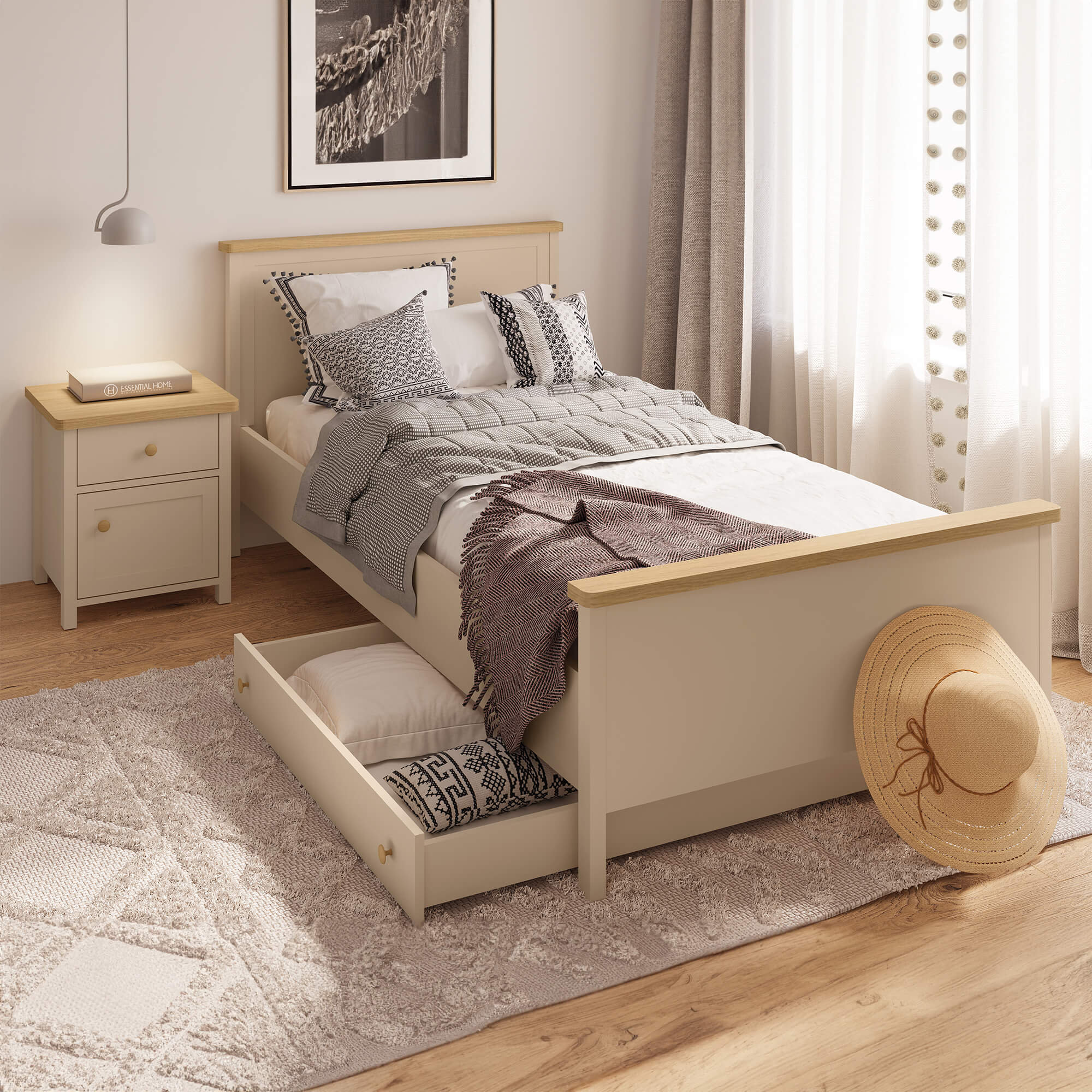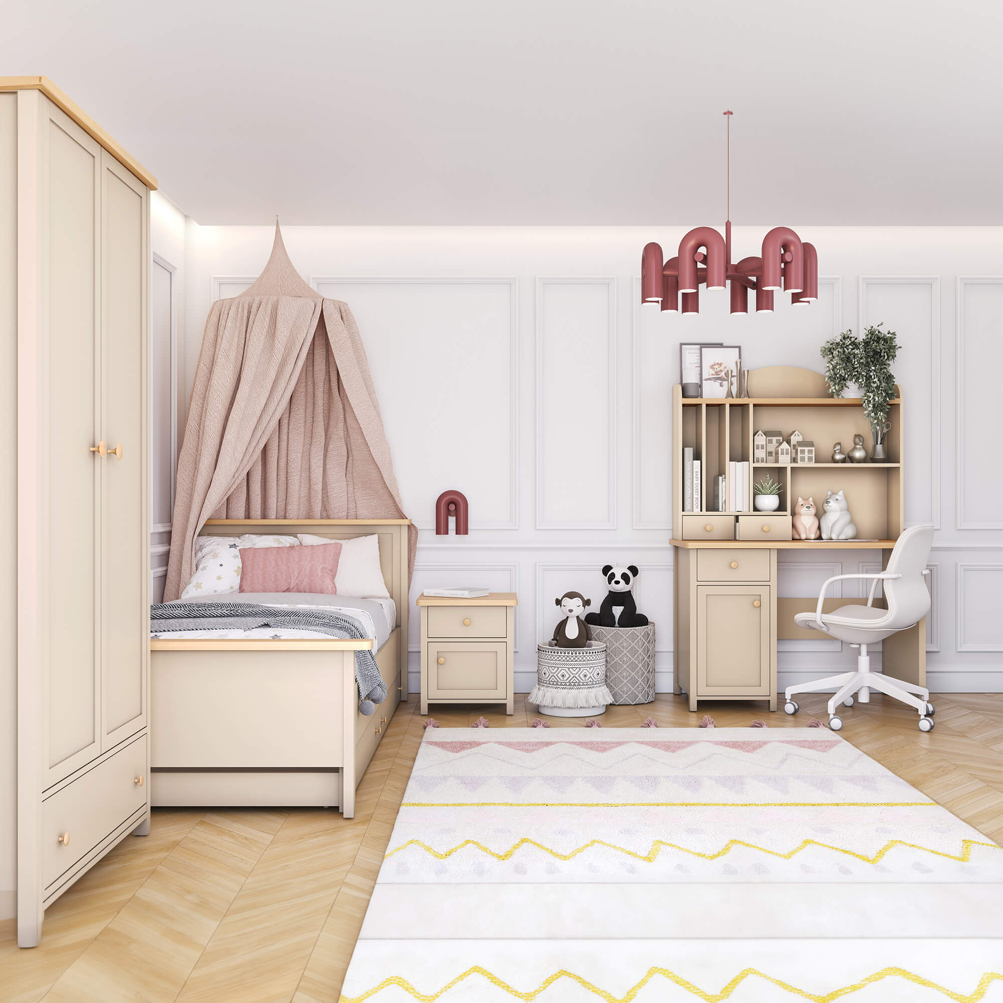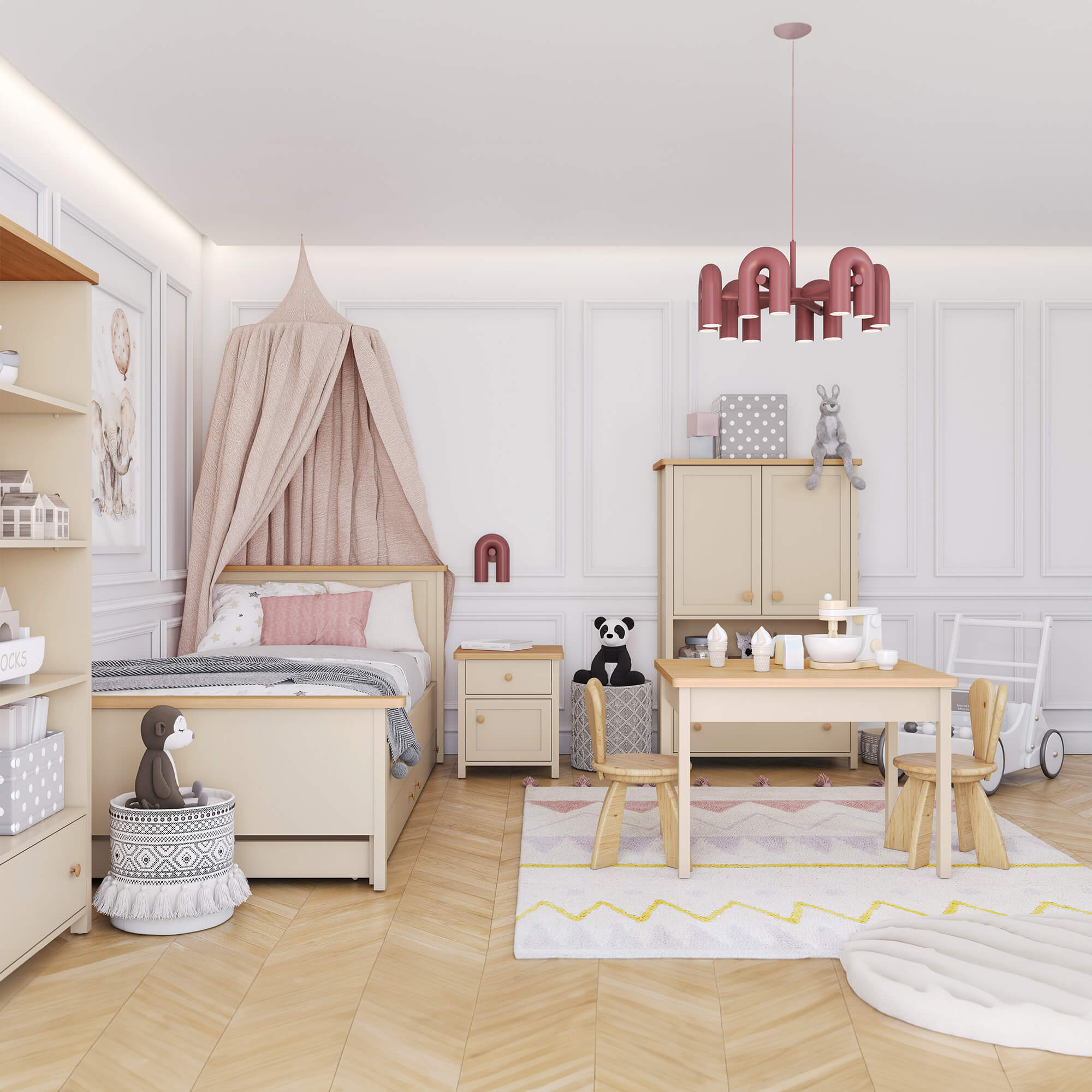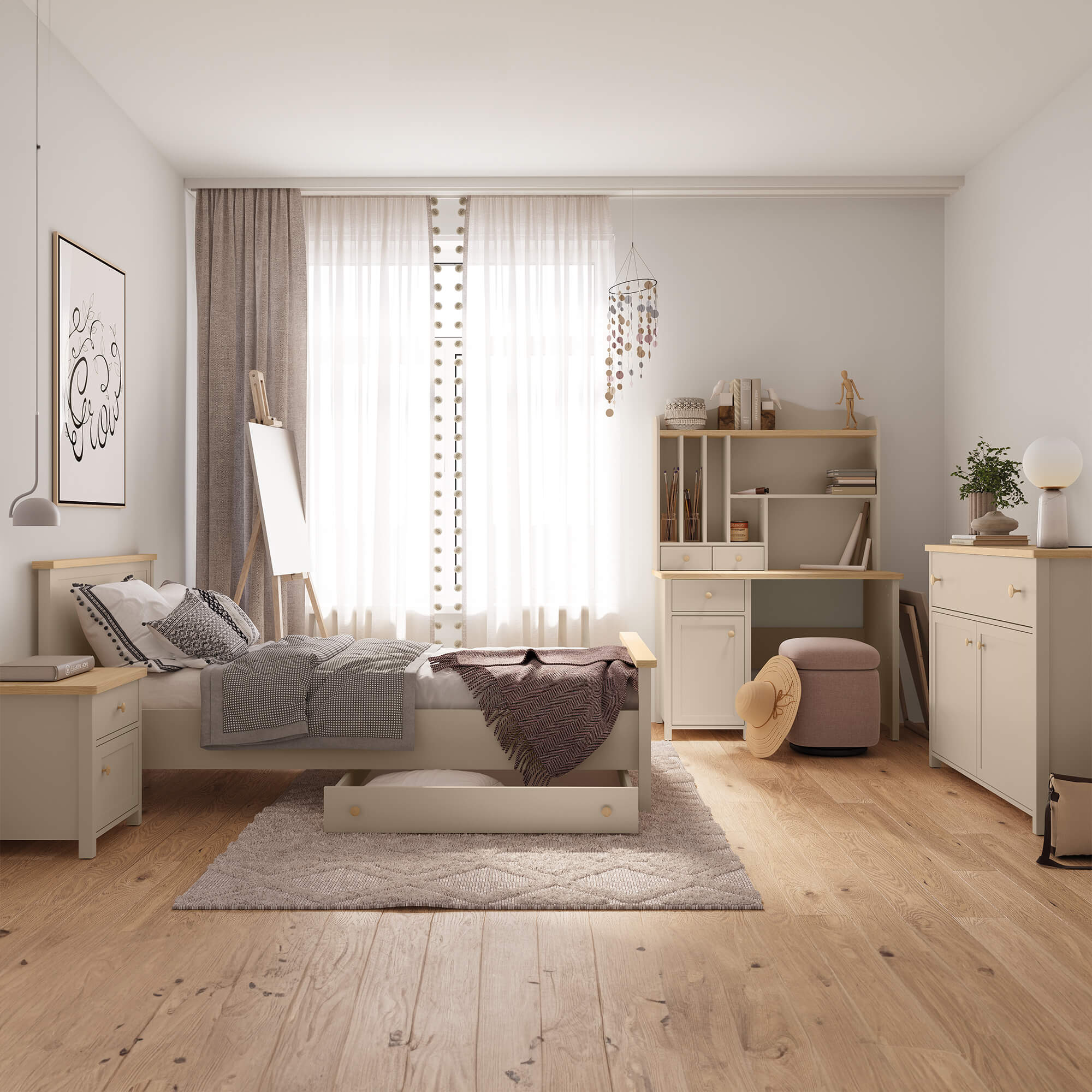 Szafka nocna STORY SO-07 w kolorze Beżu Piaskowego i Dębu Vincenza Bielona to praktyczny element wyposażenia, który świetnie sprawdzi się obok łóżka dziecka. Wyposażony w pojemną szufladę oraz szafkę, oferuje wygodne miejsce na przechowywanie najpotrzebniejszych drobiazgów - książki, okulary, ładowarka będą zawsze pod ręką. Minimalistyczna forma i trwała płyta laminowana idealnie wpisują się w nowoczesne aranżacje.