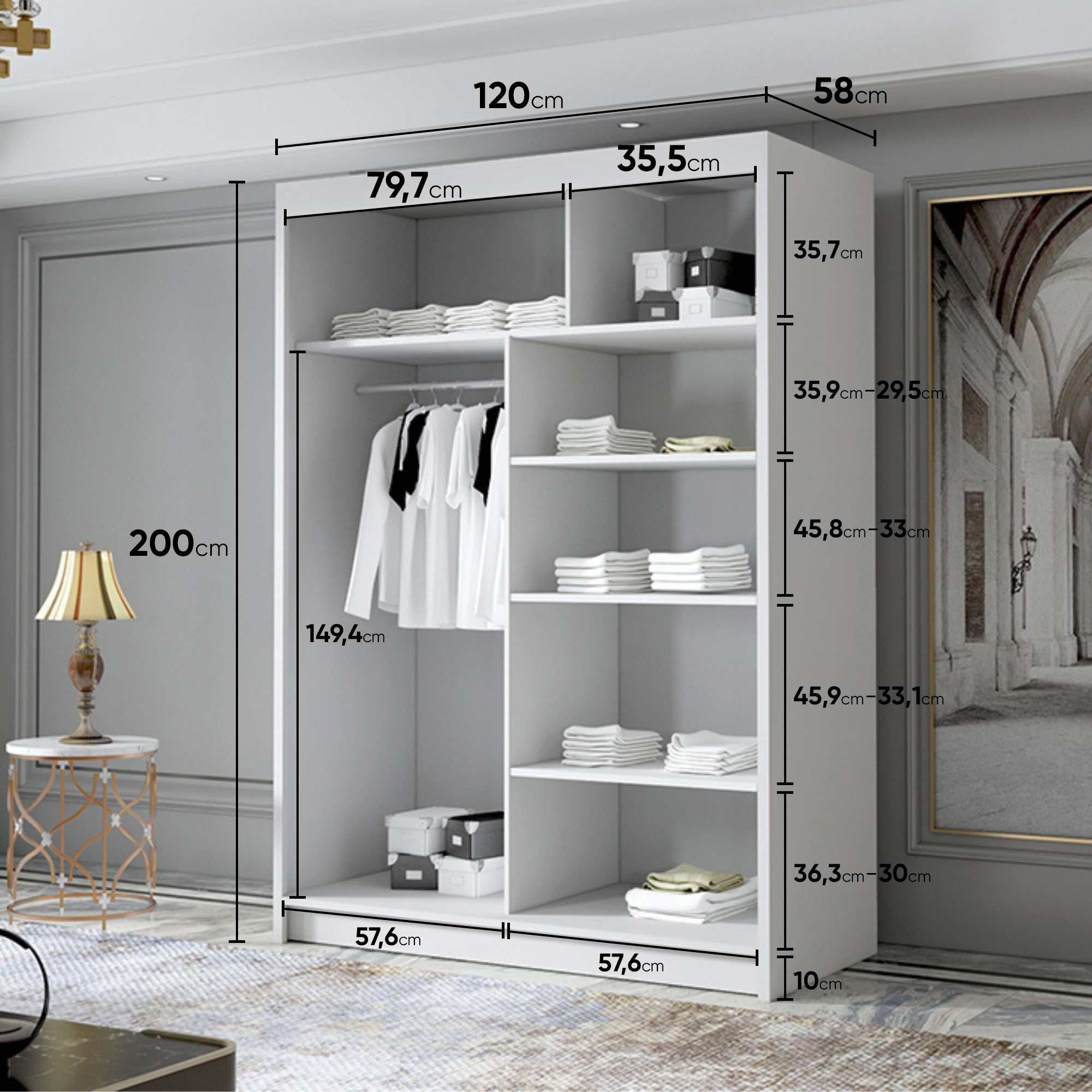 W środku znajduje się funkcjonalny układ półek oraz drążek na wieszaki, co pozwala na przechowywanie zarówno odzieży codziennej, jak i bardziej sezonowych elementów garderoby. Przemyślane rozplanowanie przestrzeni wewnętrznej sprawia, że łatwo utrzymać porządek i szybko znaleźć potrzebne rzeczy.