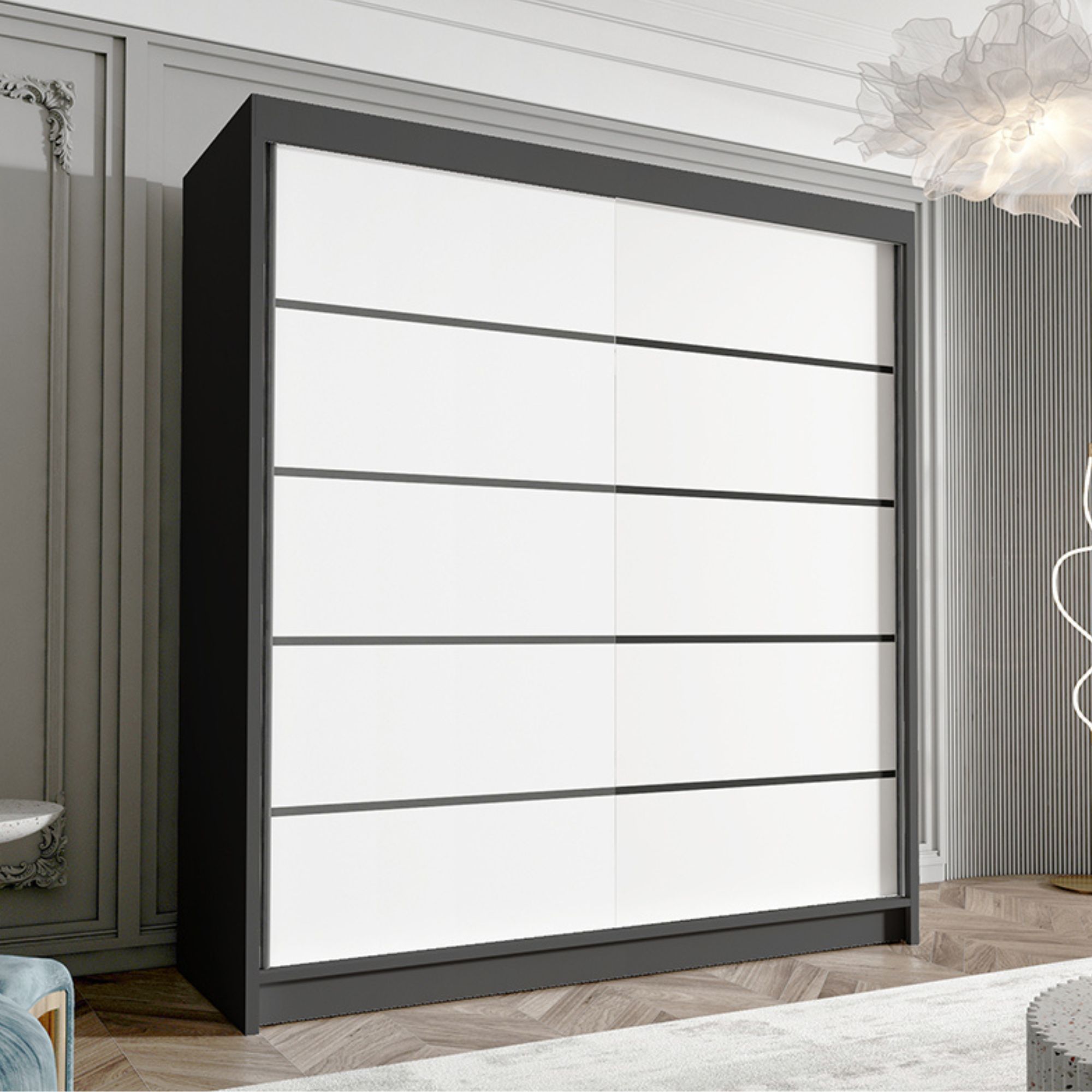 Szafa przesuwna HUGA wyróżnia się prostą, ale wyrazistą formą, która doskonale wpisuje się w nowoczesne wnętrza. Wyraziste detale i starannie dobrana kolorystyka dodają meblowi charakteru, jednocześnie zachowując jego uniwersalny wygląd.