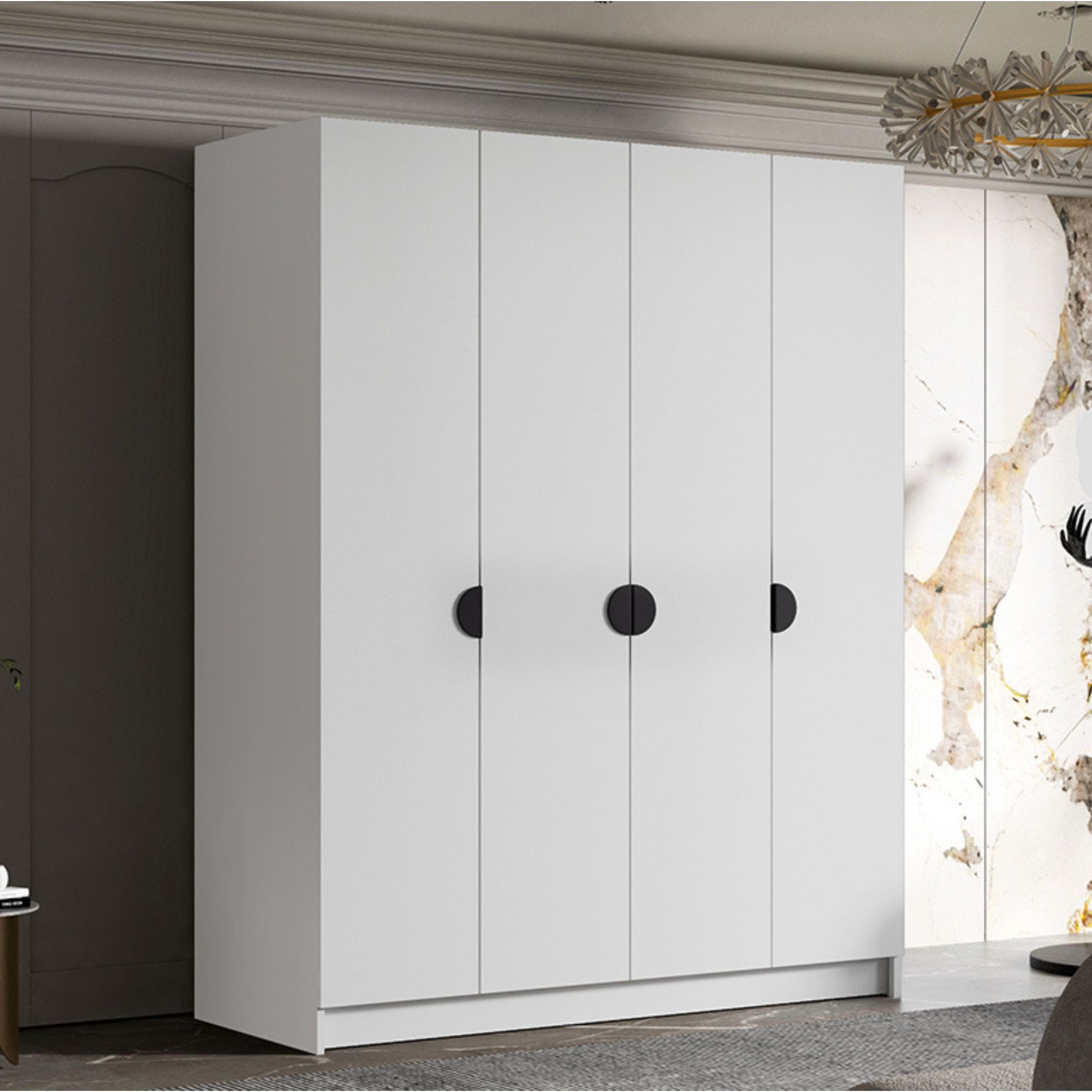 Szafa czterodrzwiowa DIANA o szerokości 200 cm, to elegancki i praktyczny mebel, który doskonale sprawdzi się zarówno w sypialni, jak i w garderobie czy przedpokoju. Jej nowoczesna forma, wykończona w uniwersalnej kolorystyce, świetnie komponuje się z różnymi stylami wnętrz — od minimalistycznych, po klasyczne. Charakterystyczne, okrągłe uchwyty nadają szafie unikalnego wyglądu i stanowią subtelny, dekoracyjny akcent. Duże wymiary zapewniają wyjątkową przestrzeń do przechowywania, dzięki czemu z łatwością uporządkujesz wszystkie elementy swojej garderoby.