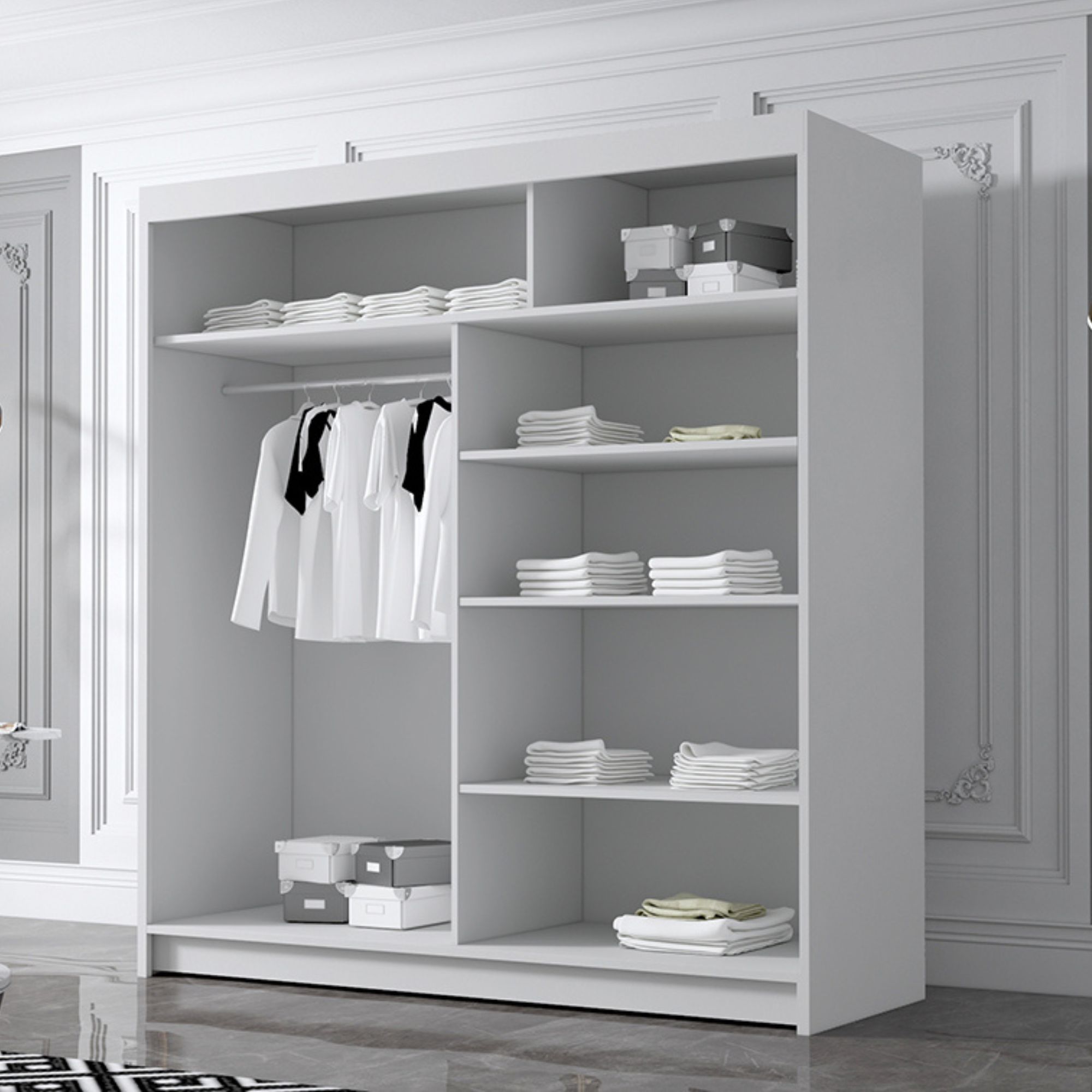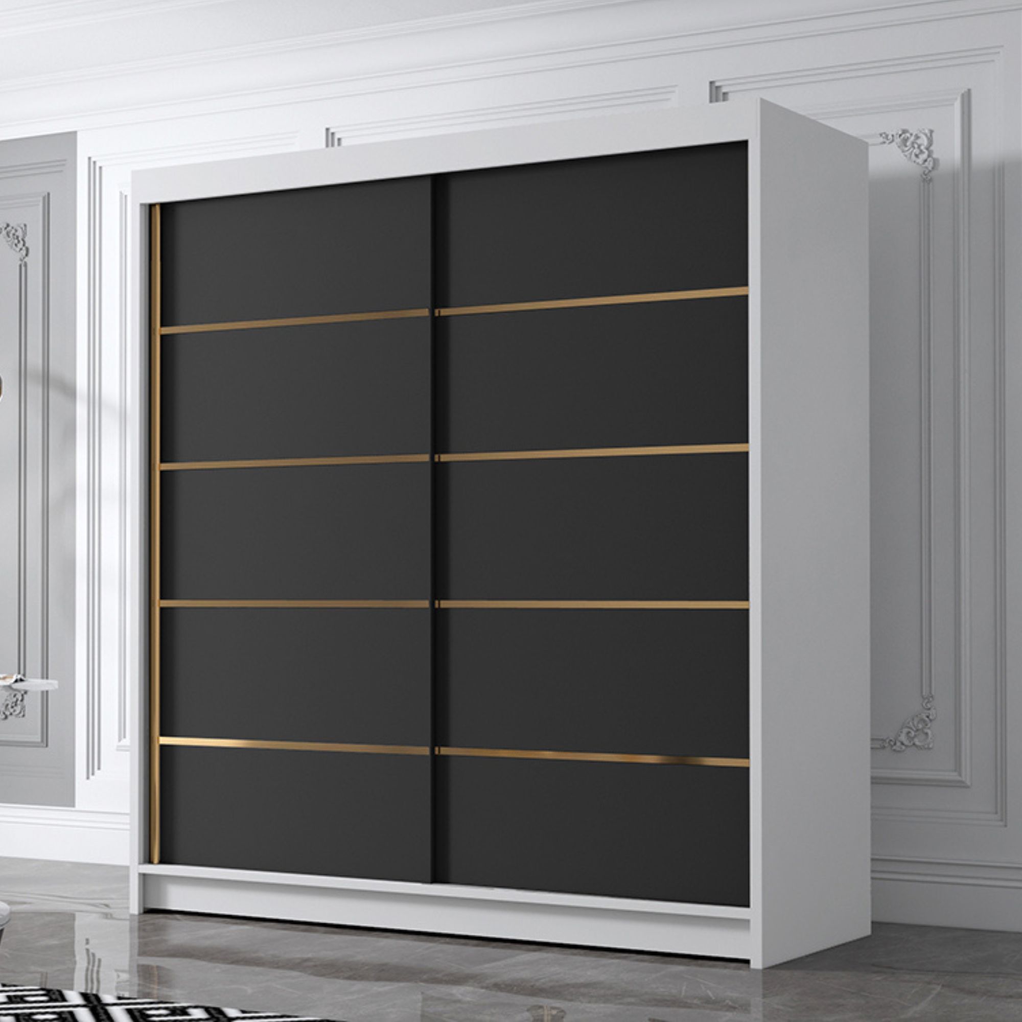 Przesuwne drzwi umożliwiają wygodne korzystanie z szafy, bez potrzeby pozostawiania dodatkowego miejsca na otwieranie. To praktyczne rozwiązanie dla osób ceniących porządek, styl i funkcjonalne rozwiązania. Model ten oferuje dużo przestrzeni do przechowywania – wewnątrz znajduje się układ półek oraz drążków na wieszaki, co pozwala na łatwą organizację garderoby.