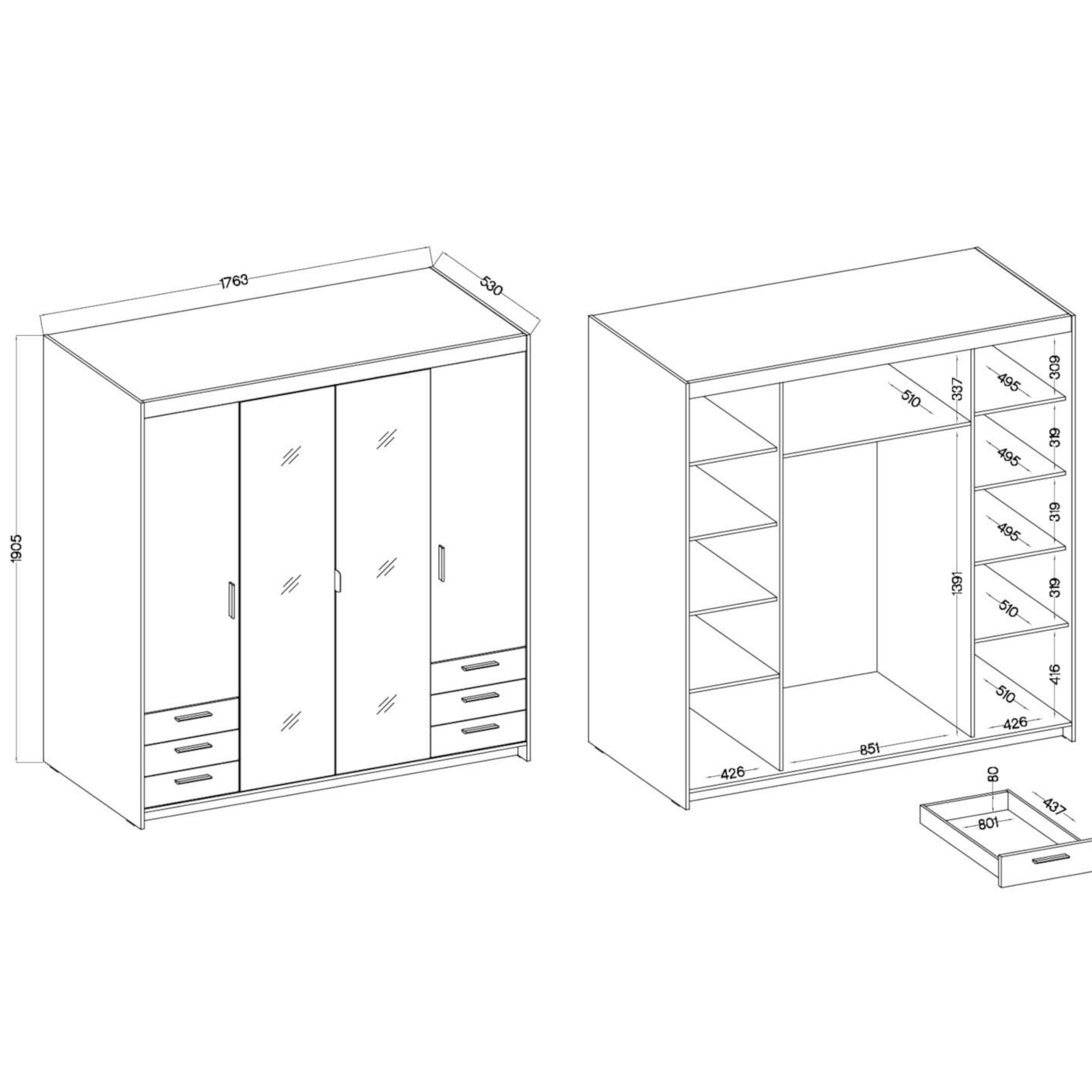 Szafa wyposażona jest w sześć praktycznych szuflad, które pozwalają na przechowywanie drobniejszych rzeczy, oraz liczne półki wewnętrzne, które umożliwiają uporządkowanie odzieży, obuwia czy innych akcesoriów. Czarne uchwyty kontrastują z białym kolorem szafy, nadając jej nowoczesny, stylowy charakter. To idealny mebel do sypialni, przedpokoju lub garderoby, łączący funkcjonalność z estetyką. Istnieje możliwość dokupienia nadstawki.