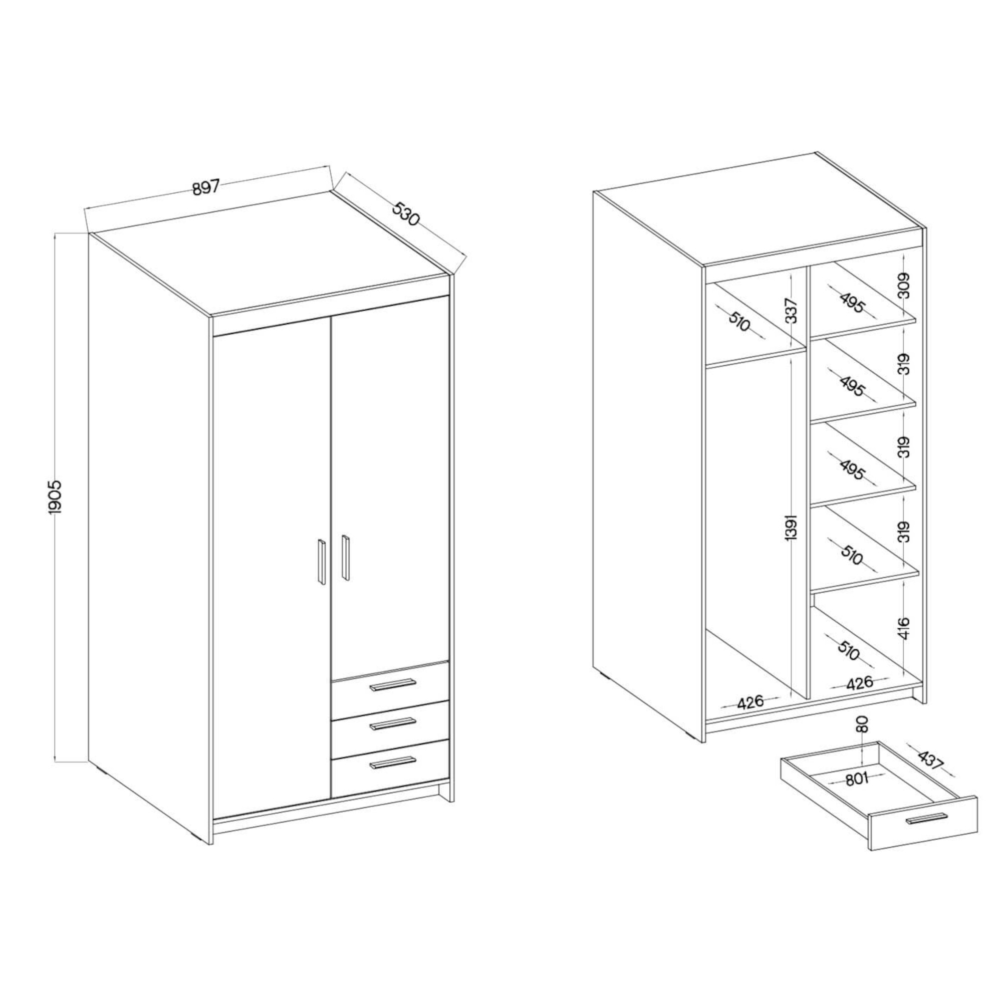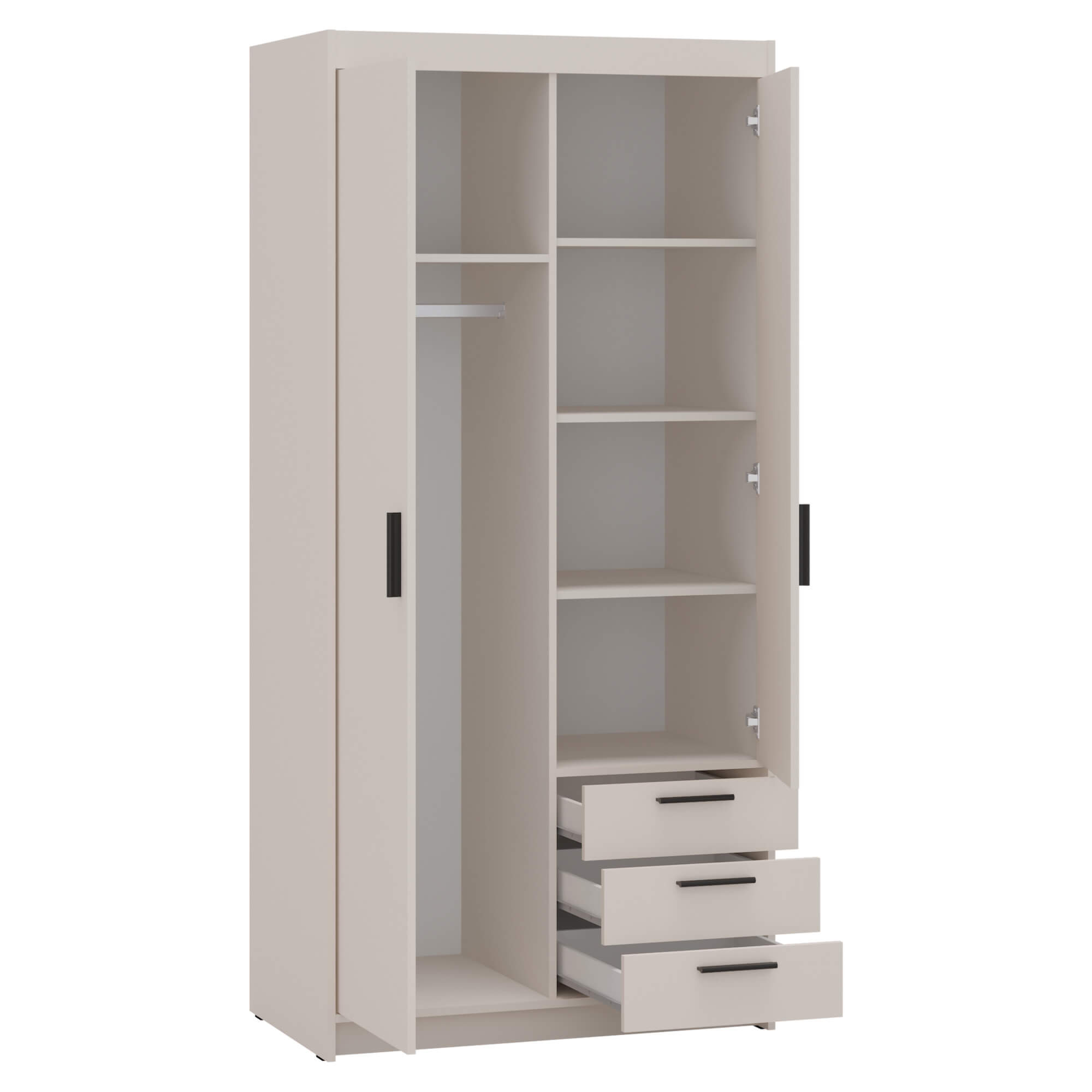 Szafa wyposażona jest w trzy pojemne szuflady, które pomogą w przechowywaniu mniejszych przedmiotów, takich jak bielizna czy akcesoria. Wewnątrz znajdują się półki oraz drążek, które umożliwiają wygodne wieszanie odzieży oraz organizację ubrań na różnych poziomach.