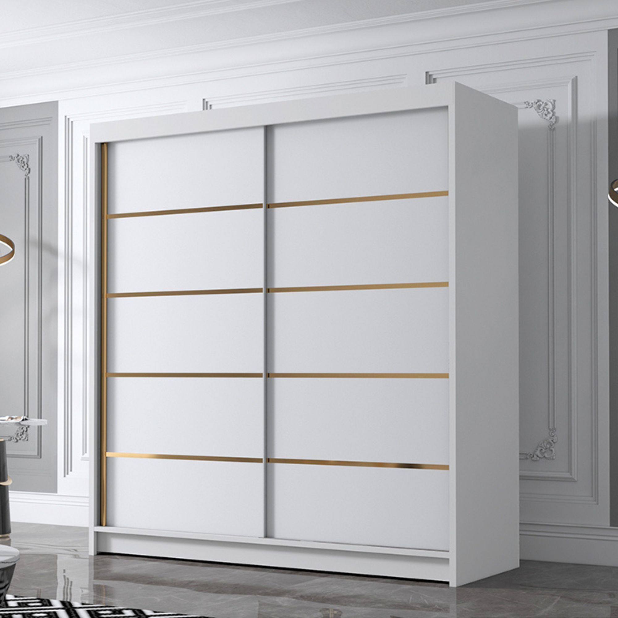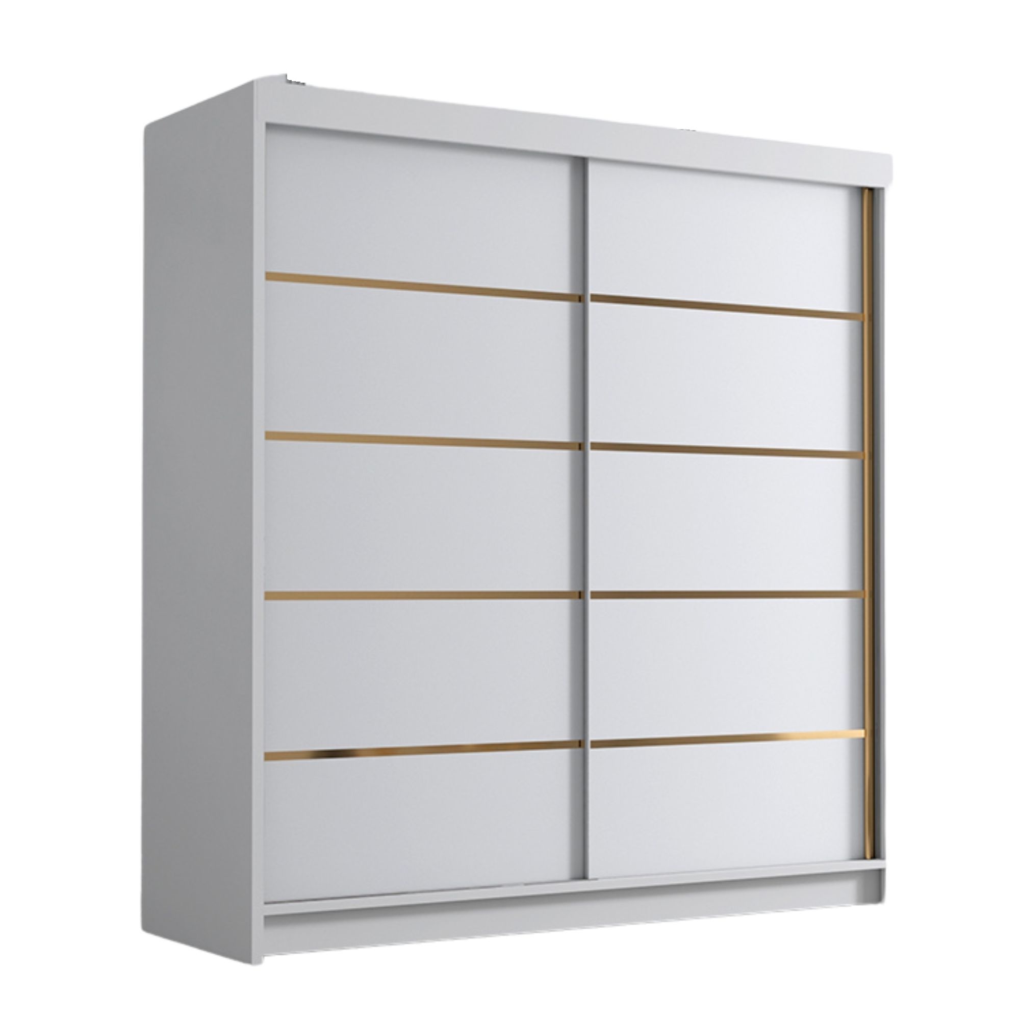 Przesuwne drzwi umożliwiają wygodne korzystanie z szafy, bez potrzeby pozostawiania dodatkowego miejsca na otwieranie. To praktyczne rozwiązanie dla osób ceniących porządek, styl i funkcjonalne rozwiązania. Model ten oferuje dużo przestrzeni do przechowywania – wewnątrz znajduje się układ półek oraz drążków na wieszaki, co pozwala na łatwą organizację garderoby.