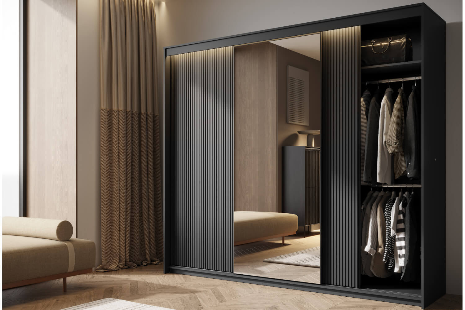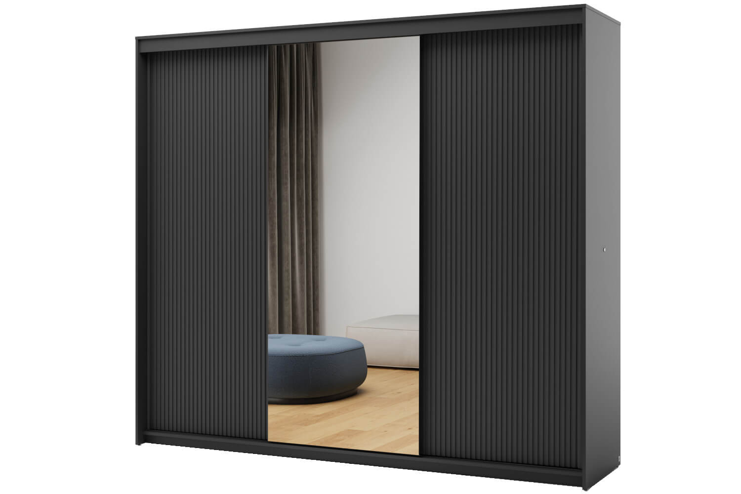 Szafa jest trzydrzwiowa, z unikalnym wykończeniem – boczne drzwi są ryflowane, co nadaje im niepowtarzalnego charakteru. Środkowe drzwi zostały wyposażone w duże lustro, które nie tylko pełni funkcję praktyczną, ale także optycznie powiększa przestrzeń, wprowadzając do wnętrza odrobinę światła.