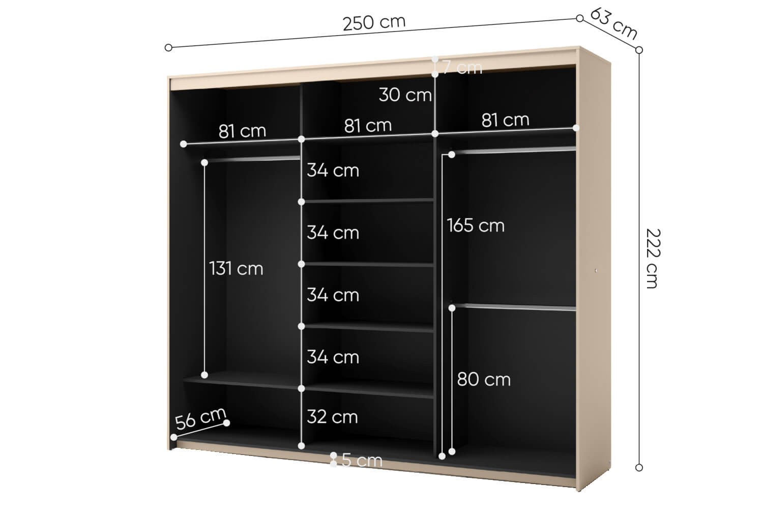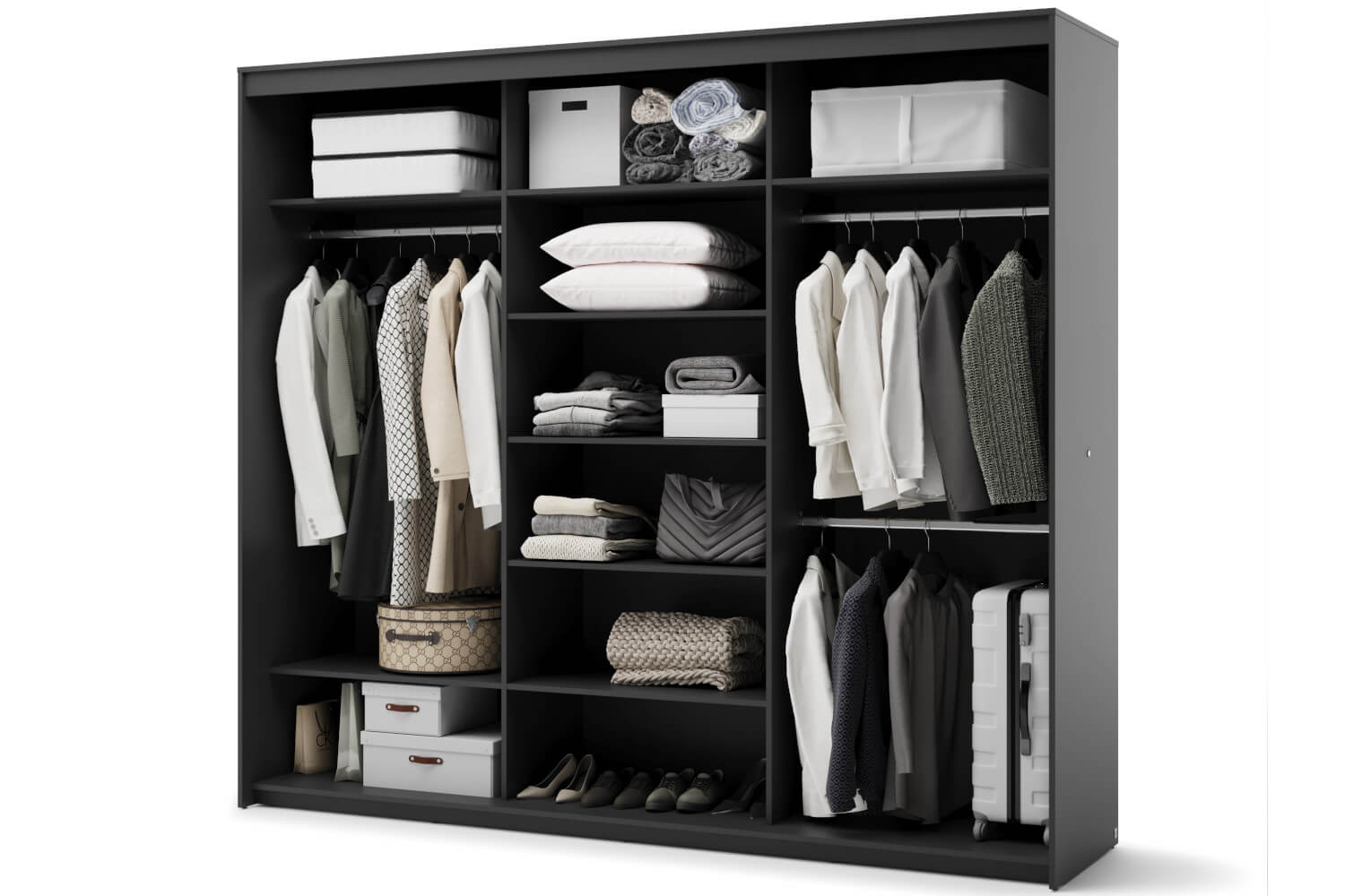 Wnętrze szafy TZ-02 zostało zaprojektowane z myślą o maksymalnej funkcjonalności. Zawiera dwa drążki na ubrania, które zapewniają miejsce na zawieszenie odzieży wierzchniej. Szereg półek, idealnych do przechowywania ubrań, bielizny czy innych przedmiotów użytku codziennego. Model ten dodatkowo wyposażono w oświetlenie LED, które poprawia komfort użytkowania