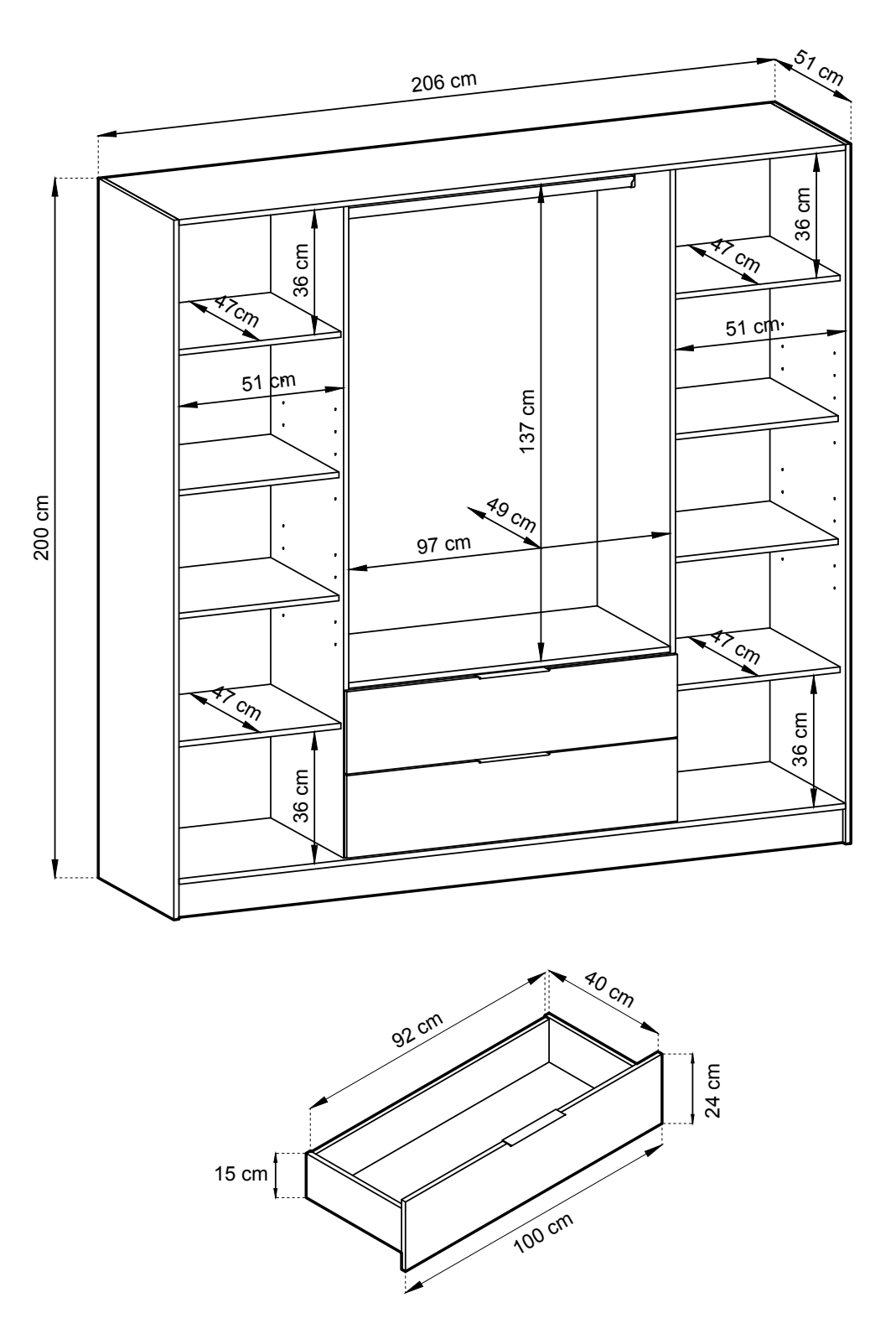 - wyposażenie podstawowe: dwie szuflady, drążek, osiem półek