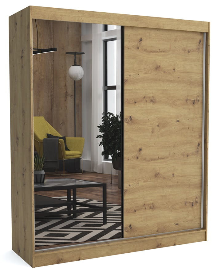 Uniwersalna szafa JONA 180 cm to produkt, który będzie pasował do każdego rodzaju pomieszczeń. Zarówno do sypialni, przedpokoju, salonu czy pokoju dziecięcego. Prosty wygląd, standardowe wymiary oraz ciekawa kolorystyka przypadnie do gustu każdemu posiadaczowi. Podstawowe wyposażenie szafy pozwoli pomieścić wszytko to, co powinno się znajdować w osobnej garderobie. Na drążku znajdzie się miejsce na okrycia wierzchnie, suknie wieczorowe czy wyprasowane koszule, zaś na półkach możemy umieścić poskładaną odzież, ręczniki czy pościel. Górne wnęki ułatwią przechowywanie pudeł z rzeczami, po które bardzo rzadko się sięga. Wysokojakościowy system jezdny, usprawni korzystanie z produktu, nawet w sytuacjach gdy jesteśmy już spóźnieni na ważne spotkanie. Szafę wykonano z płyty laminowanej o grubości 16mm, a obrzeża wzmocniono odporną na uszkodzenia mechaniczne okleiną ABS.