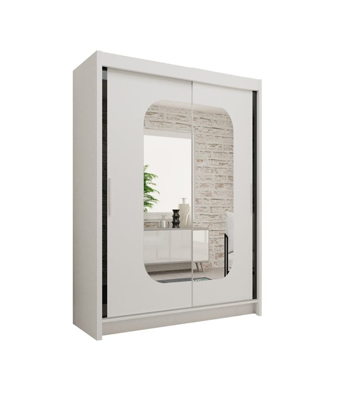 Szafa ARIKA to mebel o nowoczesnym designie, który idealnie wpasuje się we wnętrze sypialni, przedpokoju czy pokoju młodzieżowego. Nietypowy kształt lustra oraz wstawki ze szkła lacobel niewątpliwie przyciągają uwagę każdego. Na funkcjonalne wnętrze szafy składają się półki oraz dwa drążki.