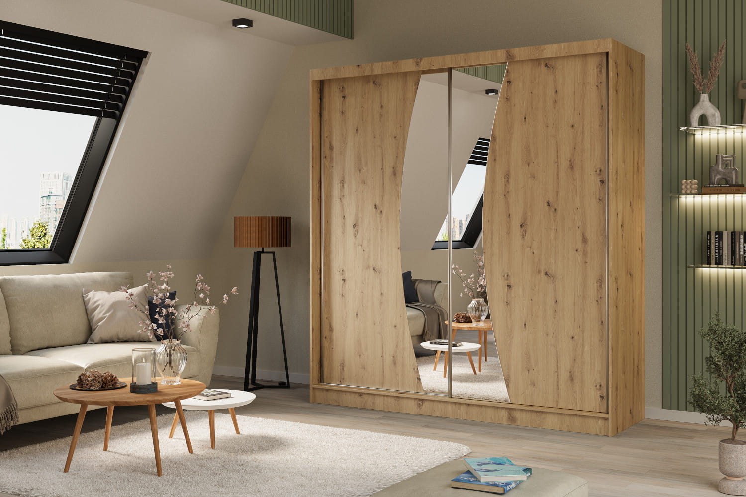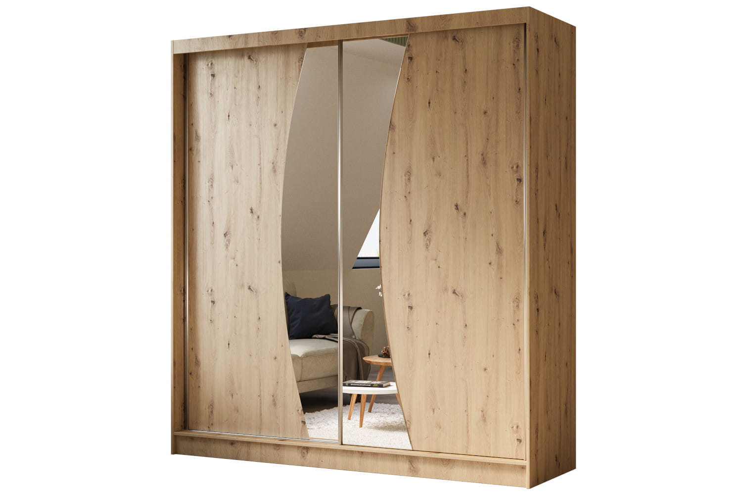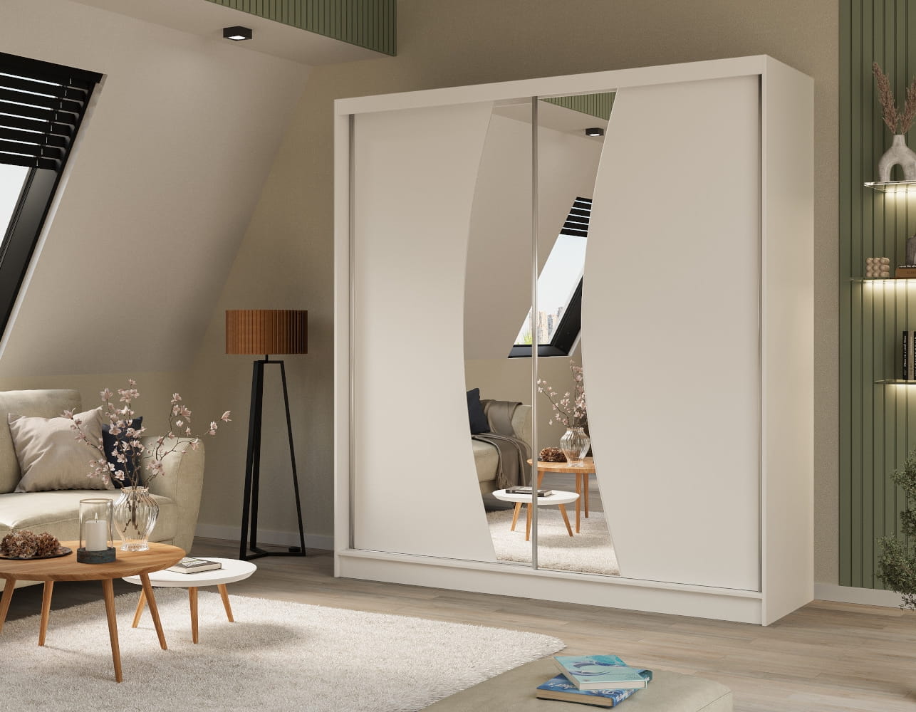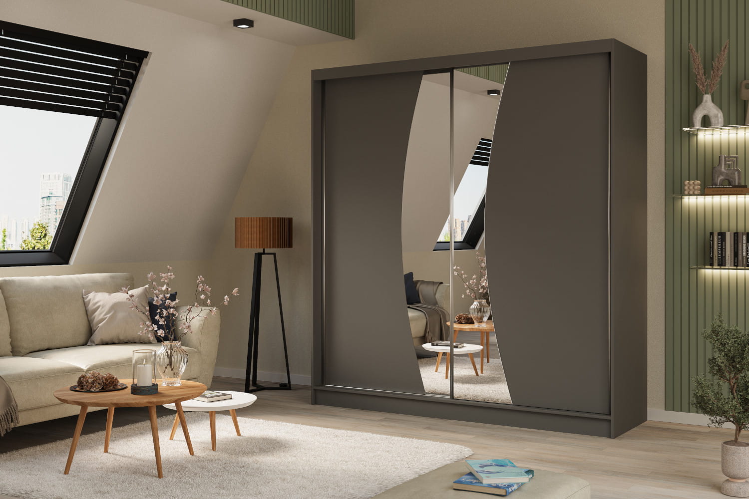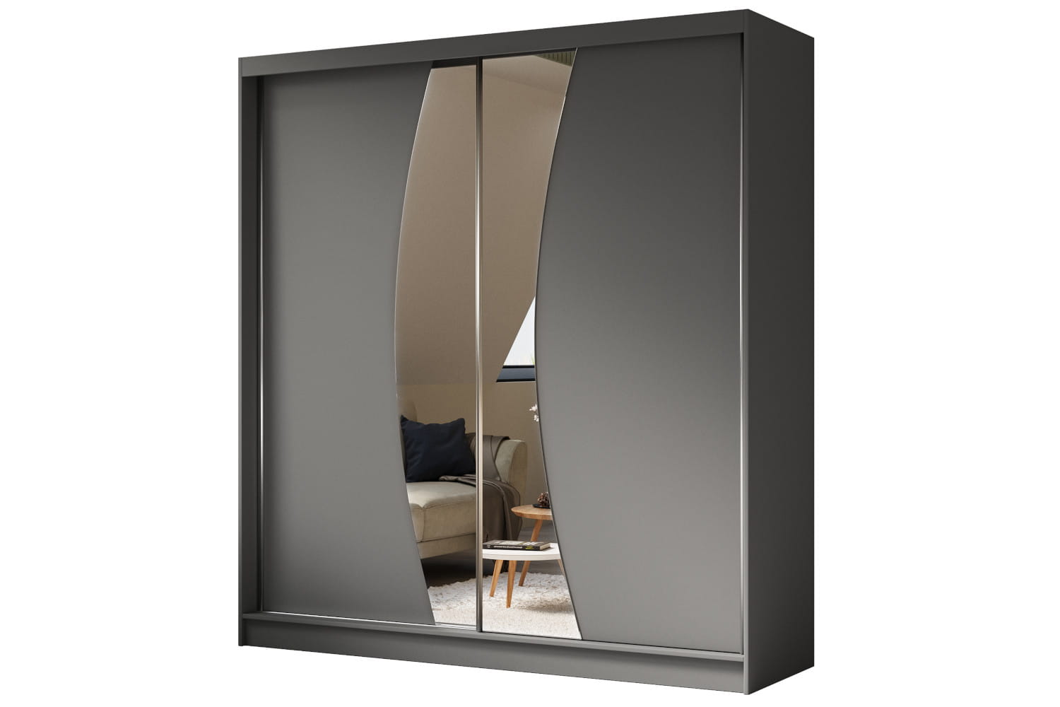 Szafy WOX charakteryzują się ciekawie wyciętym lustrem zdobiącym fronty. Element ten świetnie współgra z dostępnymi opcjami kolorystycznymi odzwierciedlającymi uniwersalne oraz topowe wybarwienia. Postawienie na przesuwne drzwi sprawi, że użytkowanie szafy stanie się komfortowe. Te zaś skrywają wewnętrzny układ składający się z drążka i półek na ubrania oraz pozostałe elementy garderoby.