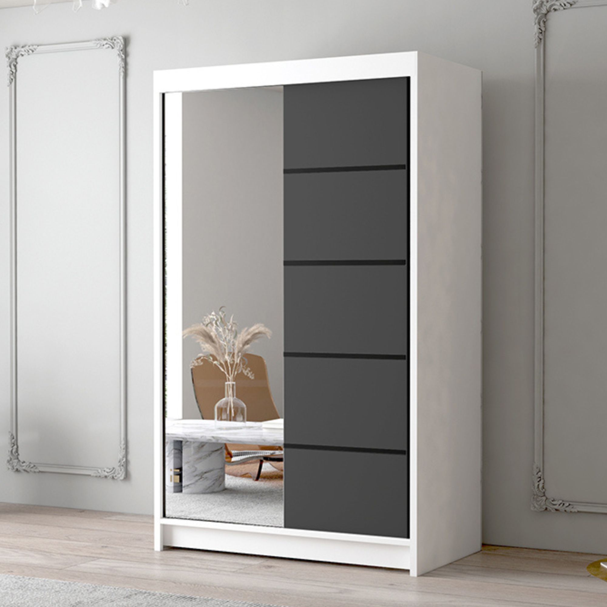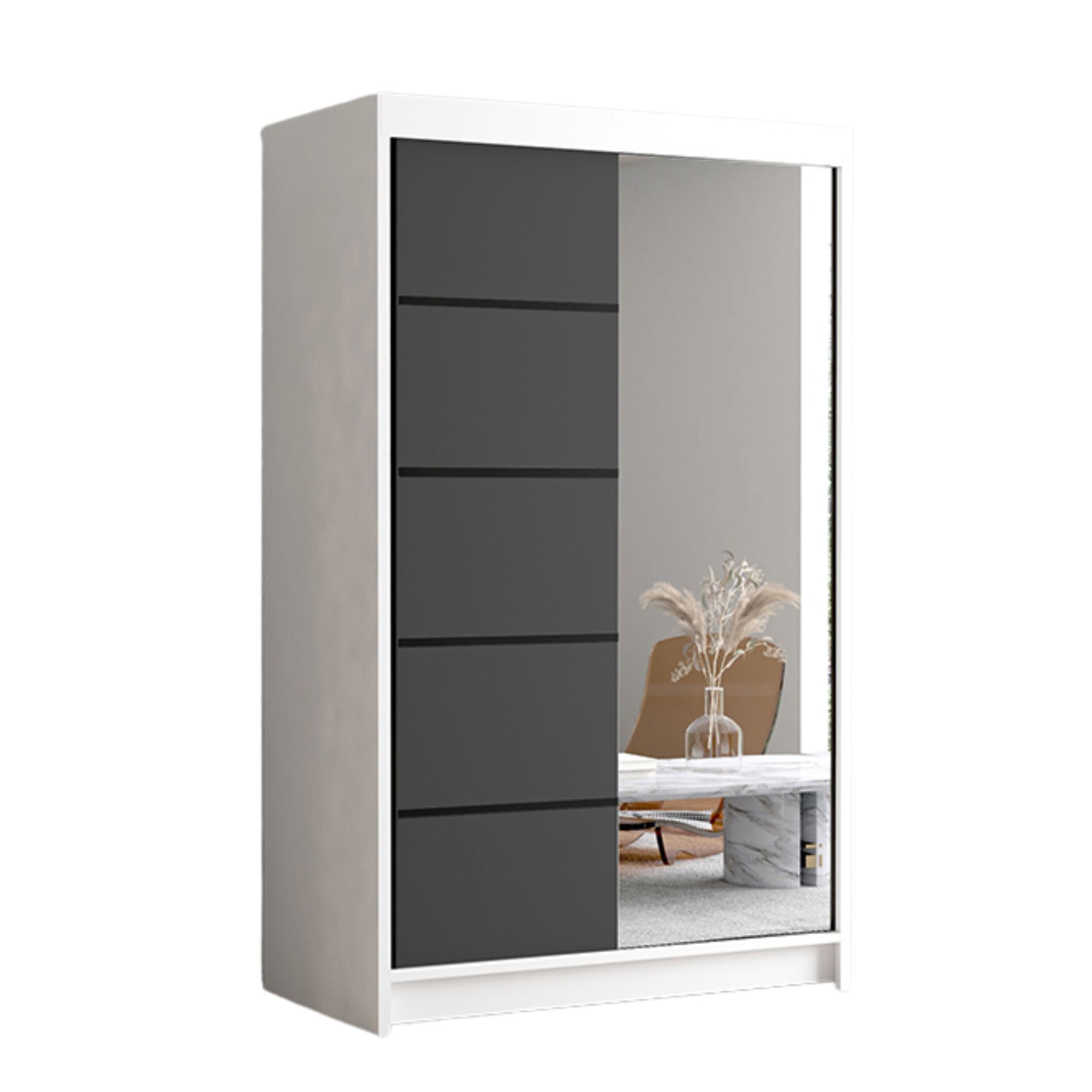 Szafa FIDO 120 cm to kompaktowy i stylowy mebel, który świetnie sprawdzi się w mniejszych pomieszczeniach, takich jak sypialnie, korytarze czy pokoje młodzieżowe. System prowadnic zapewnia płynne, ciche przesuwanie drzwi, co zwiększa wygodę każdego dnia.