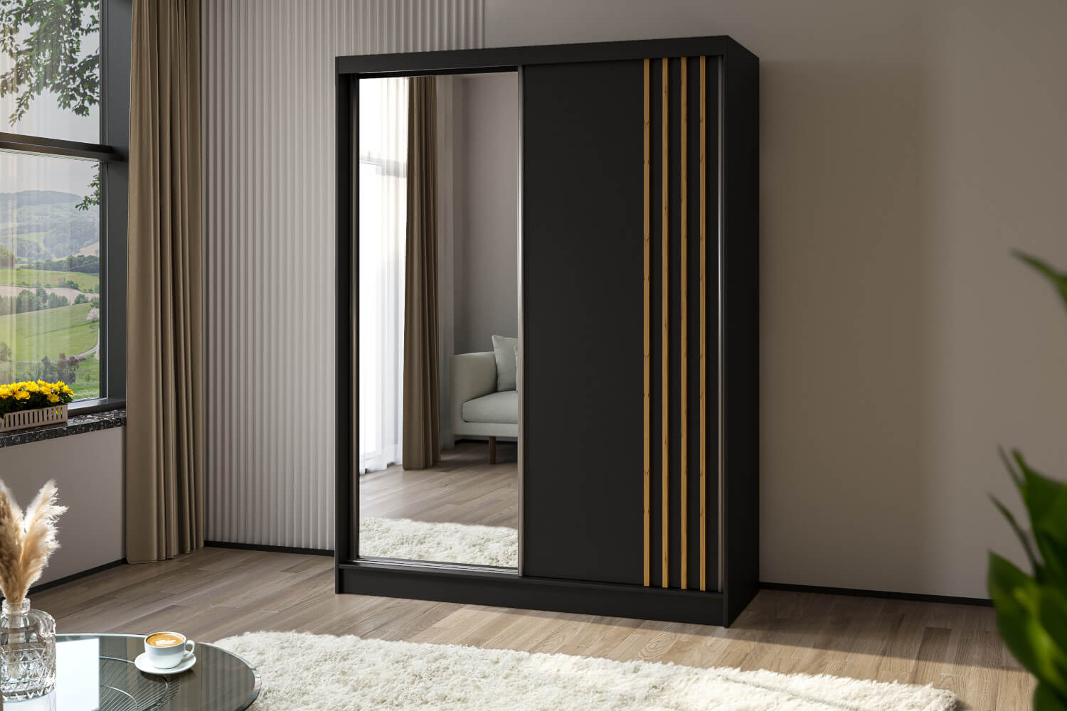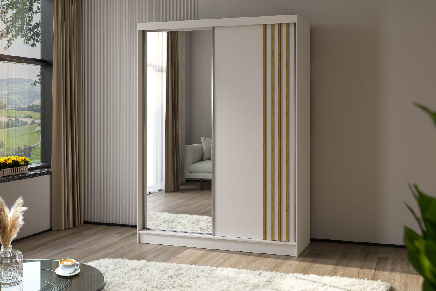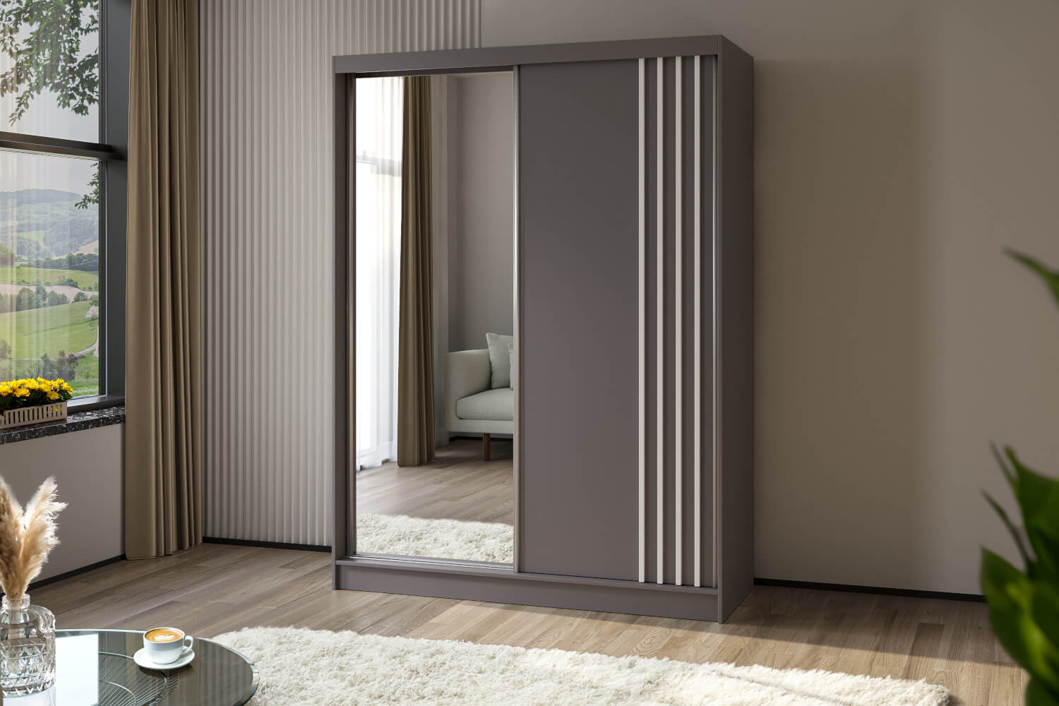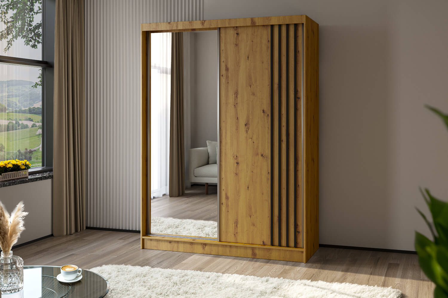 Front szafy zdobią lustrzane drzwi wzbogacone ozdobnymi lamelami, które nadają jej nowoczesnego charakteru. Model ten wykonano z solidnej płyty laminowanej o grubości 16 mm. Szafa jest nie tylko estetyczna, ale również trwała i stabilna. Jej wnętrze zostało zaprojektowane z myślą o optymalnym wykorzystaniu przestrzeni. Znajdziesz w nim funkcjonalne półki oraz drążki na ubrania, które pomogą Ci zorganizować swoją garderobę w sposób przemyślany i wygodny. Szafa jest dostępna w czterech różnych odcieniach, co daje Ci możliwość stworzenia kompozycji pasującej do Twojego wnętrza.