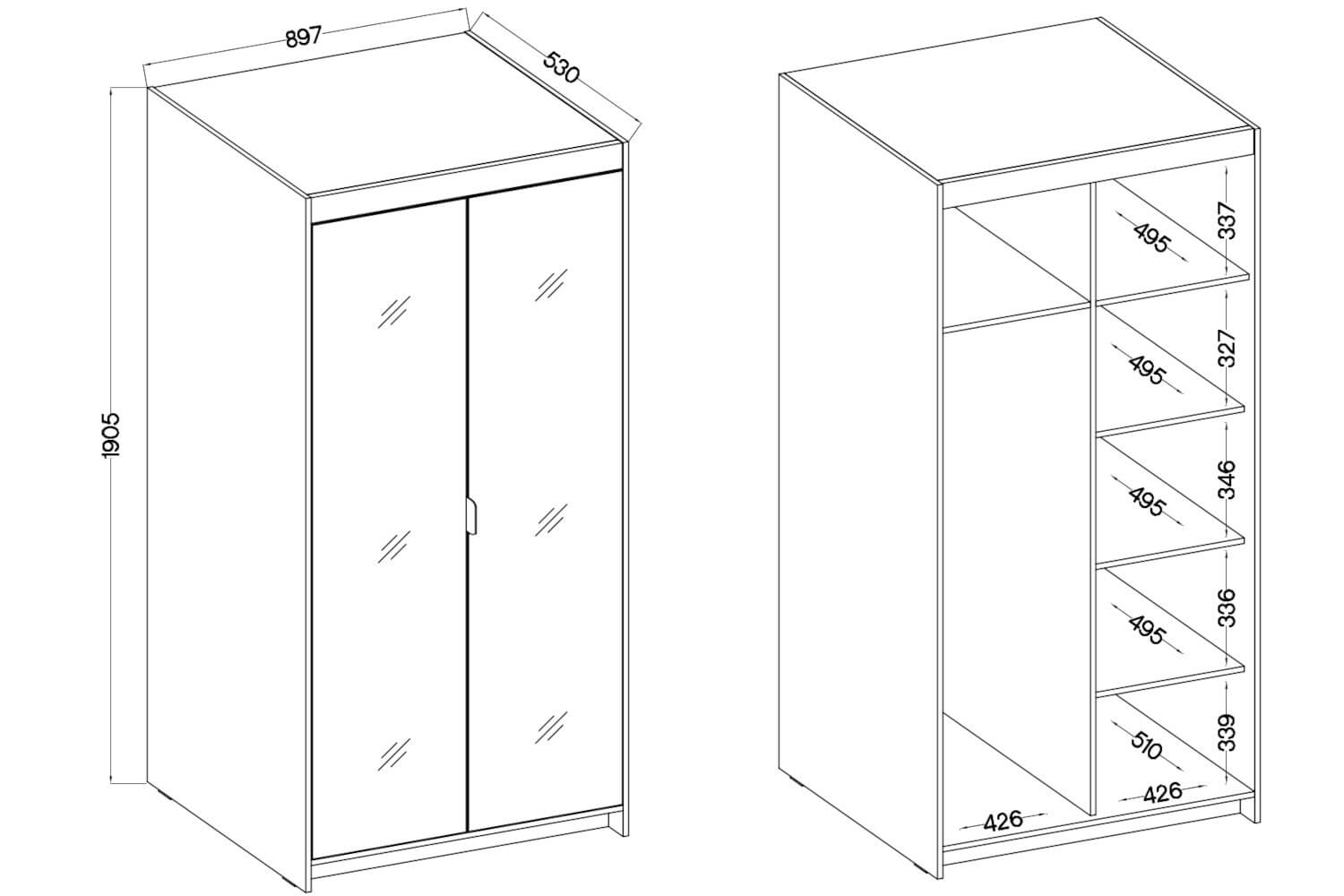 We wnętrzu znajdują się pojemne półki oraz drążek co pozwala na wygodne przechowywanie zarówno ubrań, jak i dodatków. Dwudrzwiowa nadstawka wyposażona została w półkę, która oferuje dodatkowe miejsce do przechowywania sezonowych rzeczy czy akcesoriów.