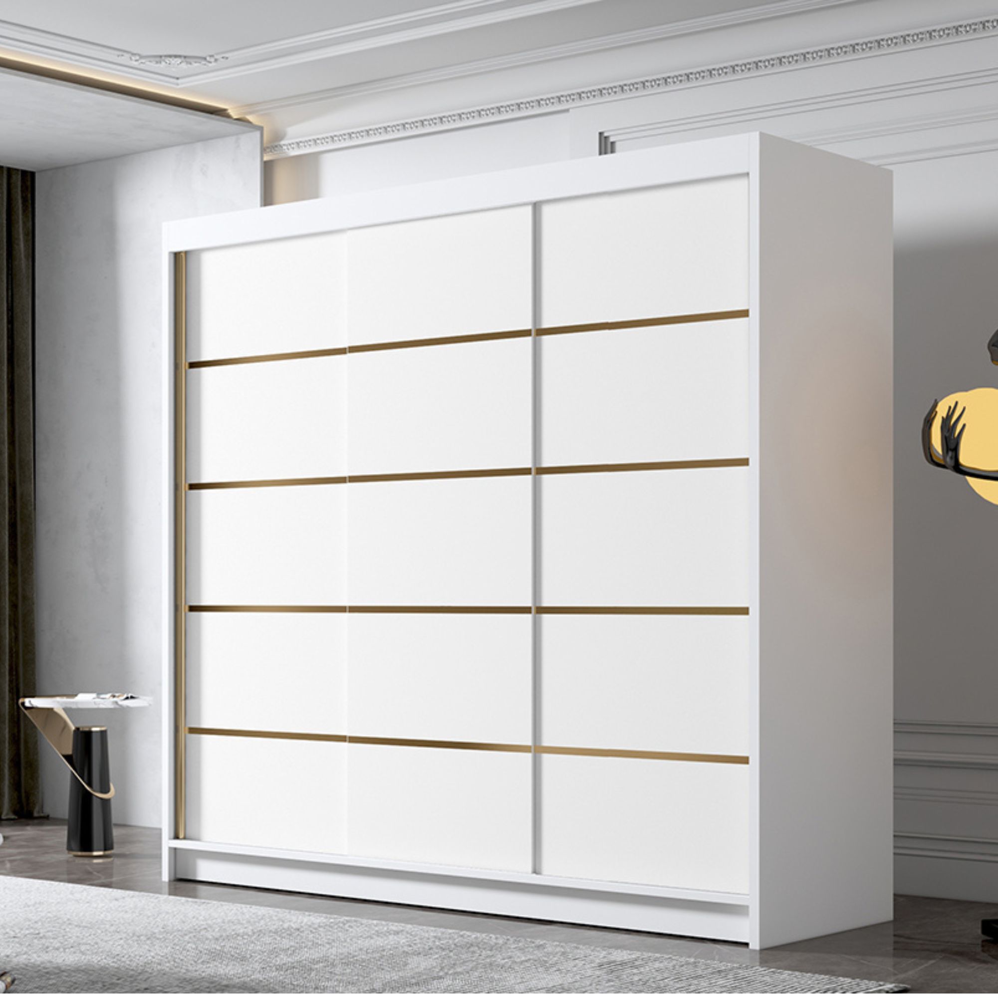 Szafa z lustrem DAVO to wyważone połączenie nowoczesnej formy i detalu, stworzone z myślą o stylowych, funkcjonalnych wnętrzach. Przesuwne fronty w białym, matowym wykończeniu, zostały przełamane delikatnymi, złotymi szprosami, które dodają całości elegancji i subtelnego blasku.