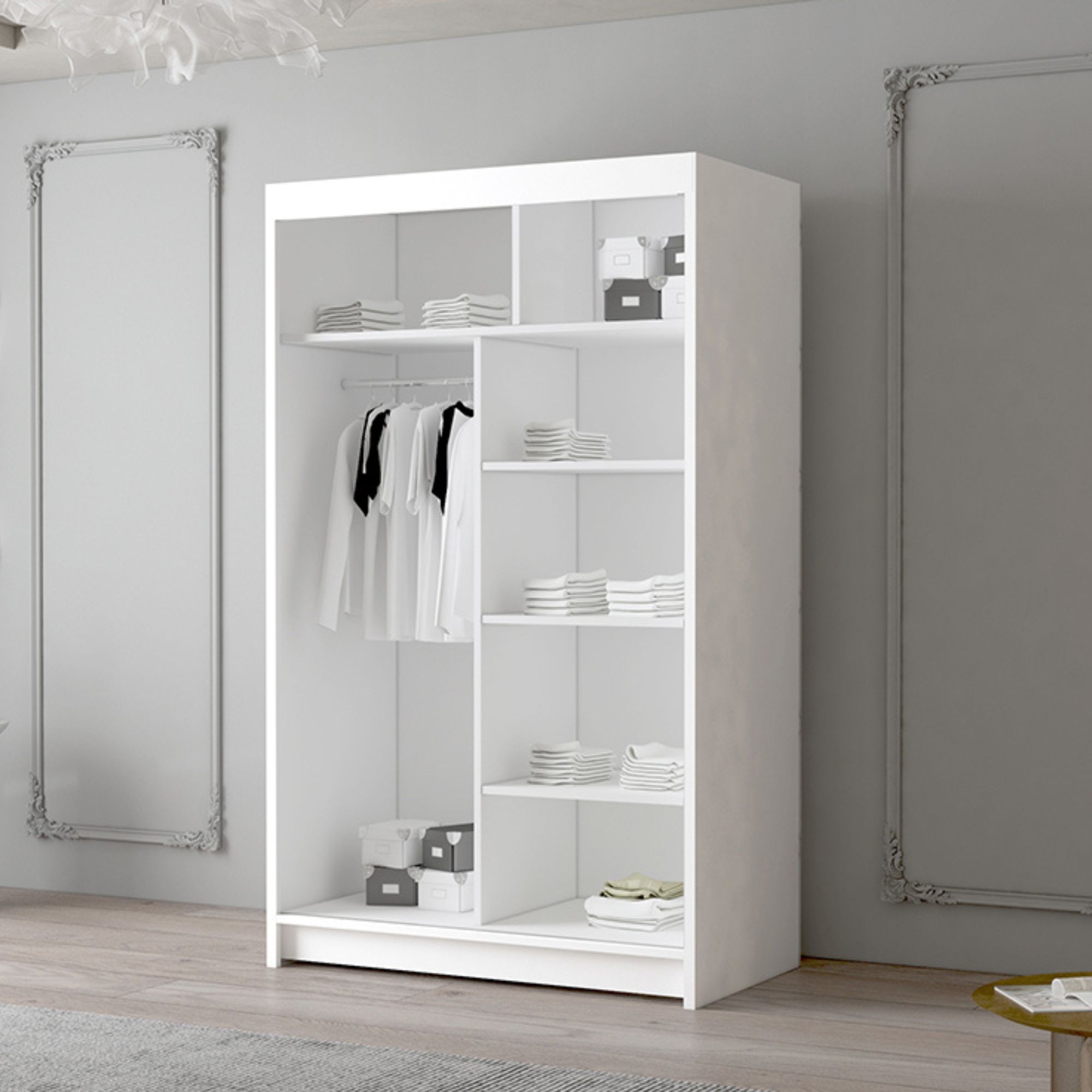 W środku znajduje się funkcjonalny układ półek oraz drążek na wieszaki, co pozwala na przechowywanie zarówno odzieży codziennej, jak i bardziej sezonowych elementów garderoby. Przemyślane rozplanowanie przestrzeni wewnętrznej sprawia, że łatwo utrzymać porządek i szybko znaleźć potrzebne rzeczy.