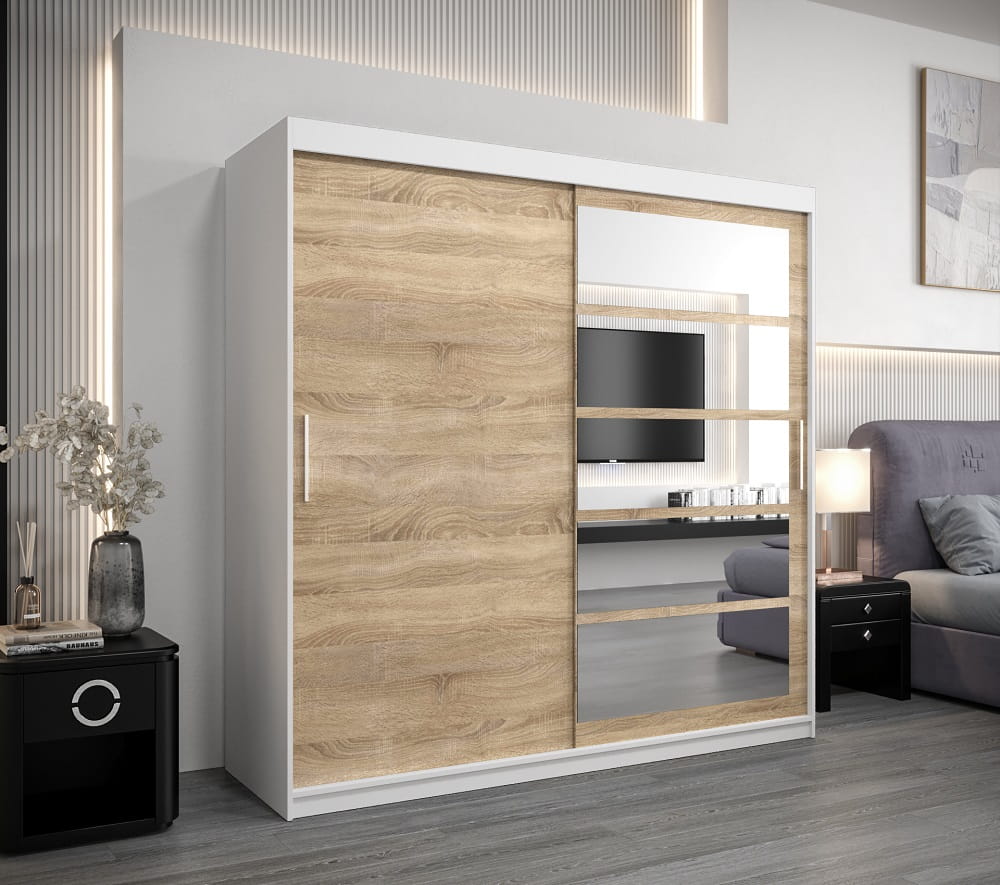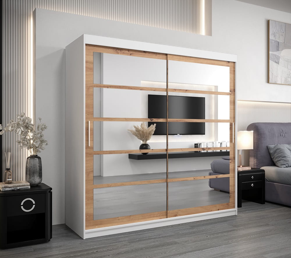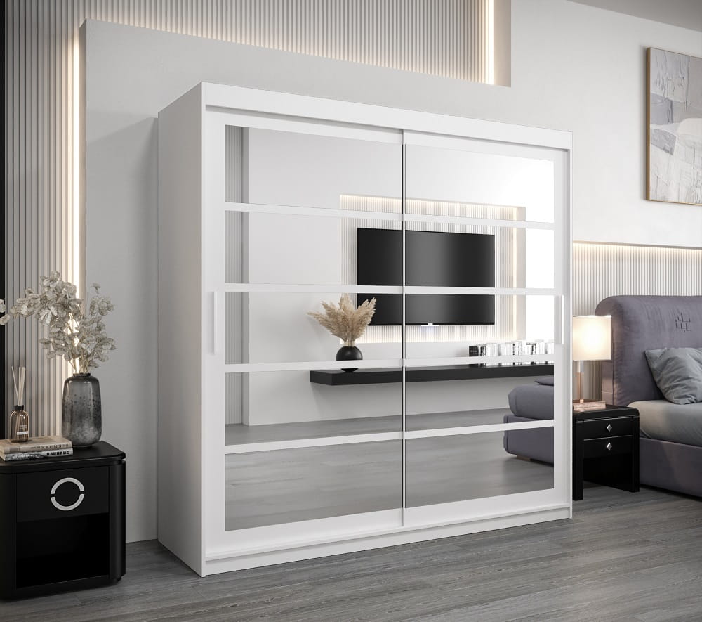 Szafa z lustrem 200 cm RAMO została wykonana z najlepszej jakości materiałów, w trosce o jak największy komfort użytkowania. W jej wnętrzu znajdziesz aż dziesięć pojemnych półek oraz dwa poziomy drążków do wieszania ubrań.