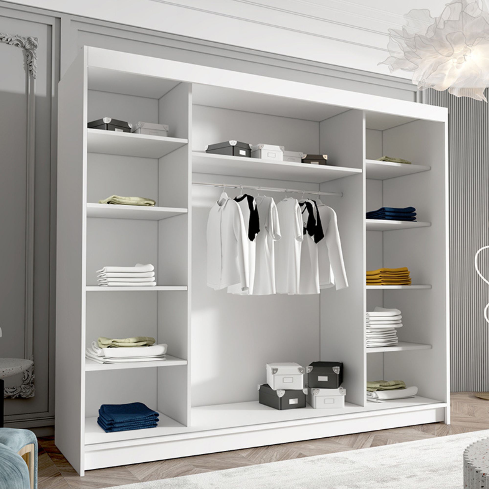 Wnętrze szafy DIAVO zaprojektowano z myślą o maksymalnym wykorzystaniu przestrzeni. Liczne półki, drążki na ubrania oraz opcjonalne szuflady pozwalają na zachowanie porządku i organizacji garderoby. Przemyślany układ wnętrza umożliwia przechowywanie zarówno odzieży codziennej, jak i sezonowej. Dodatkowo, przesuwne drzwi zapewniają łatwy dostęp do każdej części szafy bez potrzeby odsuwania mebli.