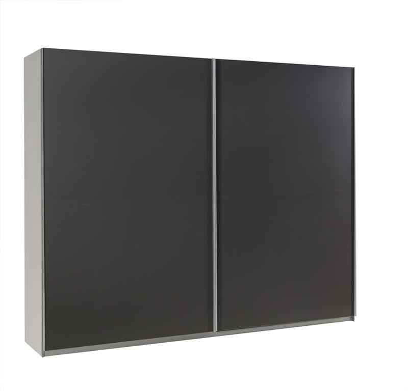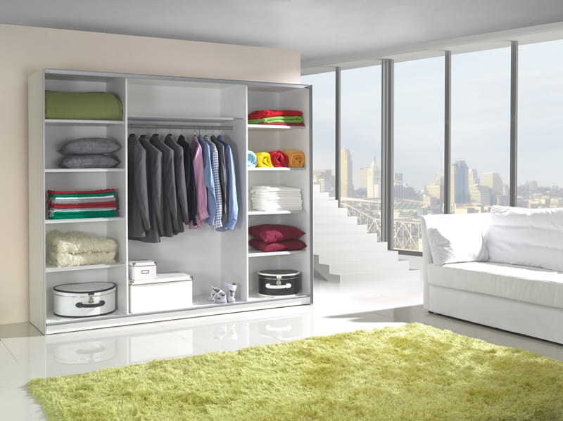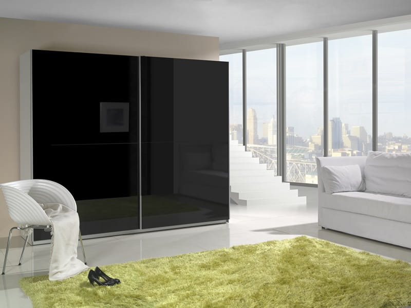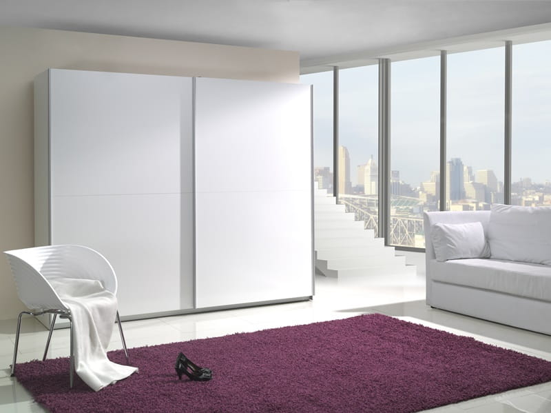 Szafa przesuwna FUX - zarówno fronty jak i korpus szafy zostały wykonane z płyty o grubości 16 mm, dodatkowo fronty zostały wykończone powłoką na wysoki połysk. Korpus wykonany jest w kolorze białym. Drzwi przesuwne są montowane na prowadnicach aluminiowych.